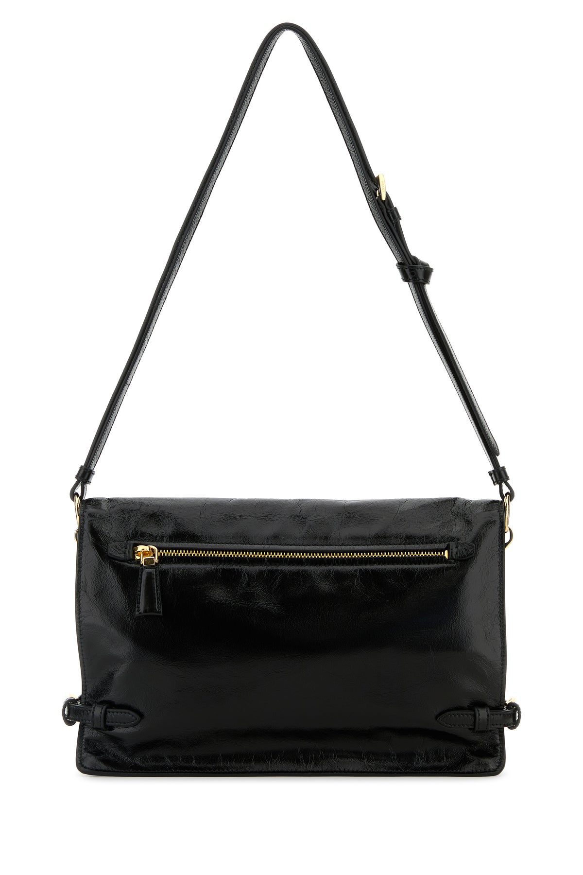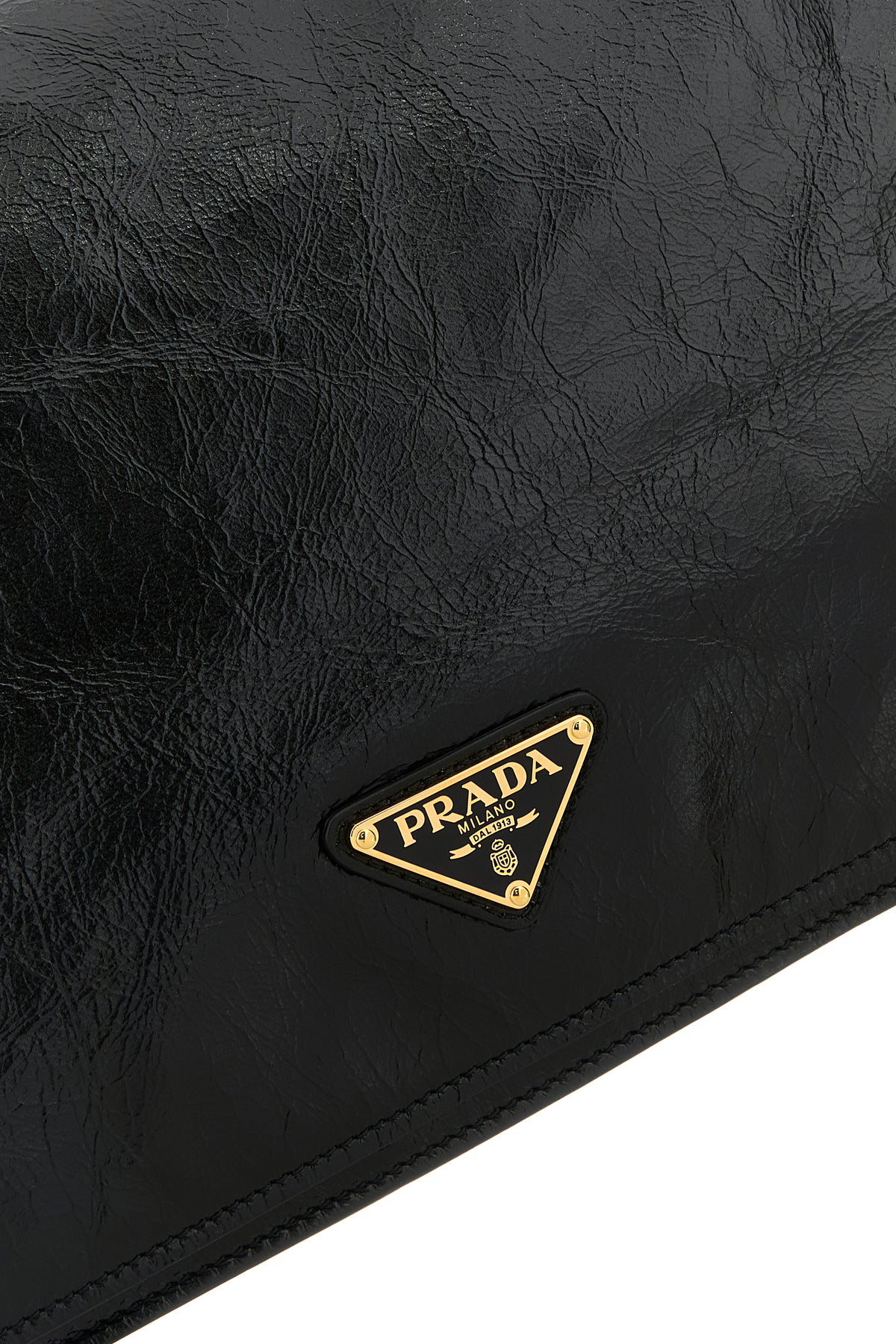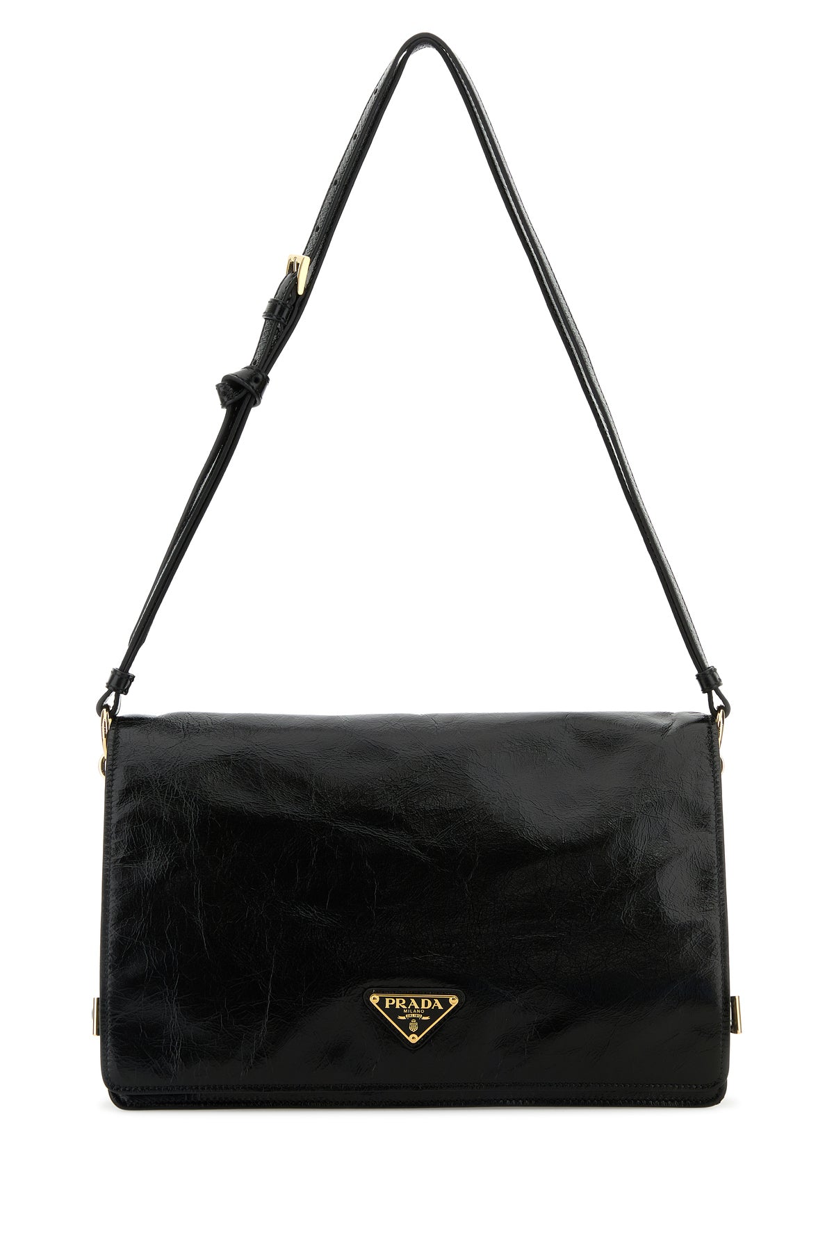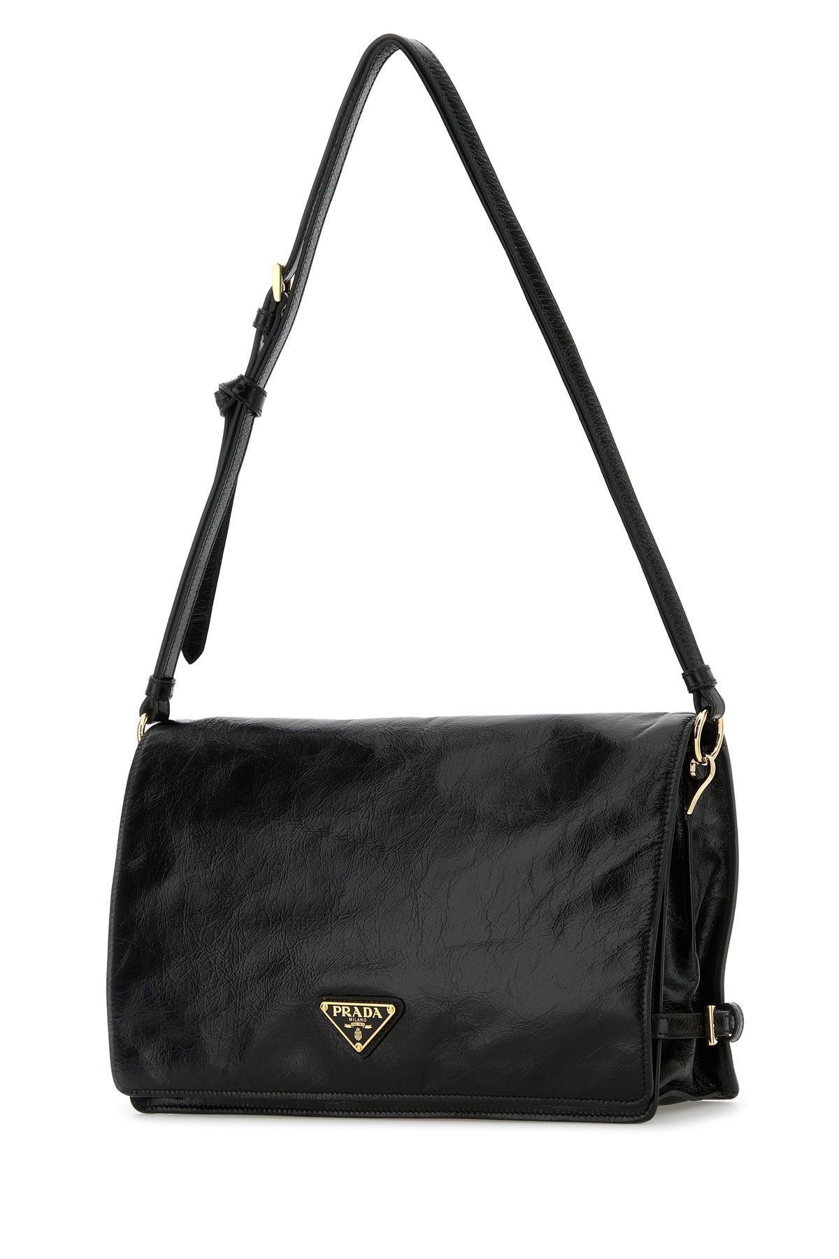 Borsa a spalla realizzata in pelle ad effetto stropicciato arricchita da iconico triangolo metallico logato sulla parte frontale.