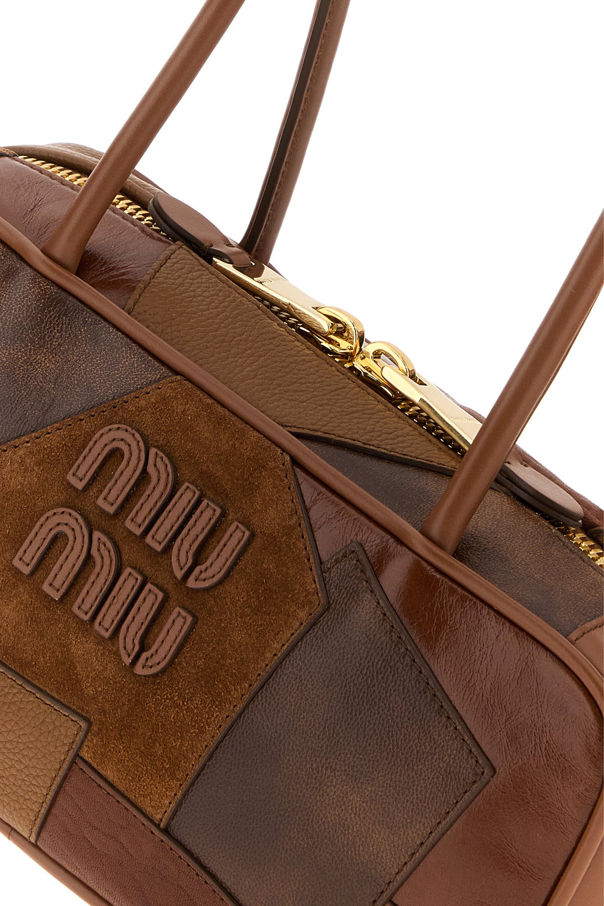 Borsa a spalla realizzata in pelle liscia, pelle ad effetto vintage e pelle scamosciata arricchita da applicazione logata sulla parte frontale.