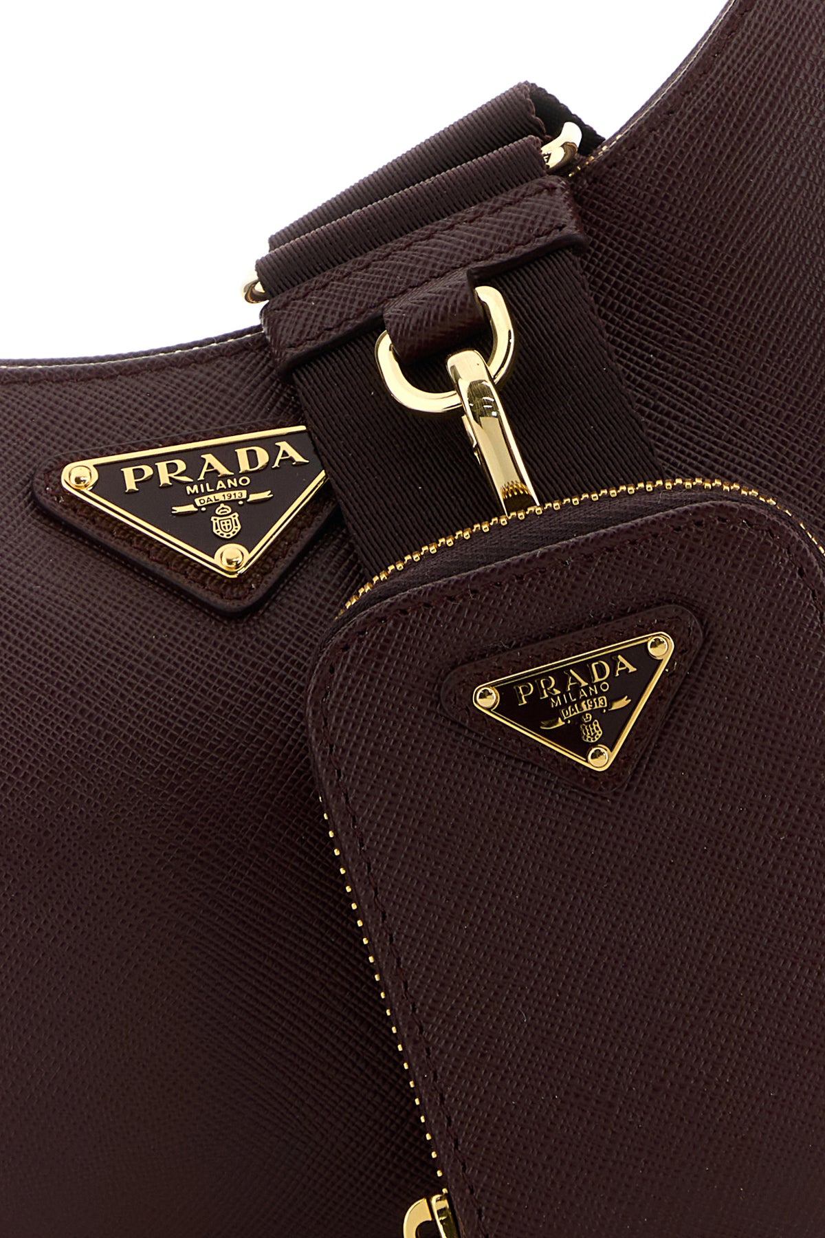 Borsa a spalla realizzata in pelle Saffiano arricchita da iconico triangolo logato sulla parte frontale e accessorio amovibile in pelle tonale con anello portachiavi.