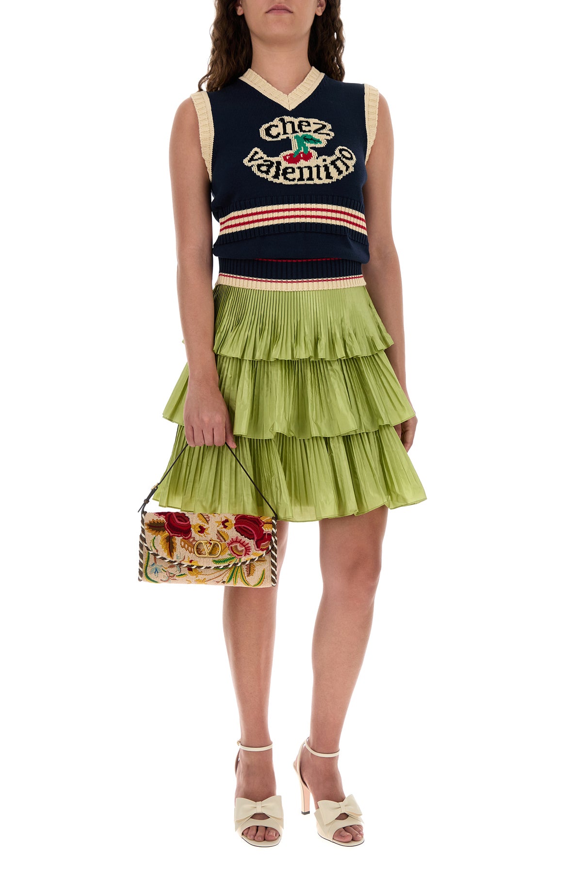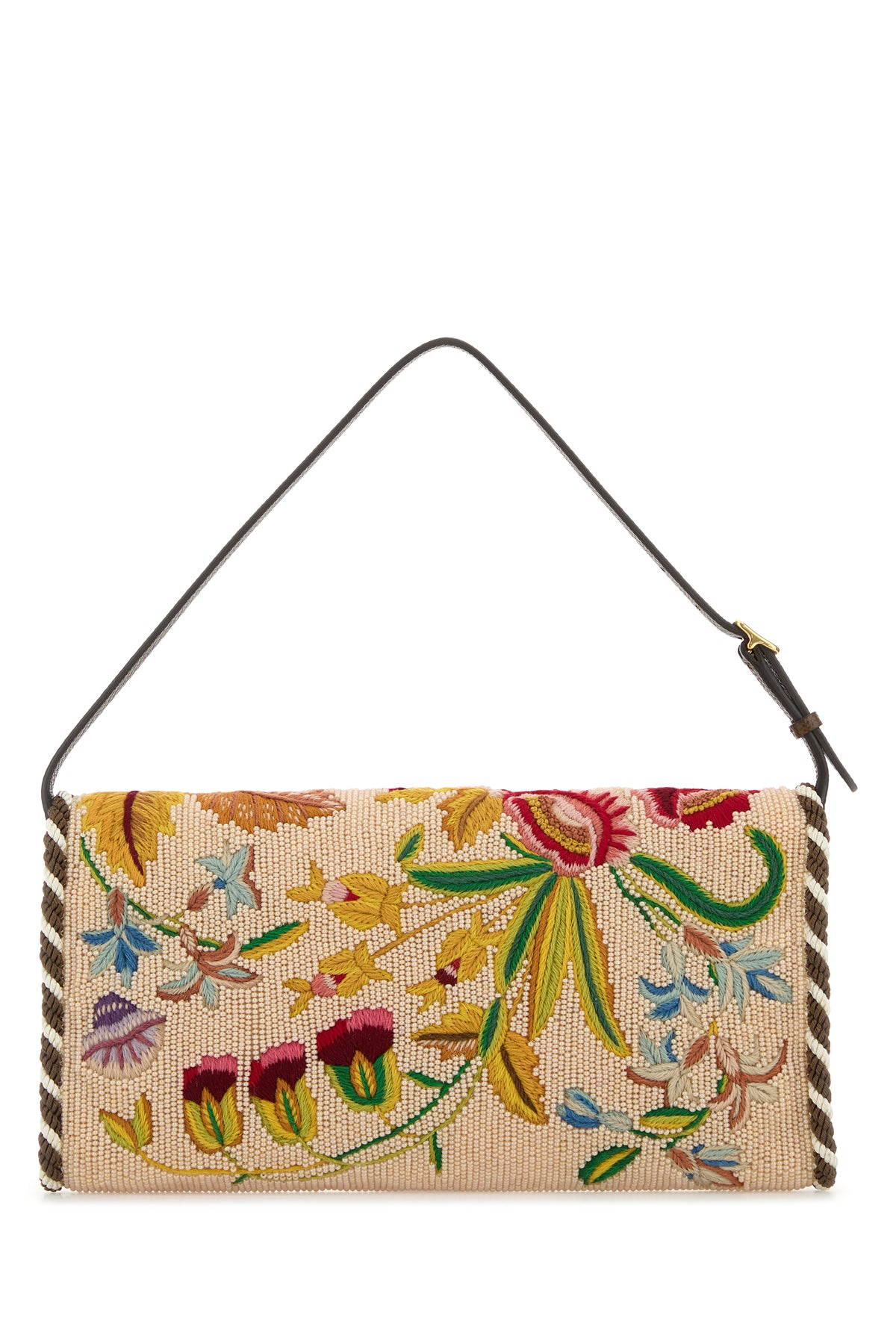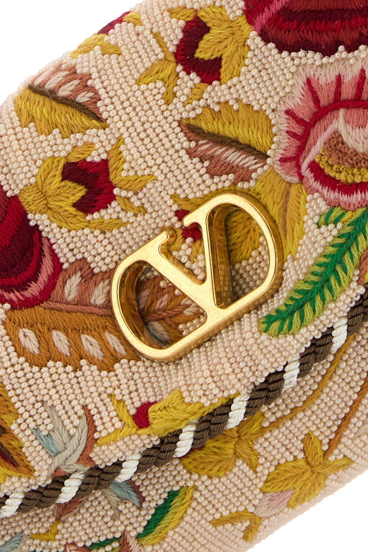 Borsa a spalla realizzata in tessuto interamente ricoperto da perline caratterizzata da ricamo floreale su tutta la superficie arricchito da dettaglio VLogo sulla patta.