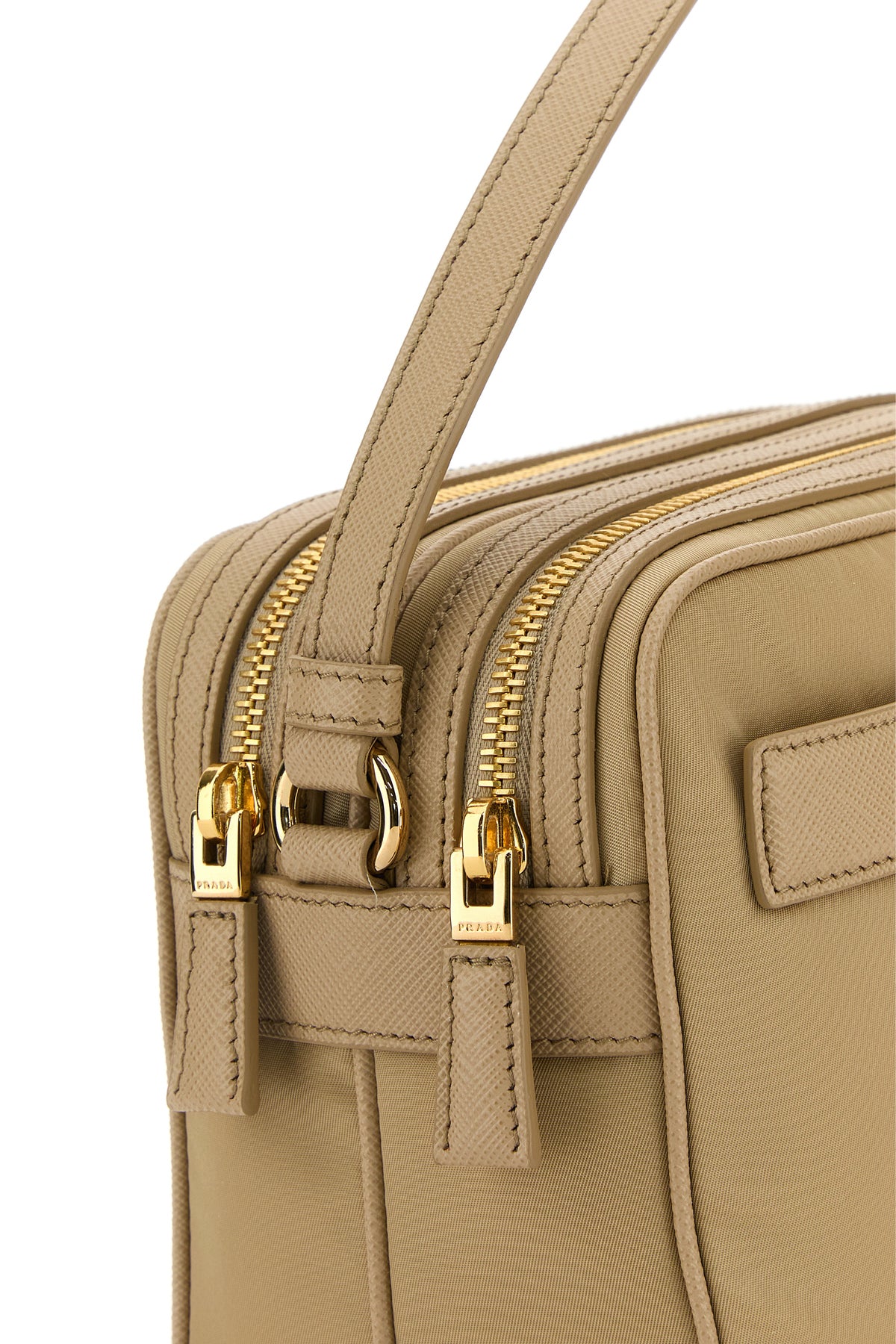 Borsa a tracolla realizzata in Re-Nylon arricchita da iconico triangolo metallico logato sulla parte frontale.