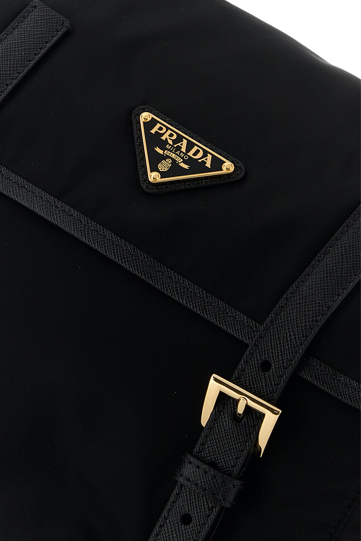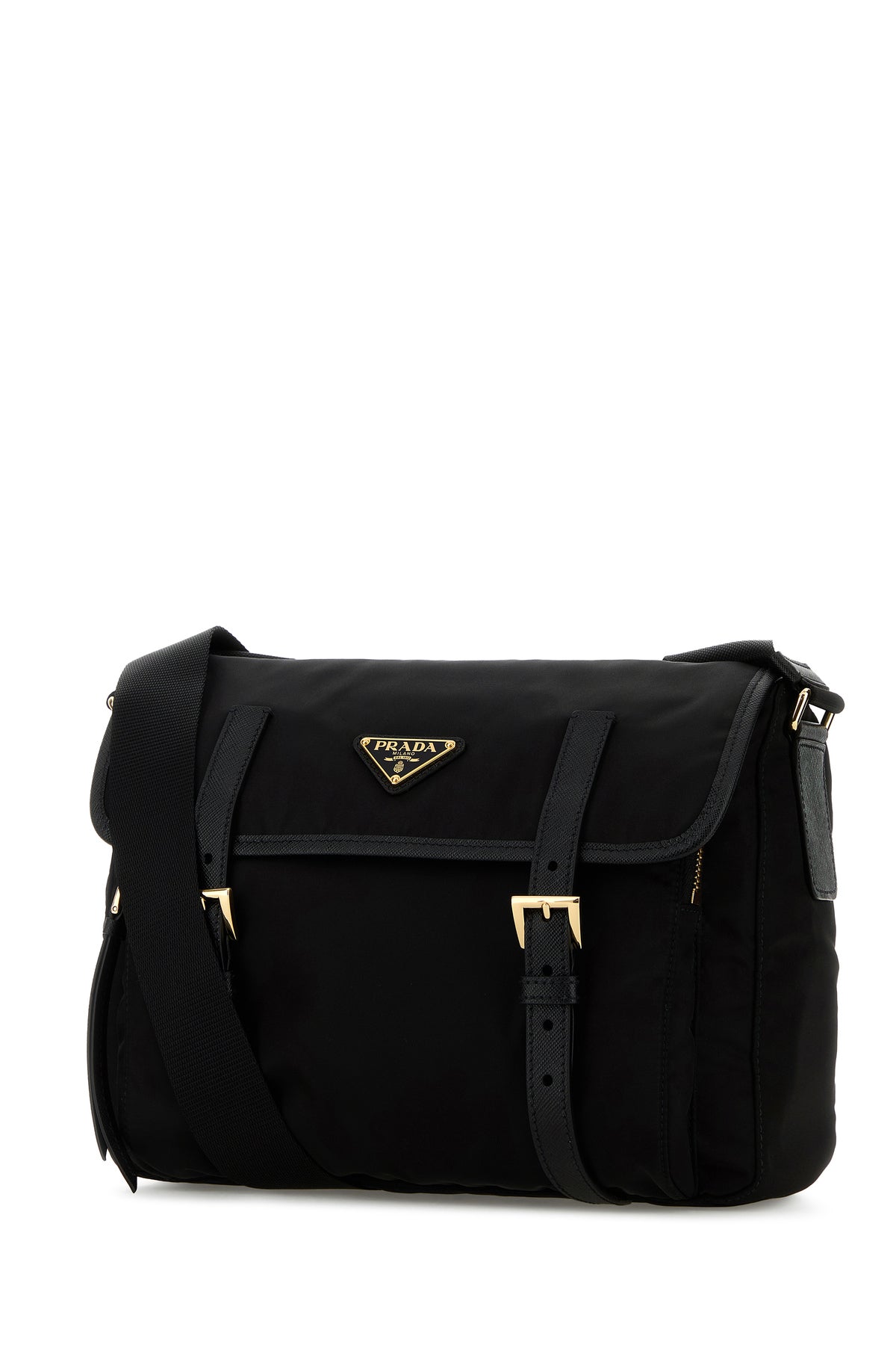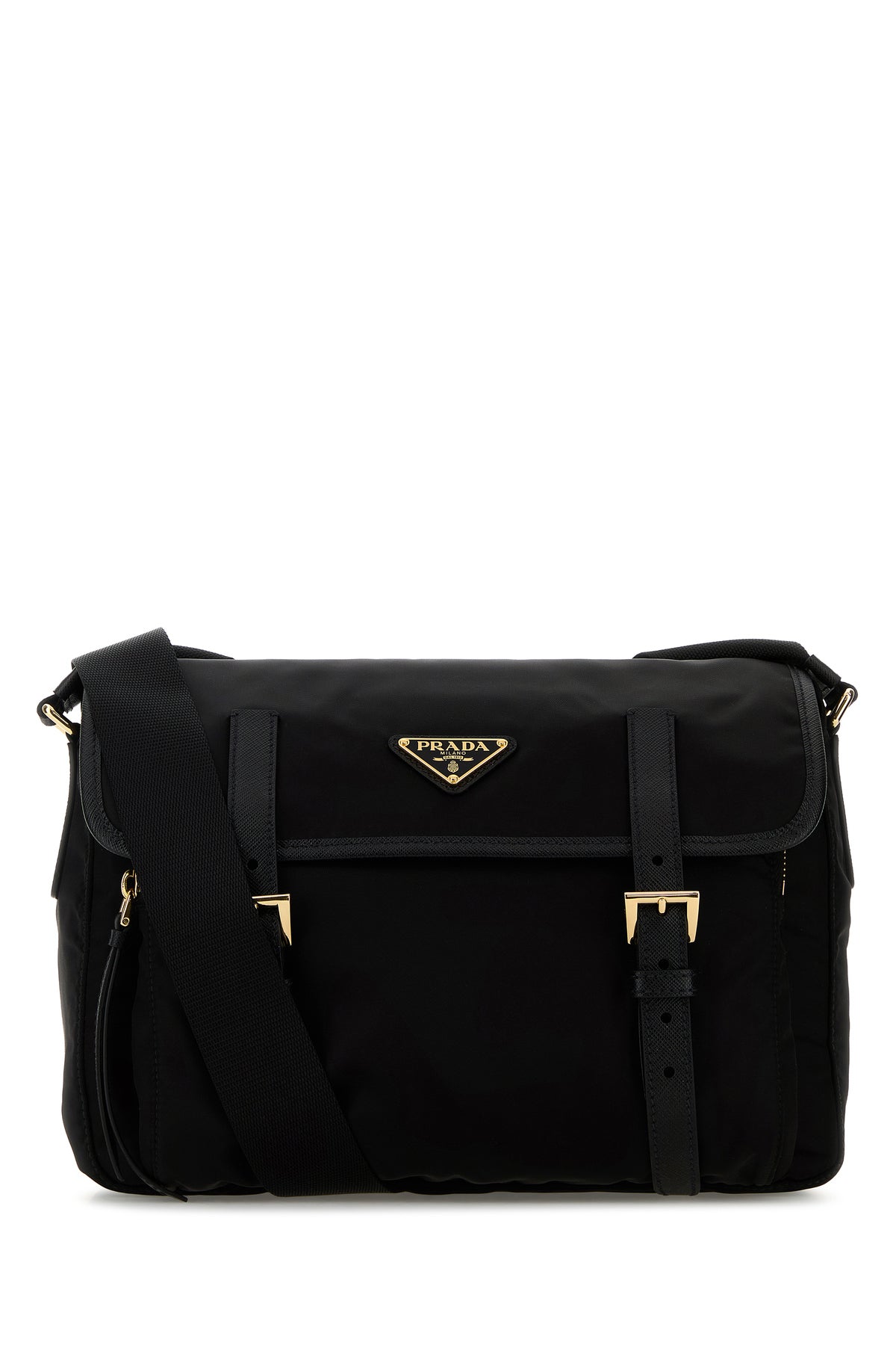 Borsa a tracolla realizzata in tela arricchita da iconico triangolo metallico logato sulla parte frontale.