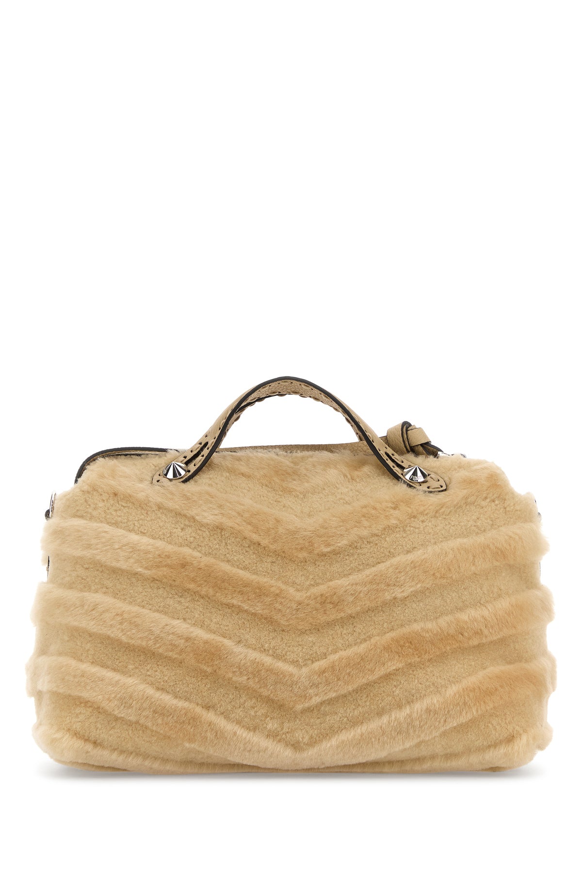 Borsa a mano realizzata in montone arricchita da accessorio portachiavi amovibile in pelle on logo in lettere metalliche.