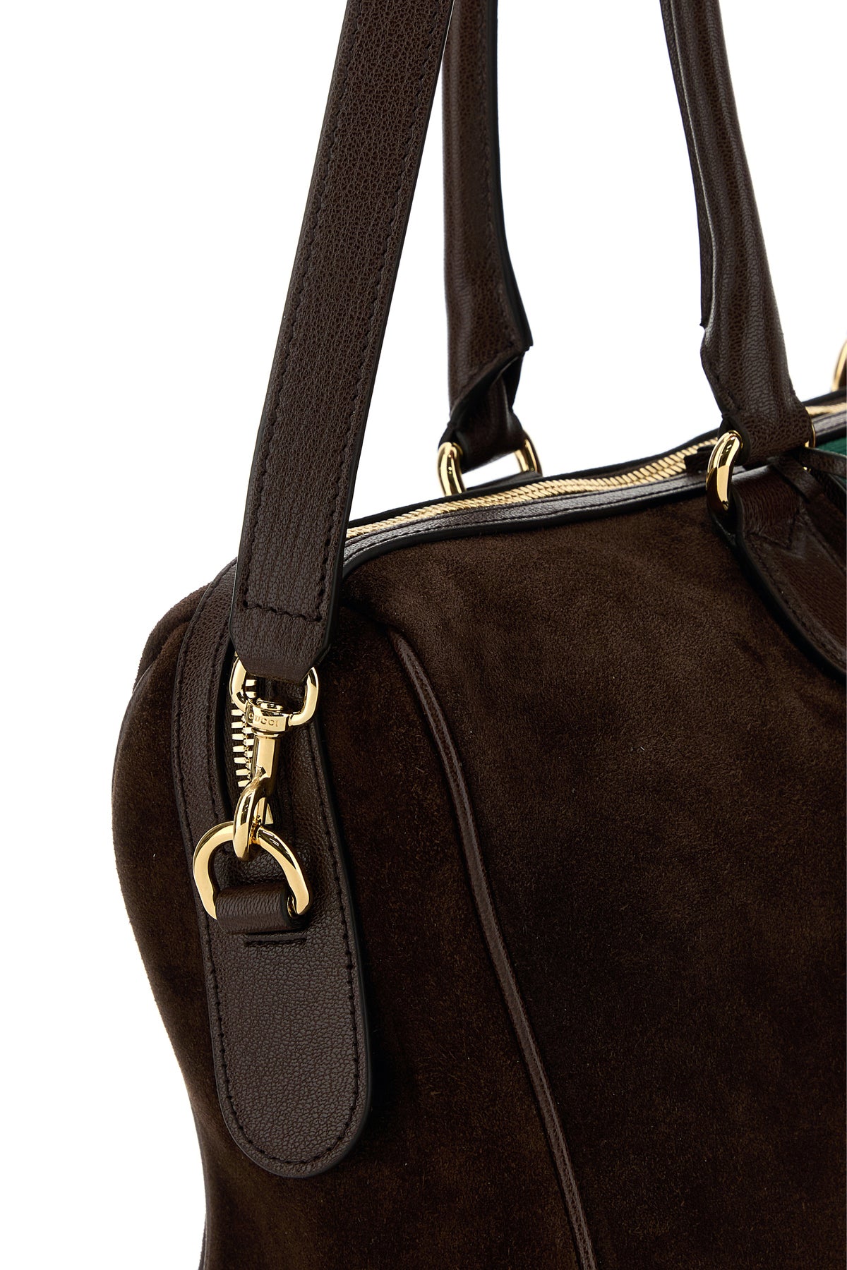 Borsa shopping realizzata in pelle scamosciata arricchita da applicazione Nastro Web e dettaglio metallico Morsetto.