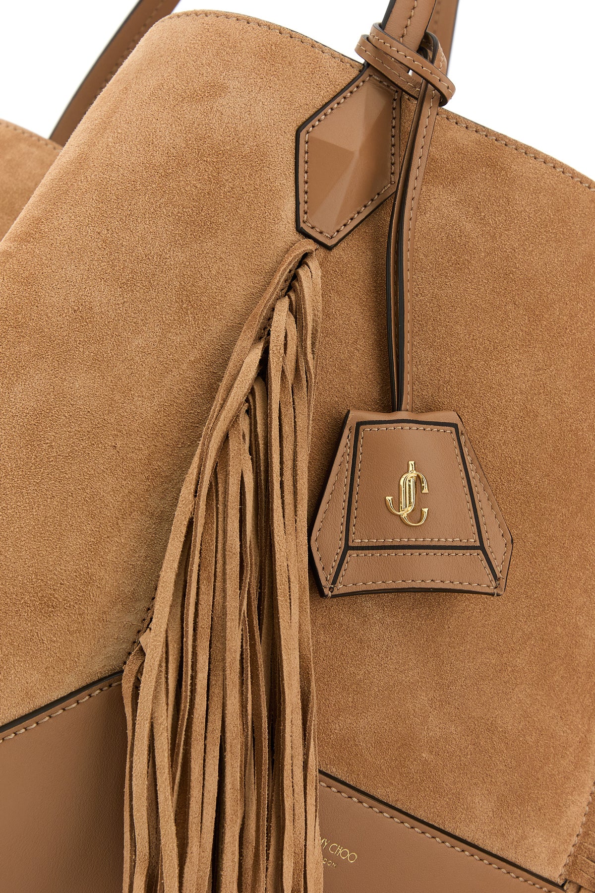 Borsa shopping realizzata in pelle scamosciata con inserto in pelle liscia tonale sul fondo caratterizzata da logo stampato laminato sulla parte frontale arricchita da accessorio portachiavi amovibile in pelle tonale e metallo.