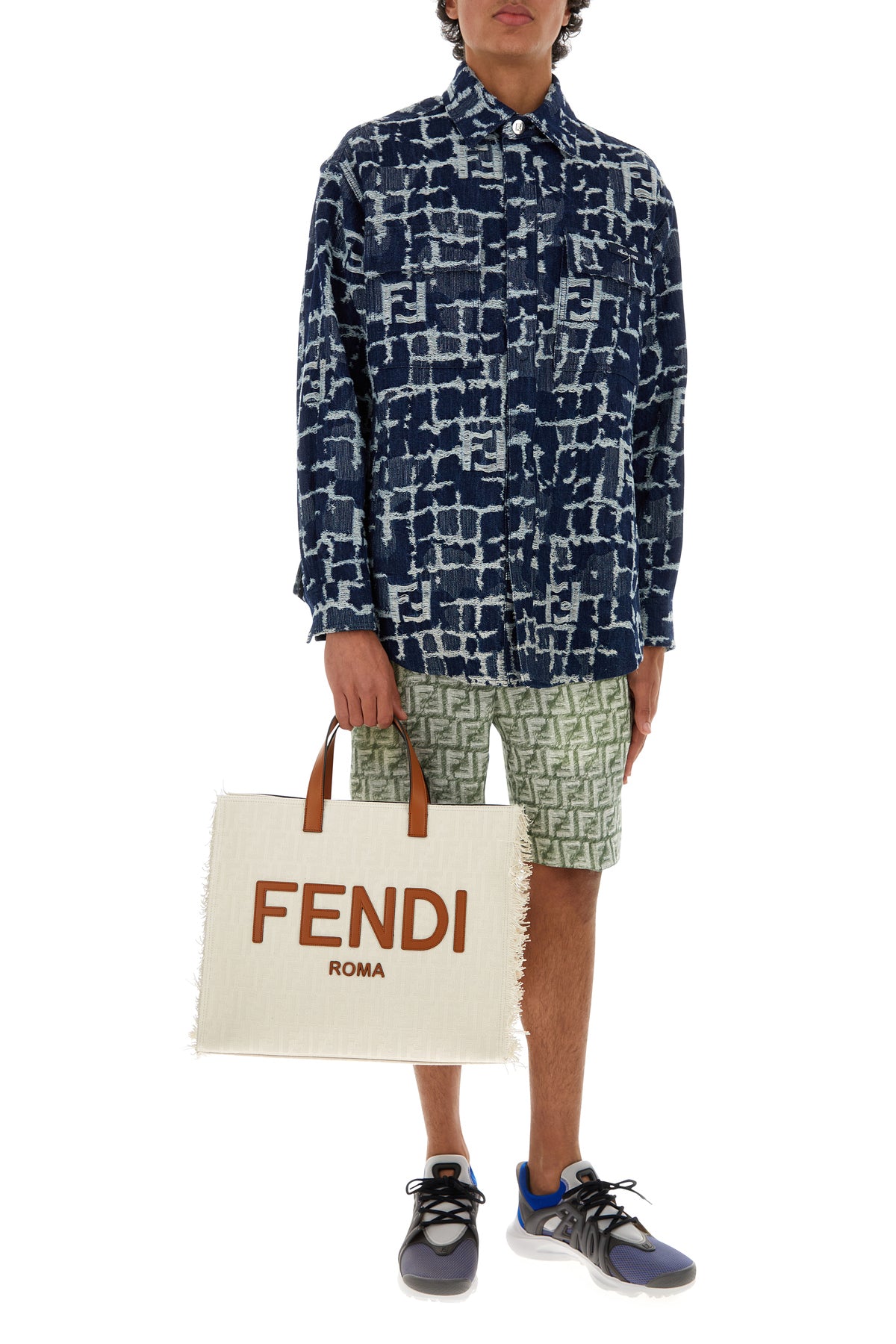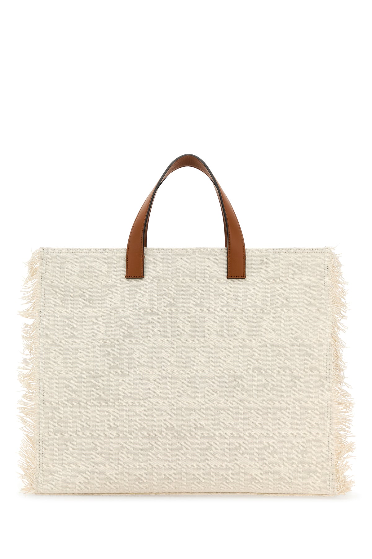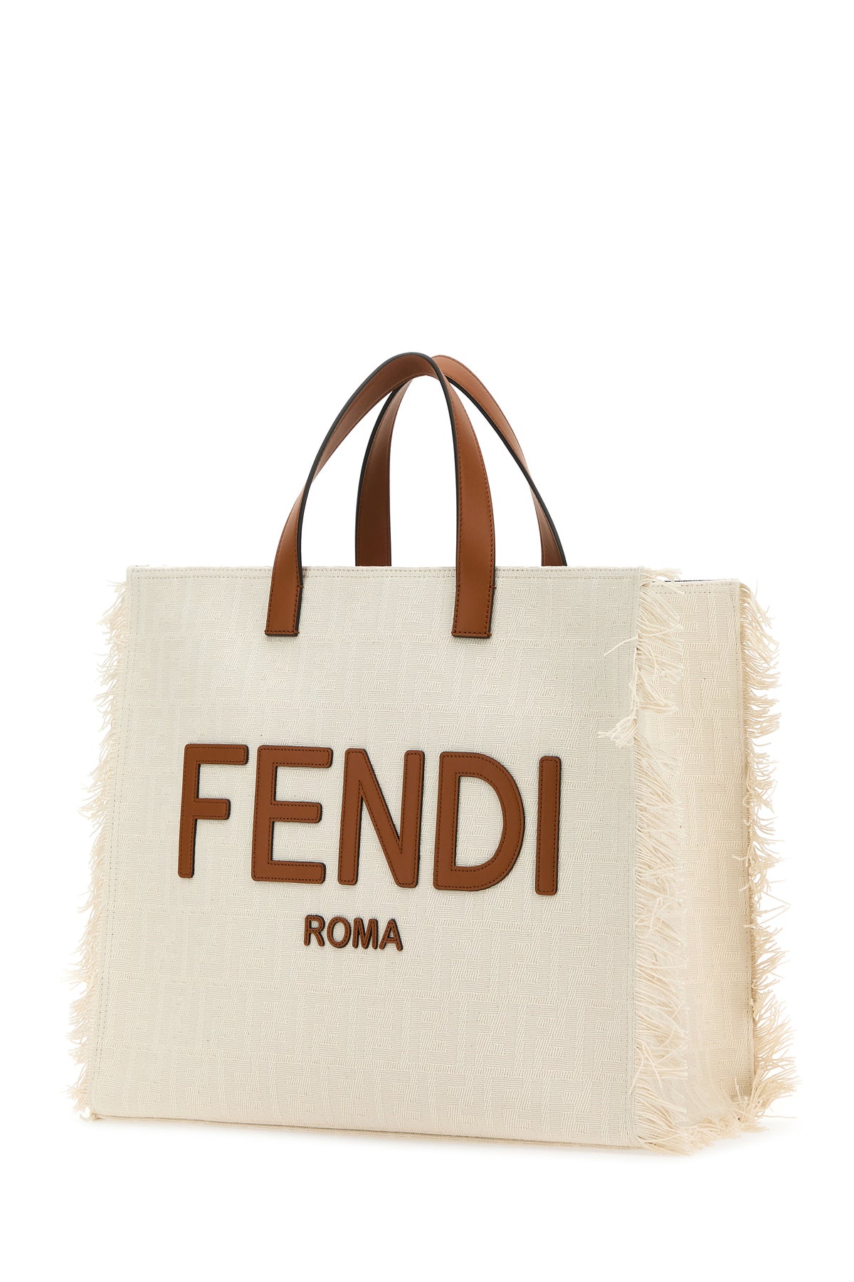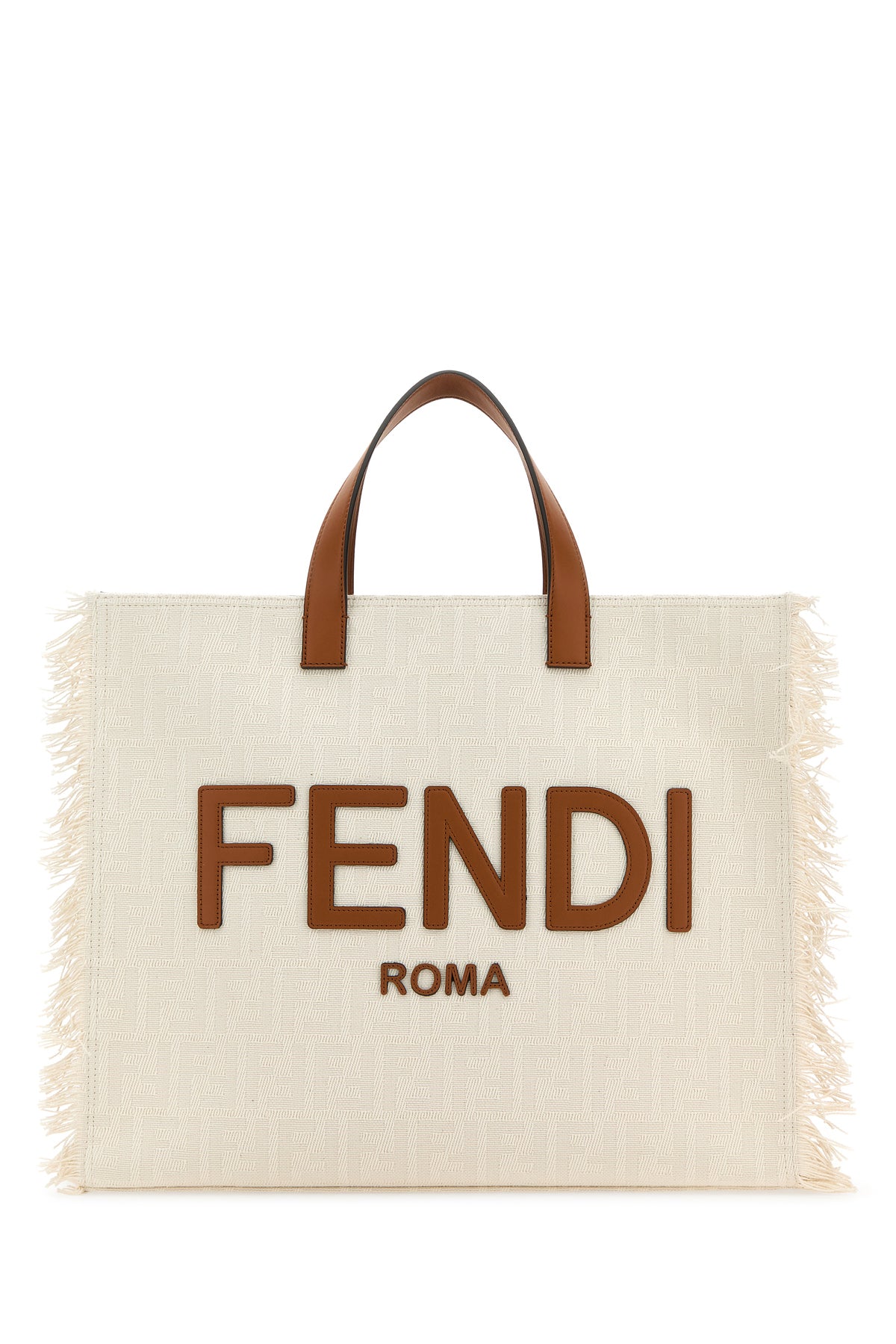 Borsa shopping realizzata in jacquard con profilature sfrangiate caratterizzata da ricamo a motivo FF tonale su tutta la superficie arricchita da applicazione Fendi Roma in pelle sulla parte frontale.