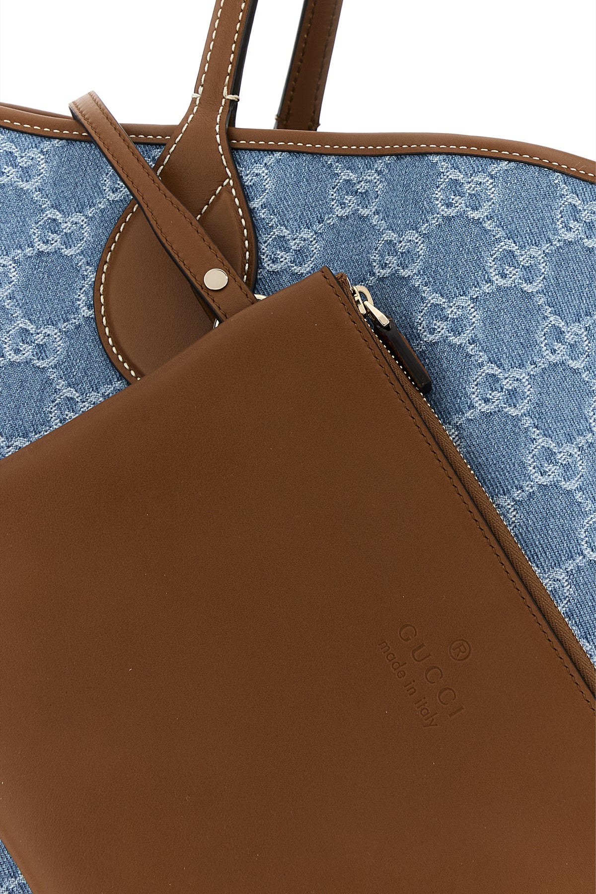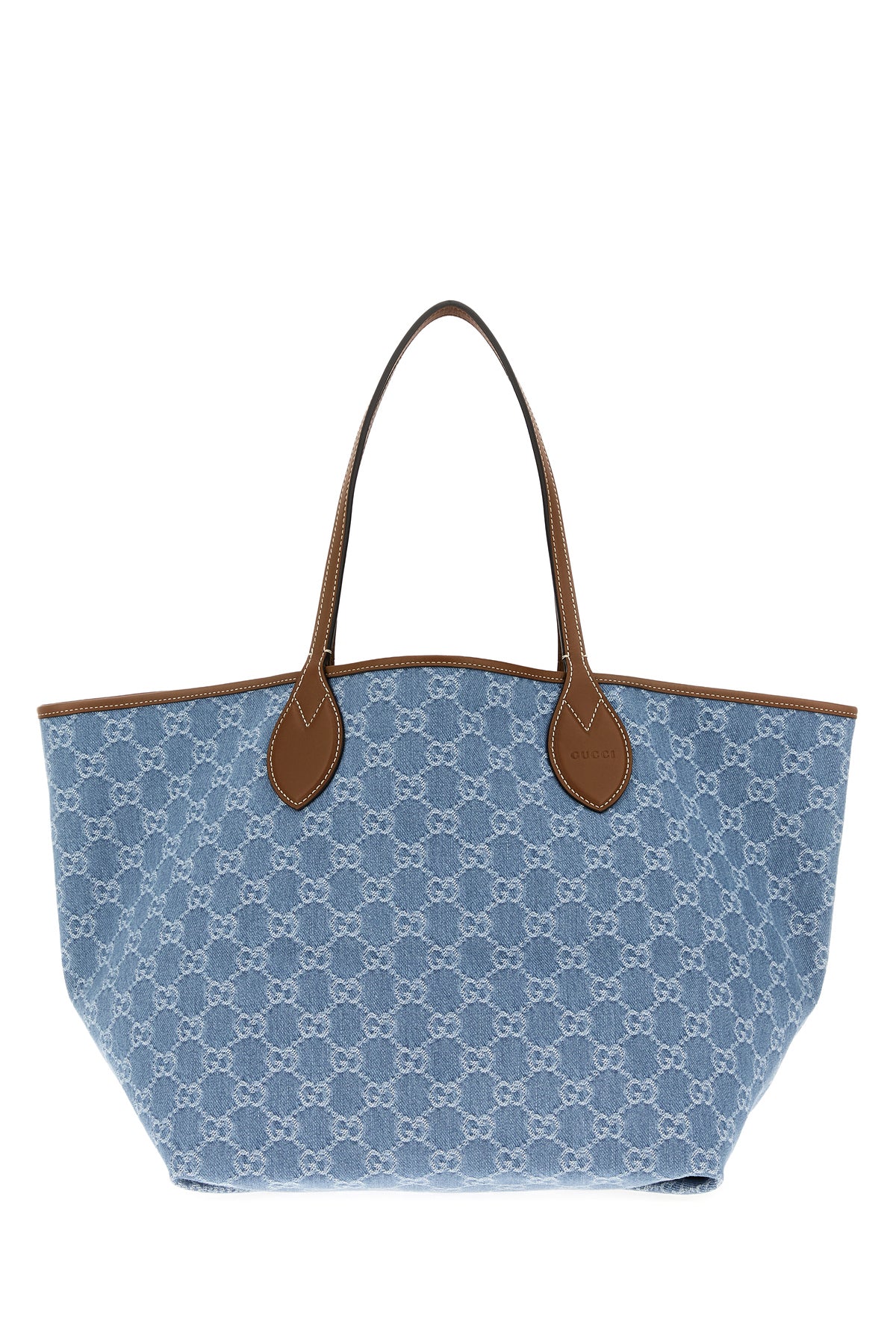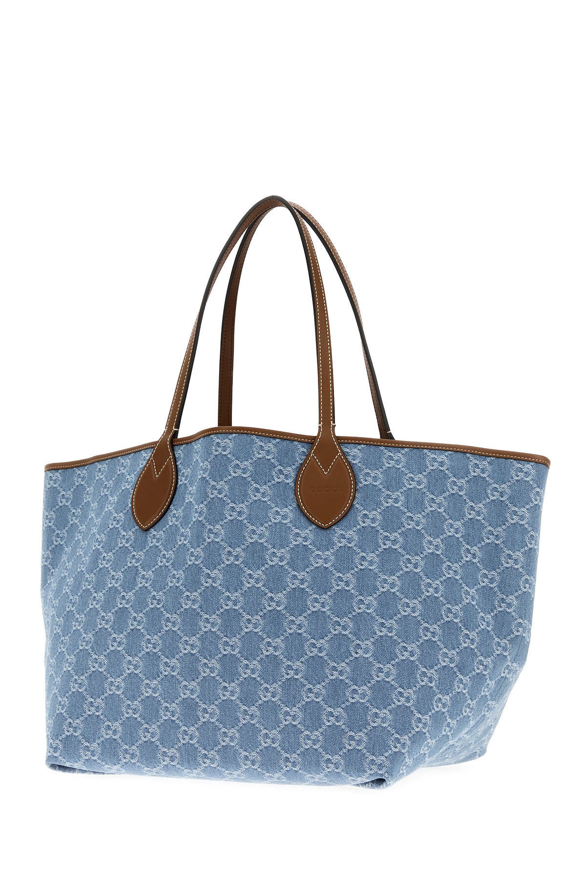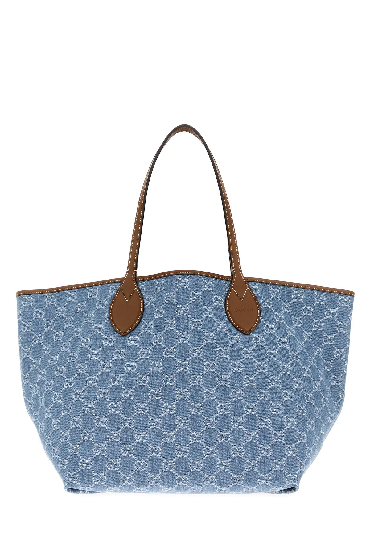 Borsa shopping realizzata in denim GG con profilature in pelle caratterizzata da motivo Gucci impresso sulla parte frontale.