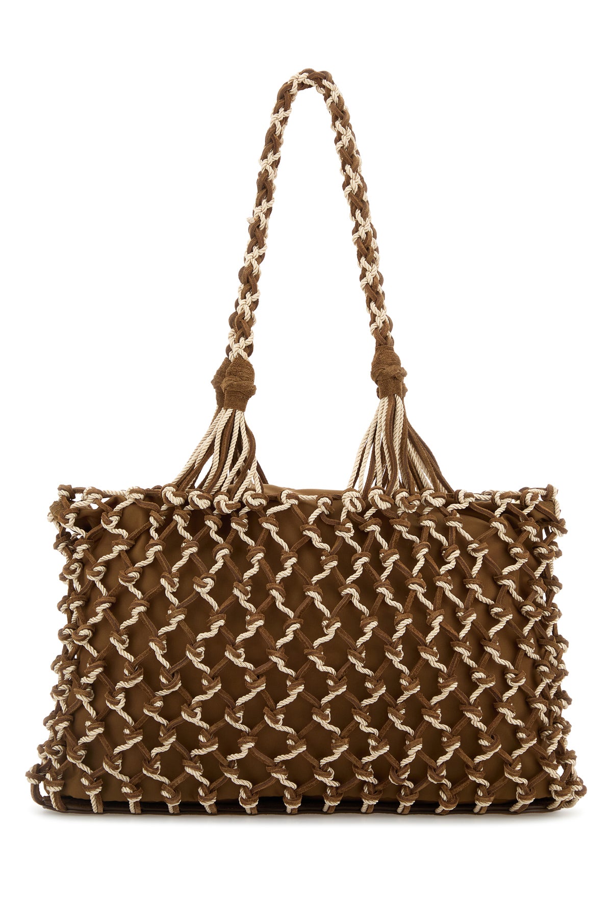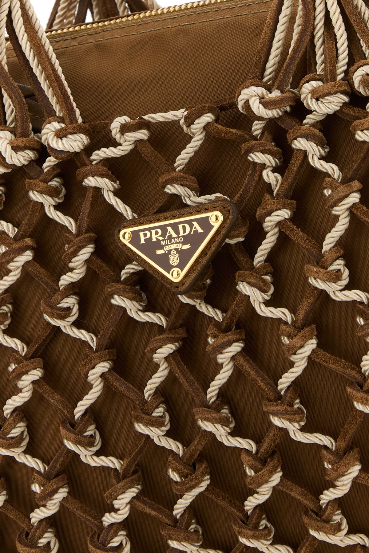 Borsa shopping realizzata in rete di pelle scamosciata e tessuto arricchita da iconico triangolo metallico logato sulla parte frontale.
