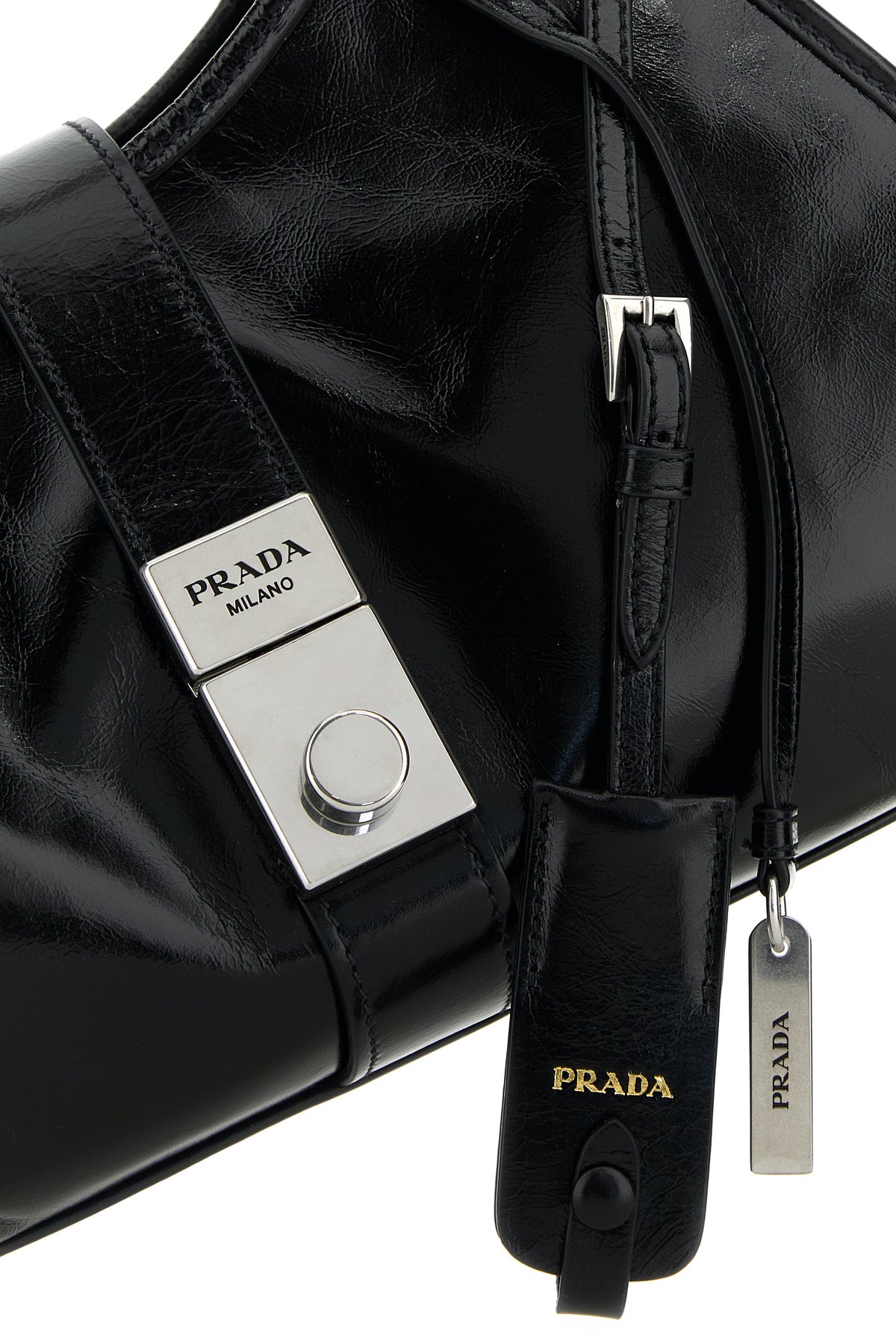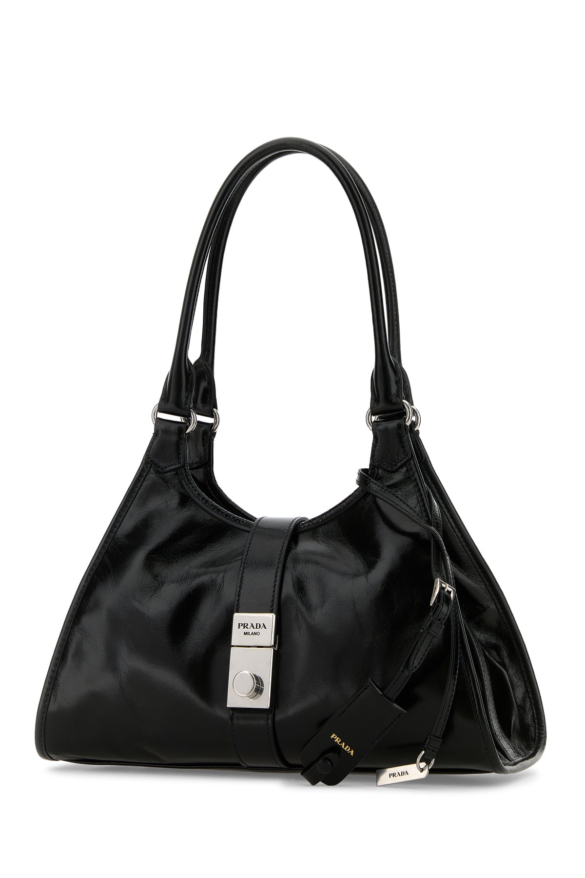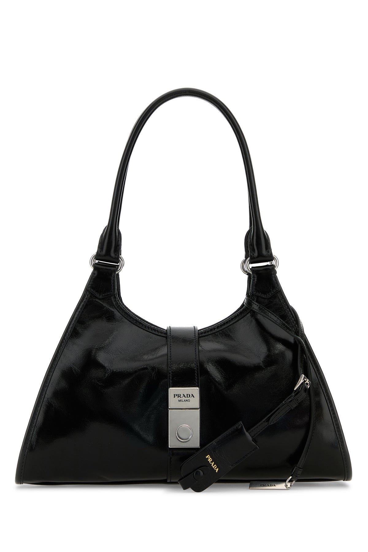 Borsa shopping realizzata in pelle di vitello dal finish lucido caratterizzata da logo impresso sulla parte frontale arricchita da accessorio amovibile in pelle con charm logato.