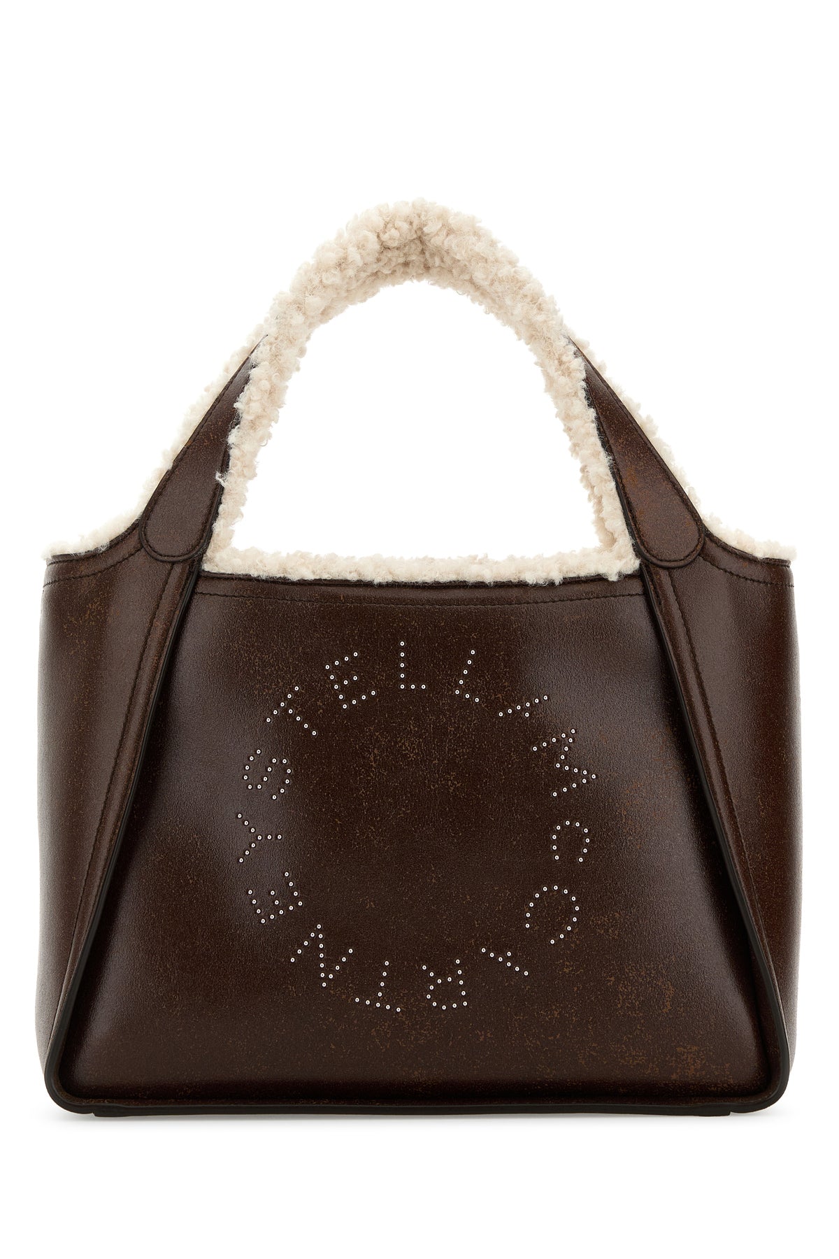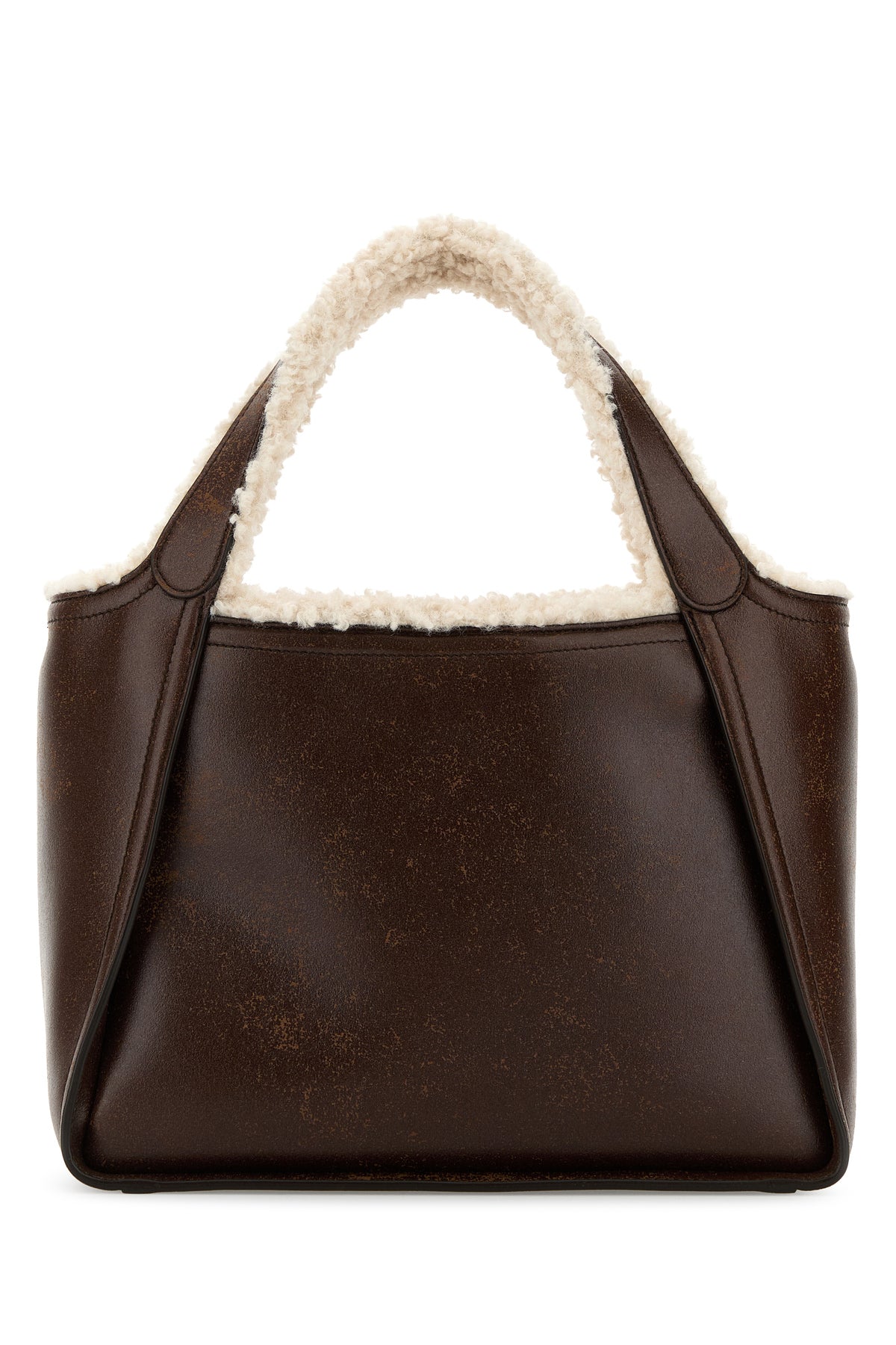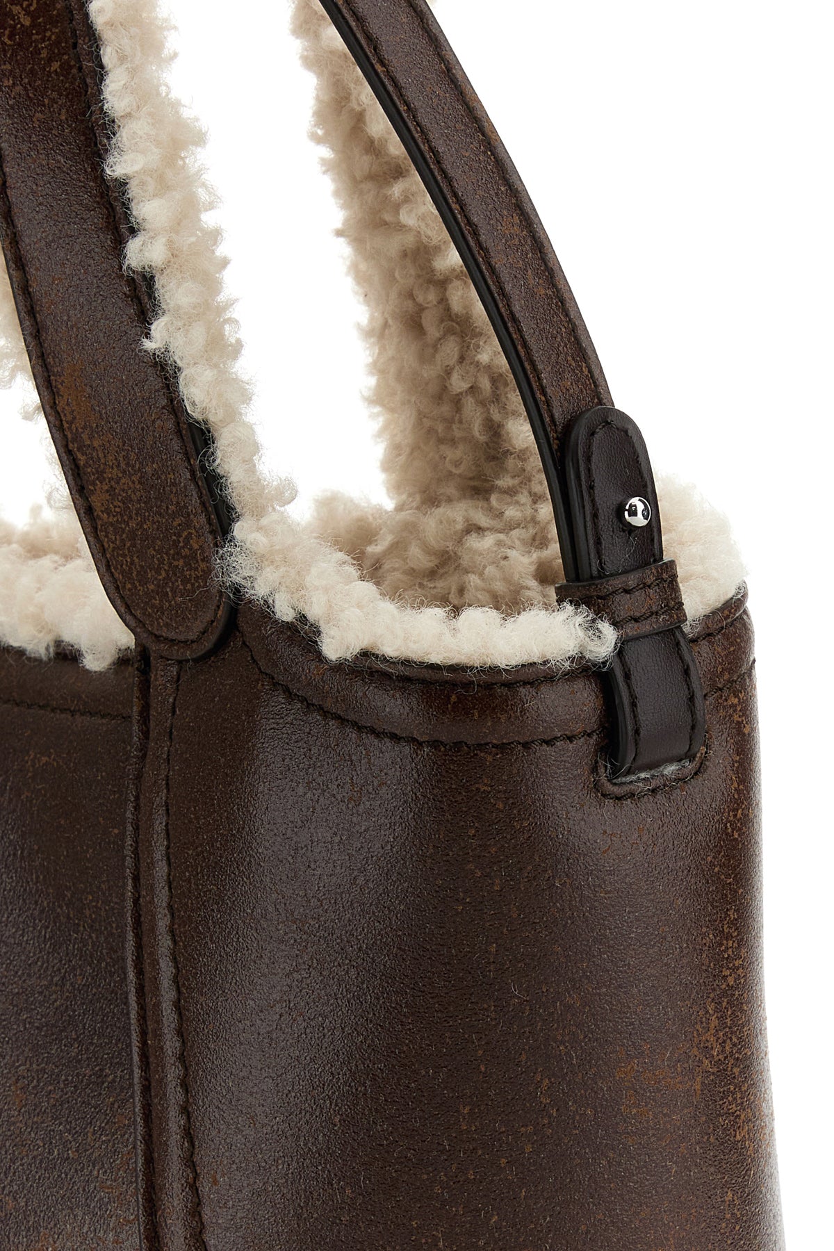 Borsa shopping realizzato in alter mat con inserto in eco pelliccia sulla parte superiore arricchito da logo in borchie metalliche sulla parte frontale.