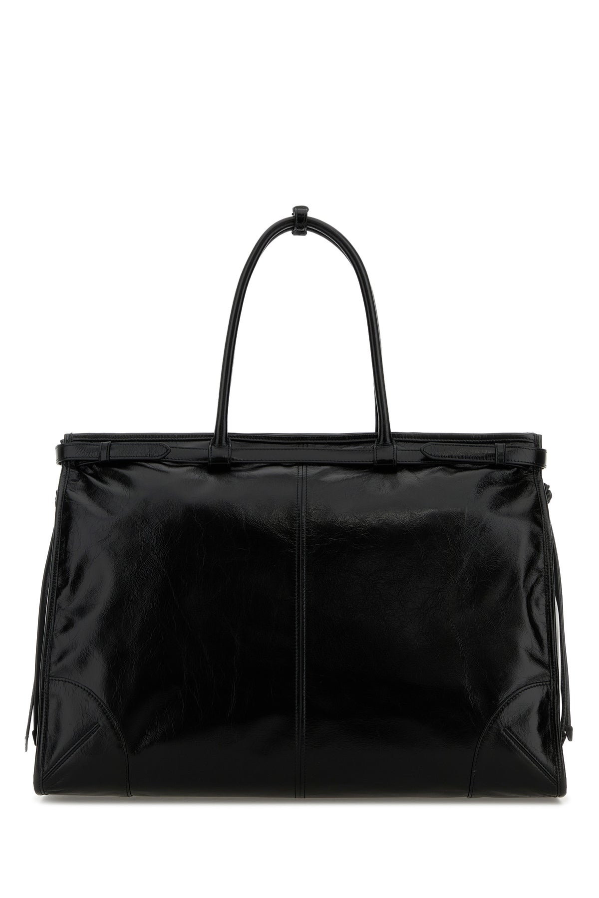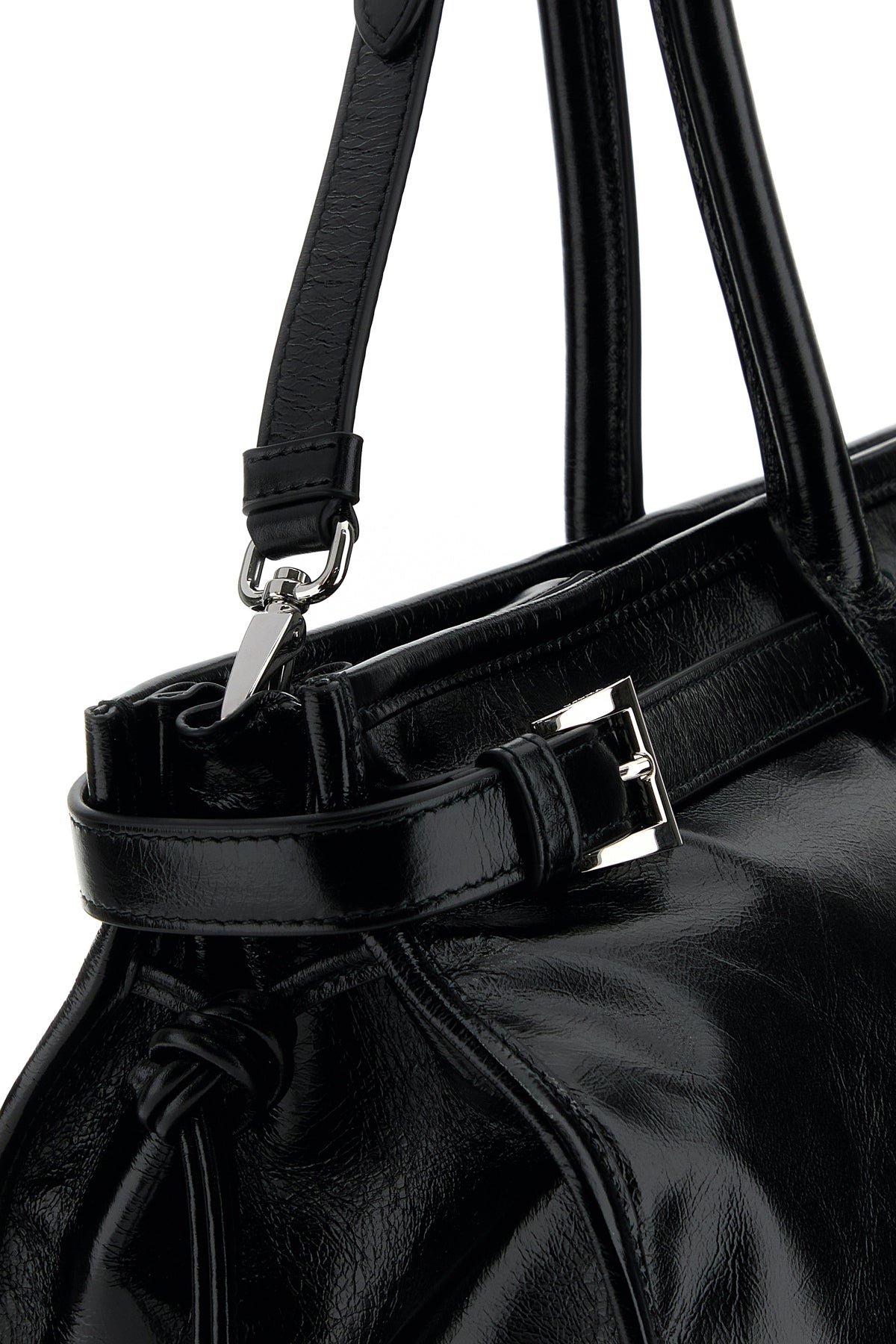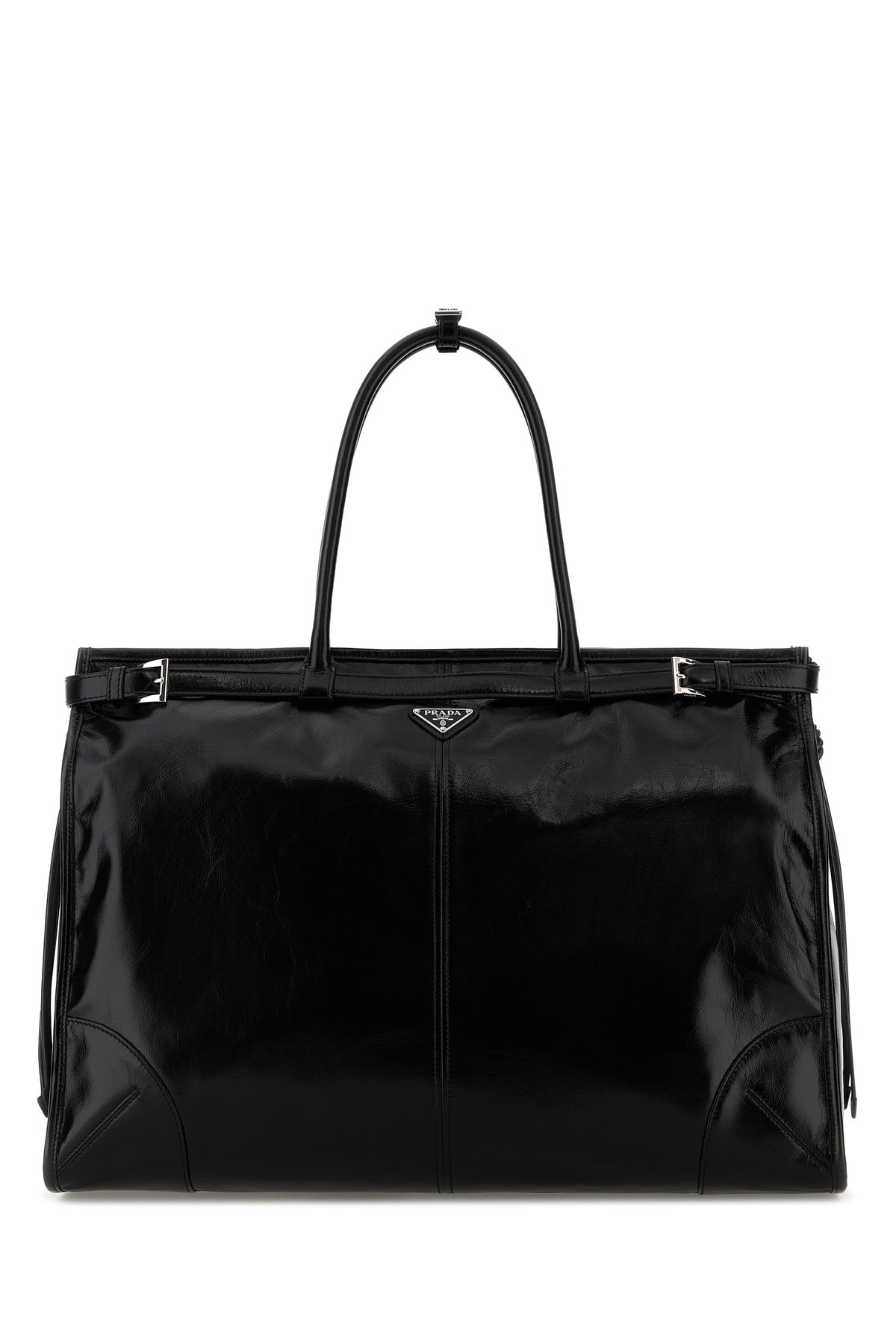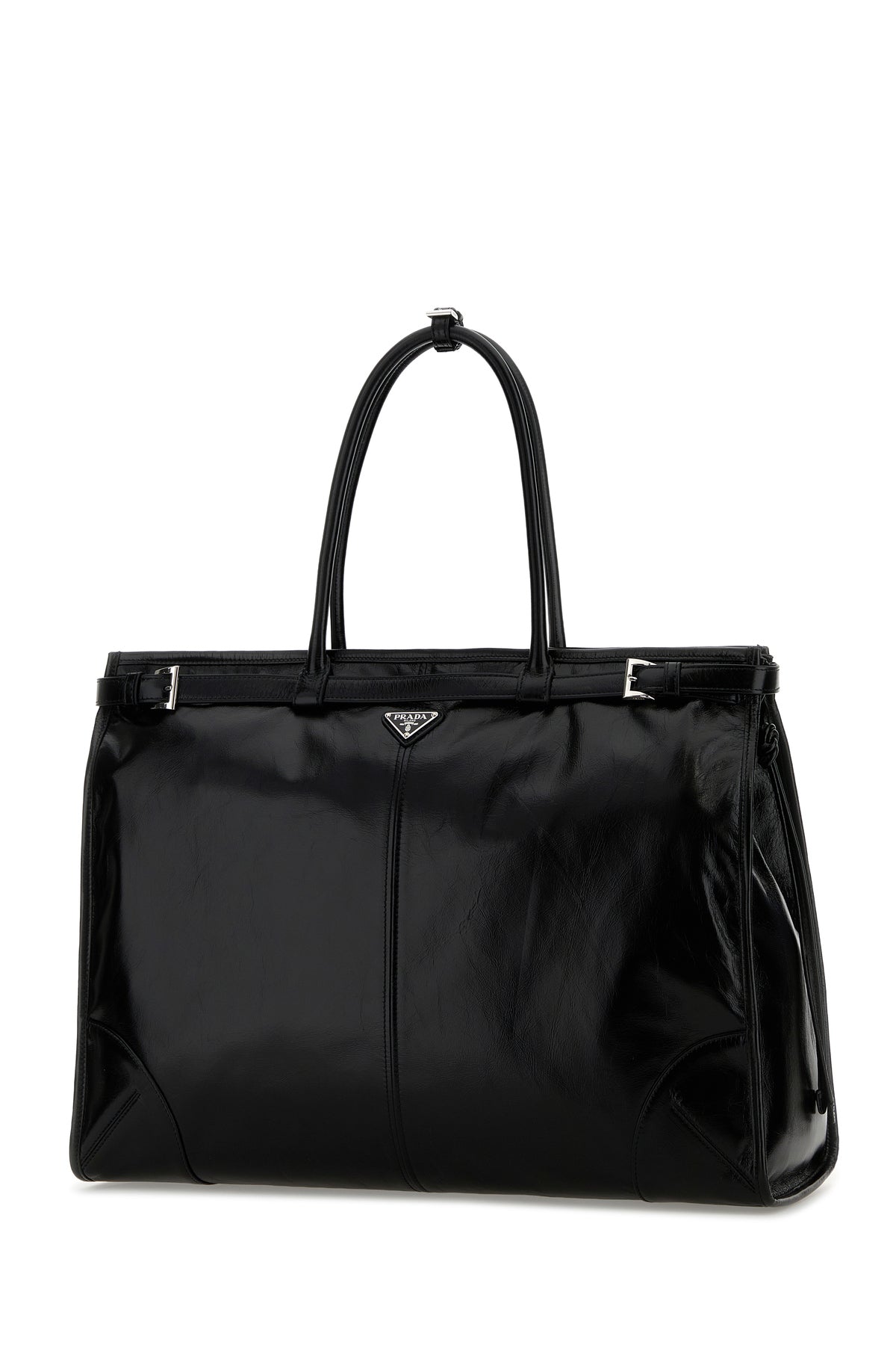Borsa shopping realizzata in pelle arricchita da iconico triangolo logato in metallo sulla parte frontale e cinturini decorativi con fibbia metallica sulla parte superiore.