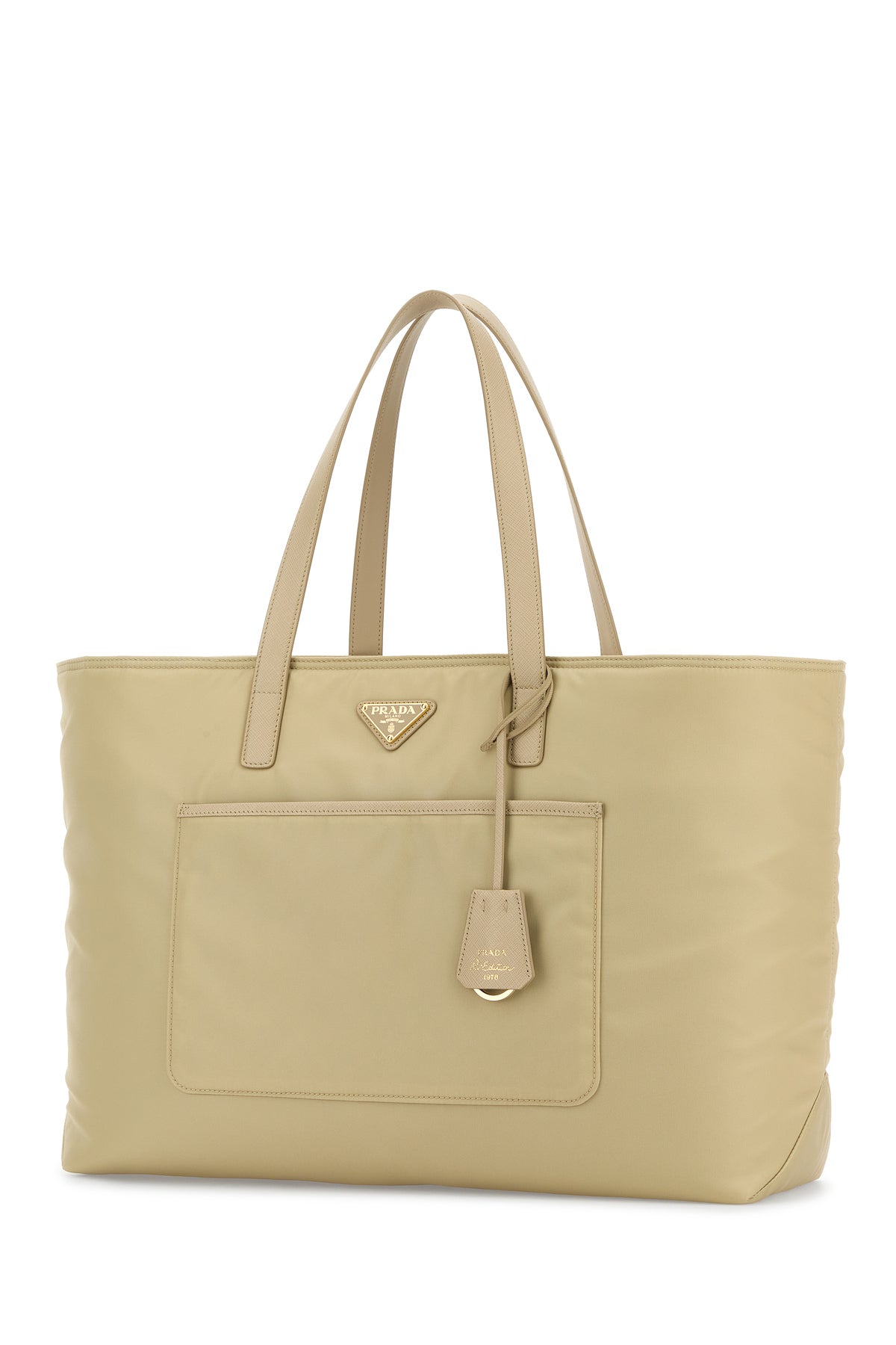 Borsa shopping realizzata in Re-Nylon arricchita da iconico triangolo logato sulla parte frontale e accessorio amovibile in pelle.