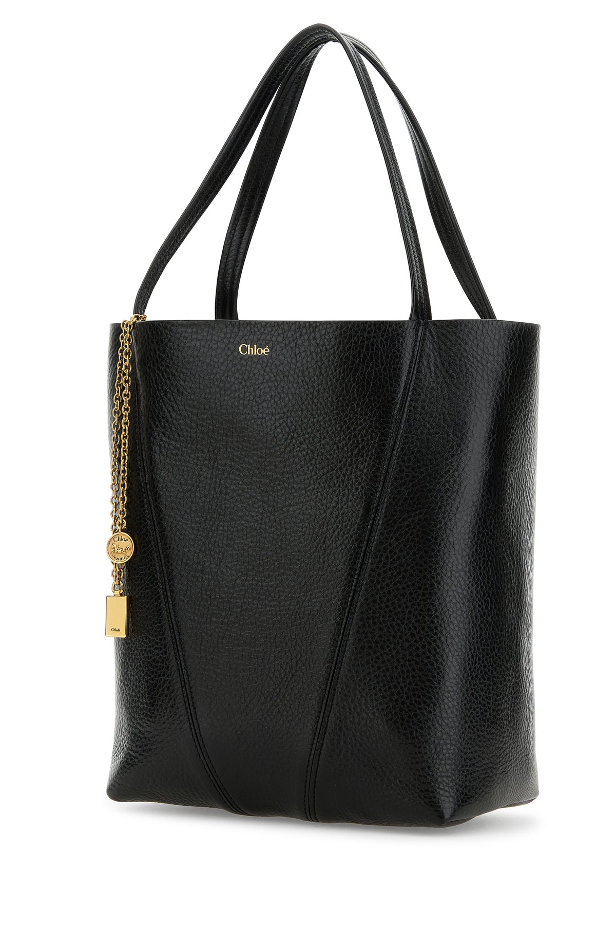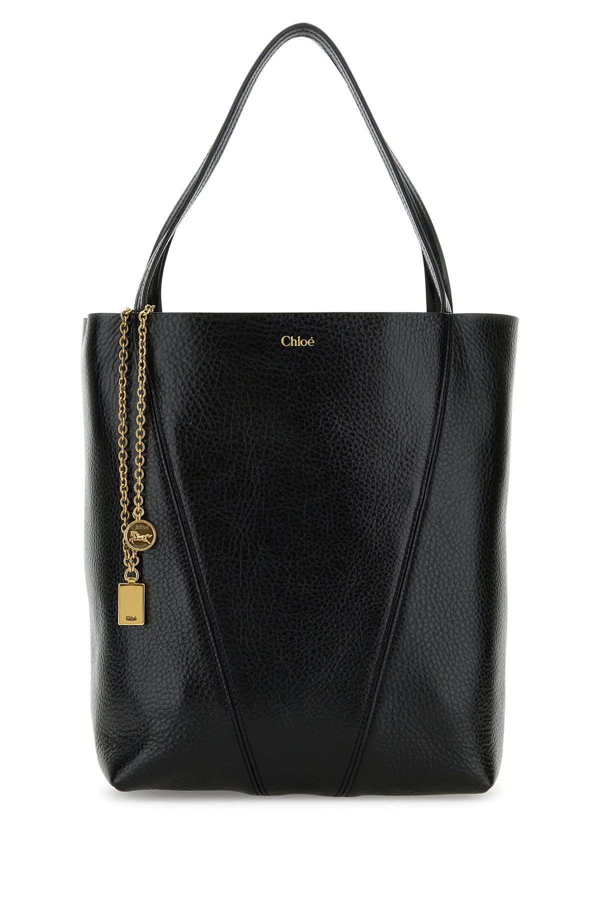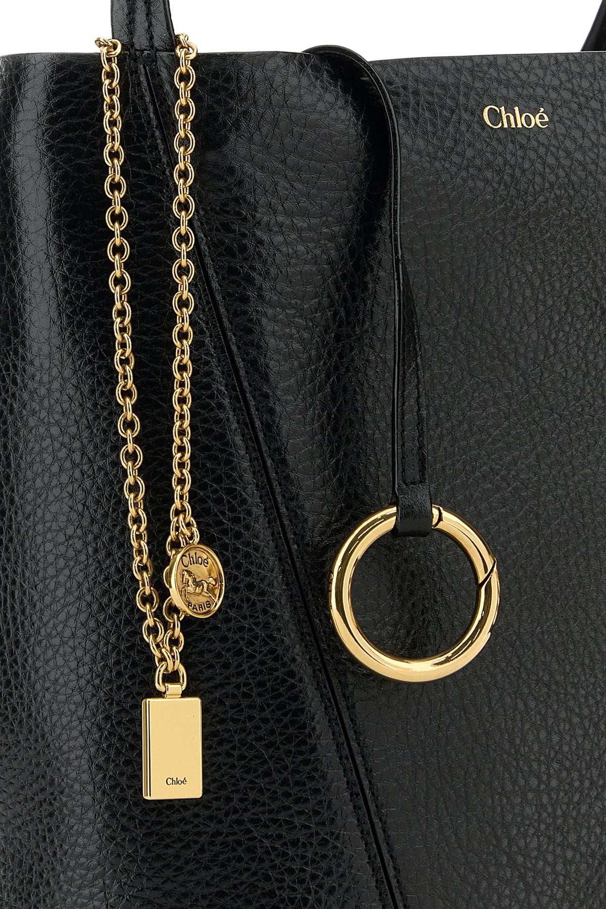 Borsa shopping realizzata in pelle di vitello martellata caratterizzata da logo stampato laminato sulla parte frontale arricchita da accessorio metallico amovibile con charm logati.
