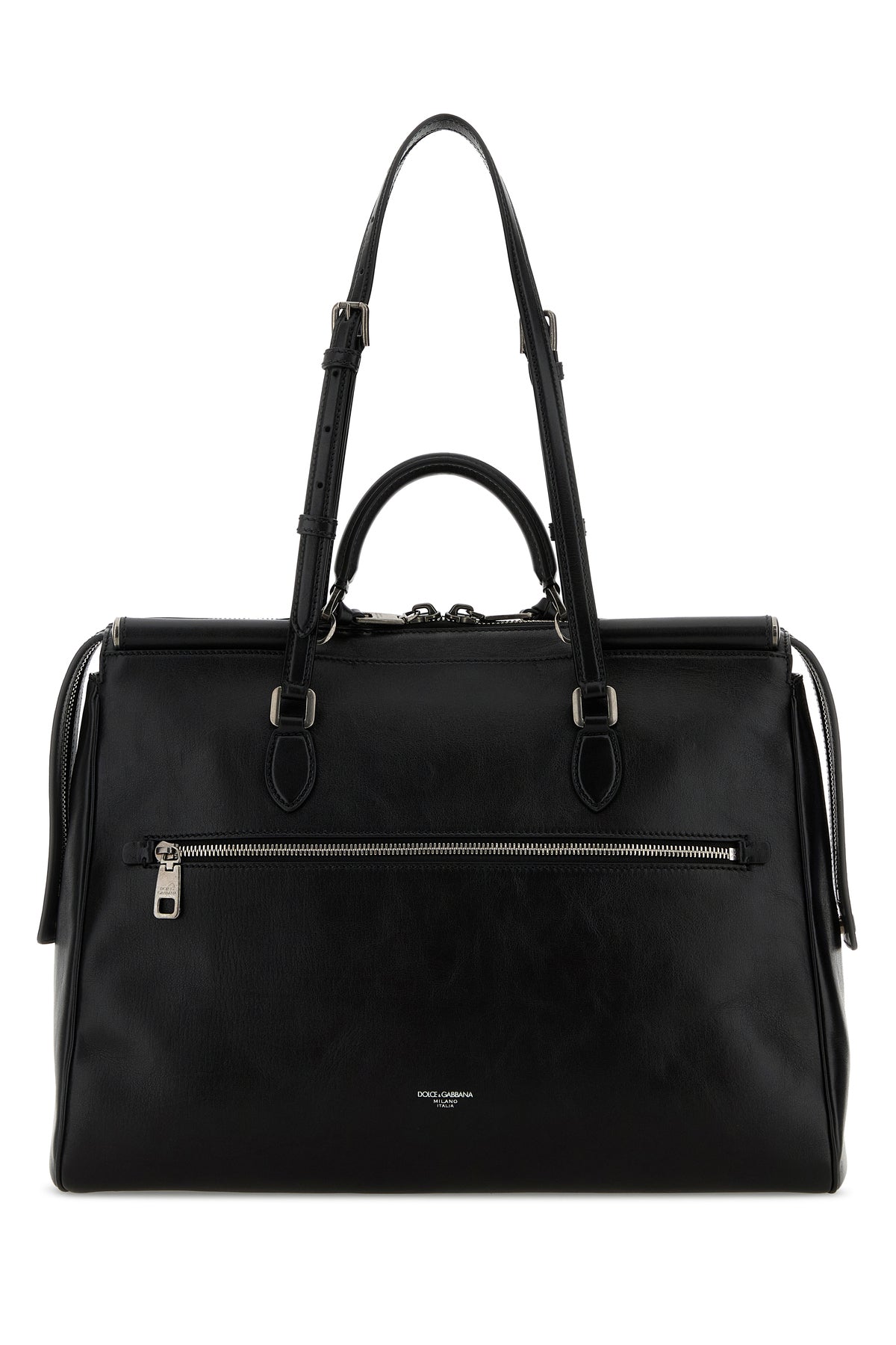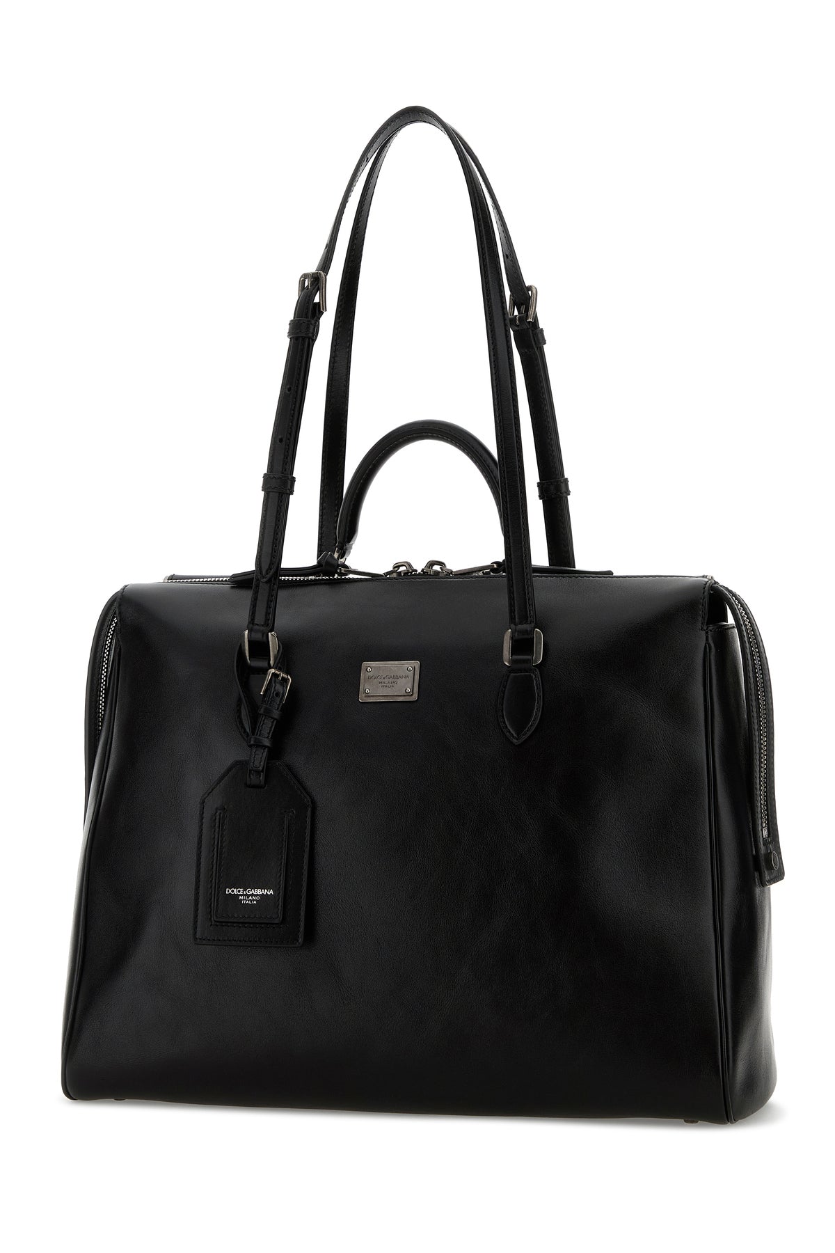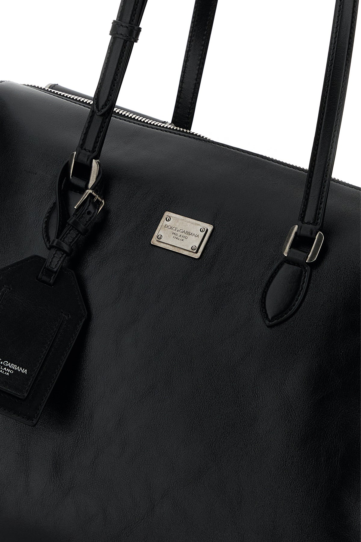 Borsa shopping realizzata in pelle di vitello martellata arricchita da targhetta metallica logata sulla parte frontale.
