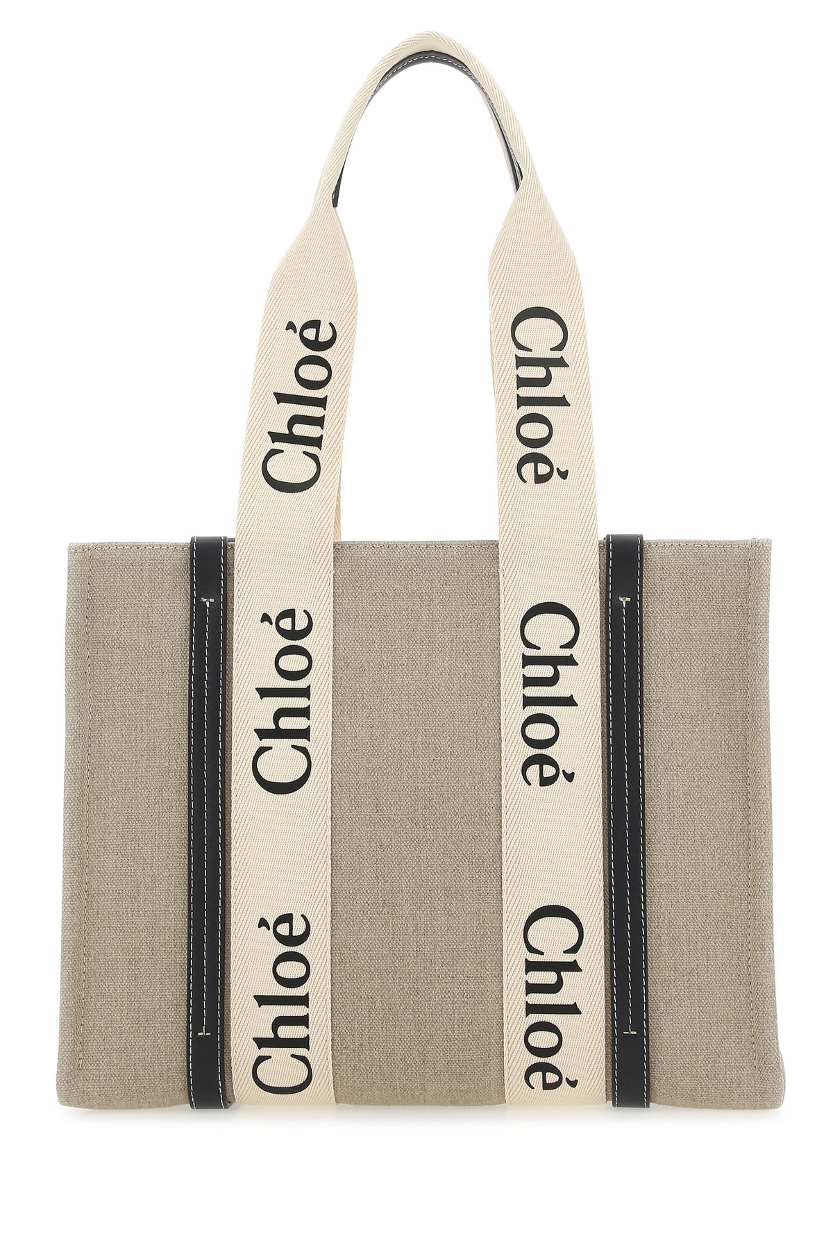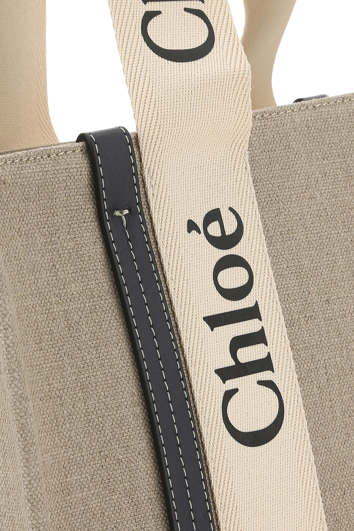 Borsa shopping realizzata in tela di cotone con inserti in pelle arricchita da bande logate sulla parte frontale e sul retro.