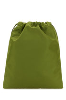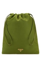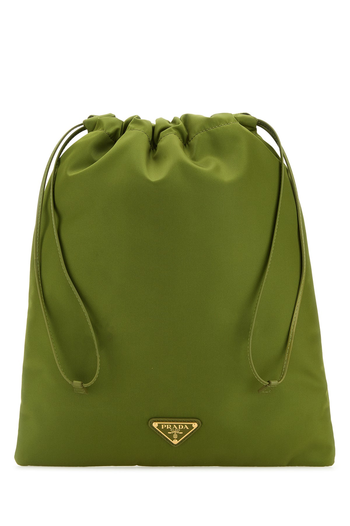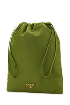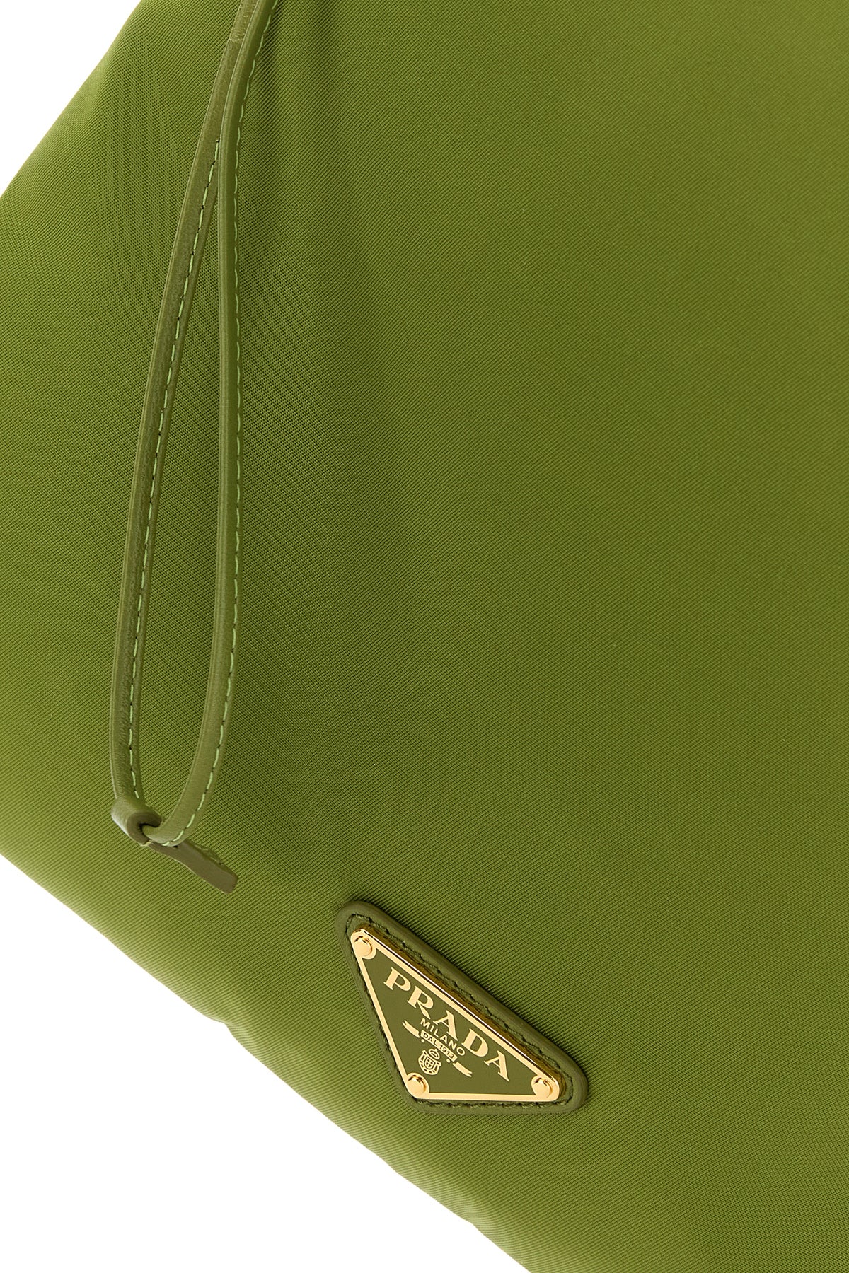 Busta realizzata in nylon arricchita da iconico triangolo metallico logato sulla parte frontale.