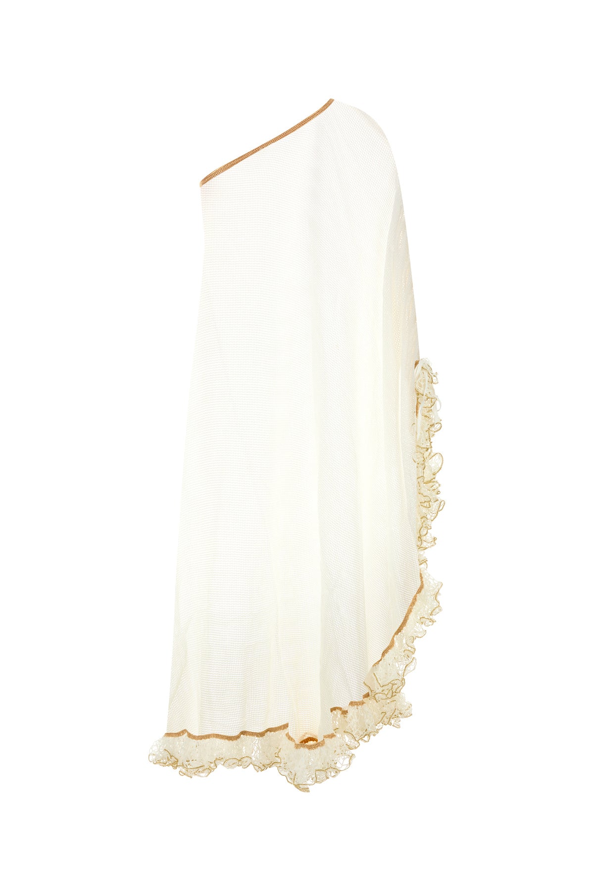 Caftano realizzato in crochet arricchito da ruches con fili in lurex sulle profilature.