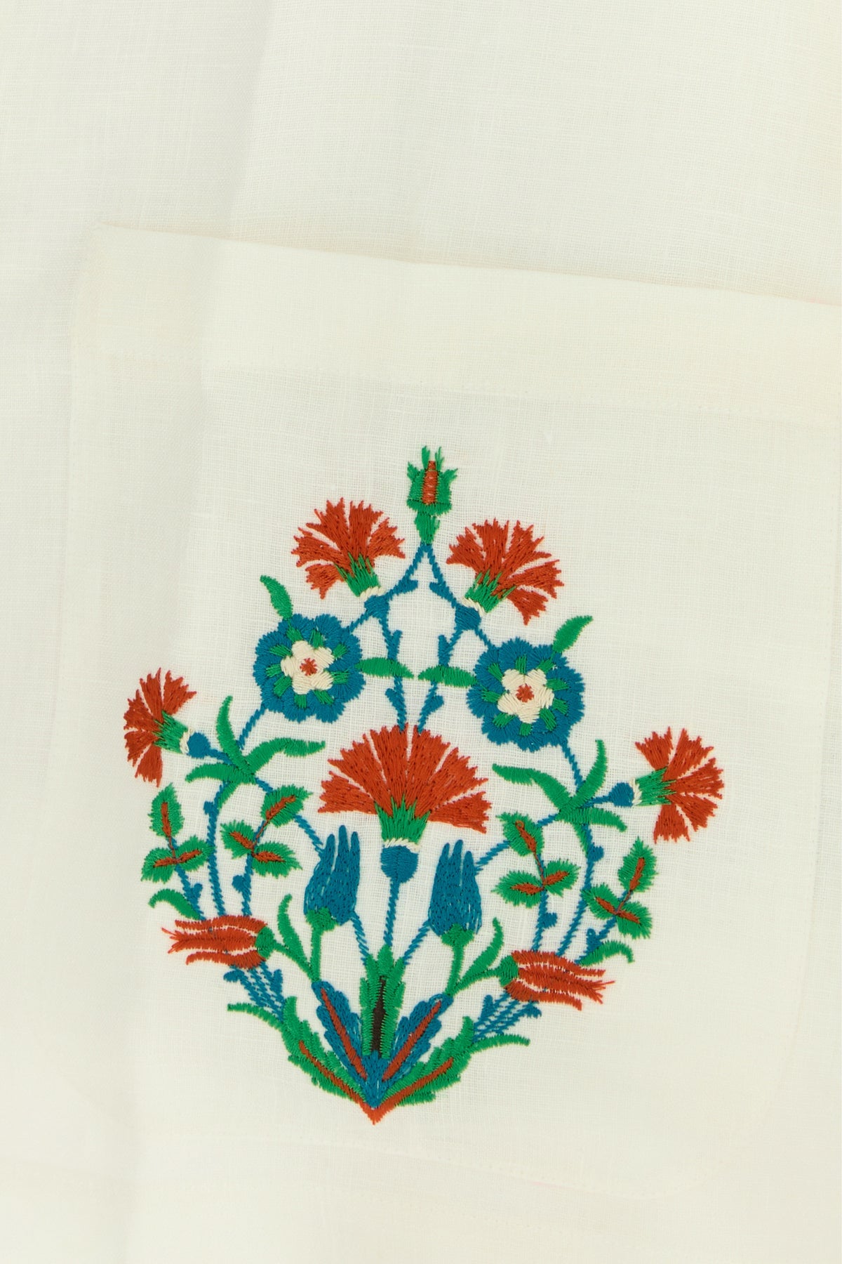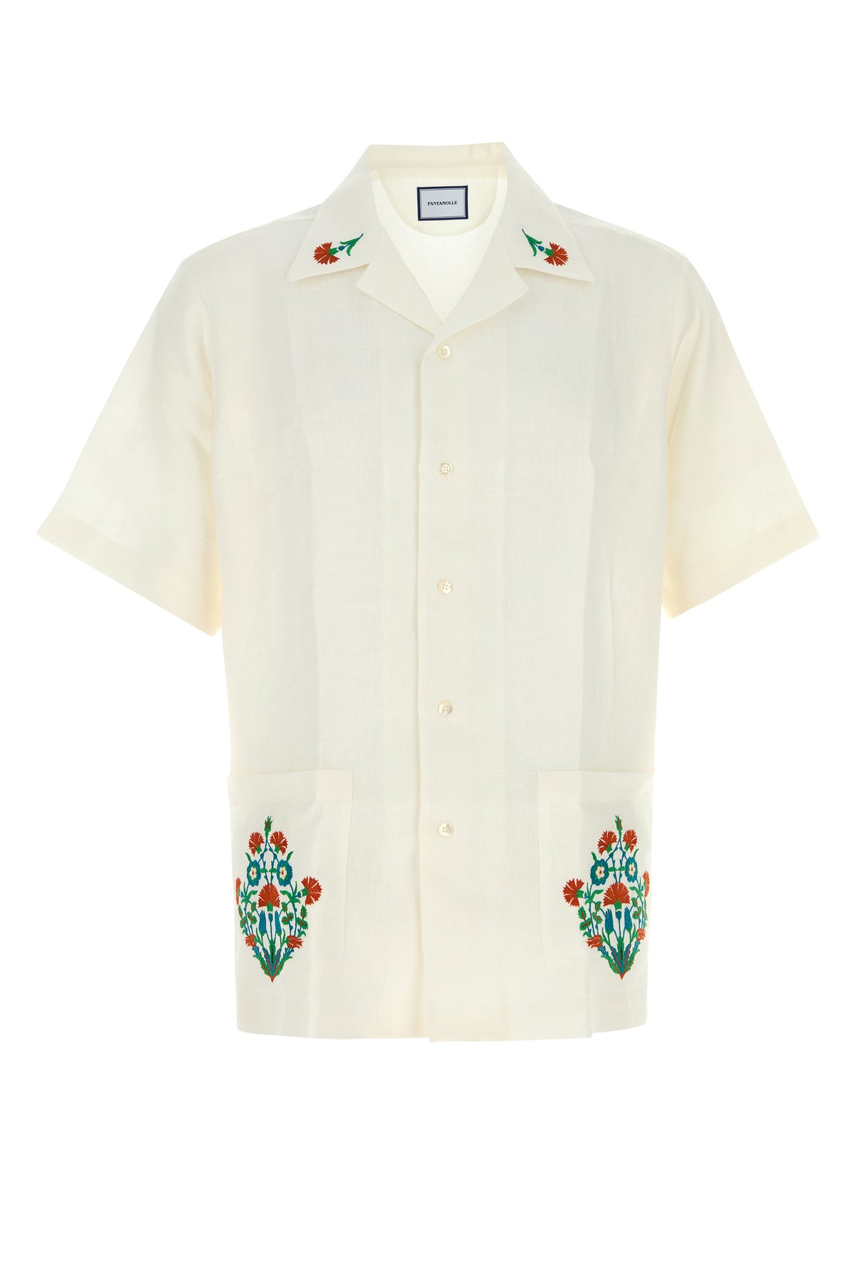 Camicia a maniche corte realizzata in puro lino caratterizzata da ricami floreale sulla parte superiore e sul fondo.