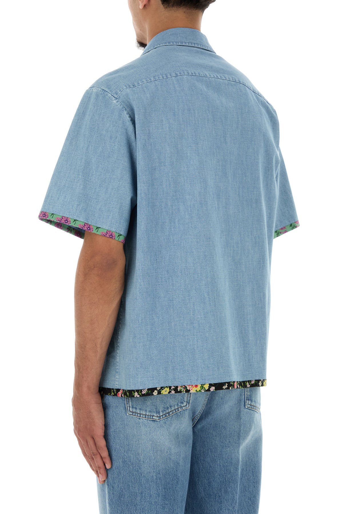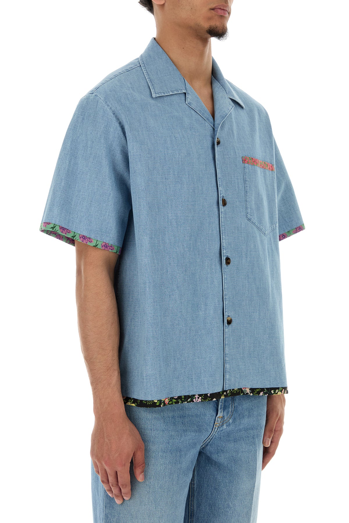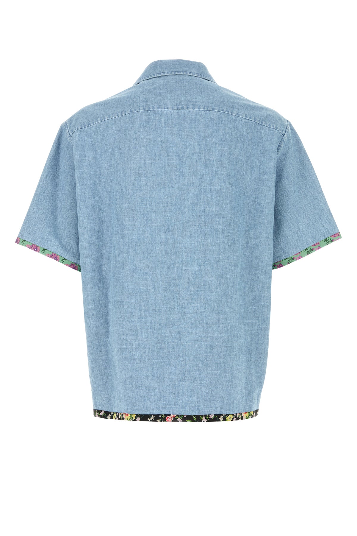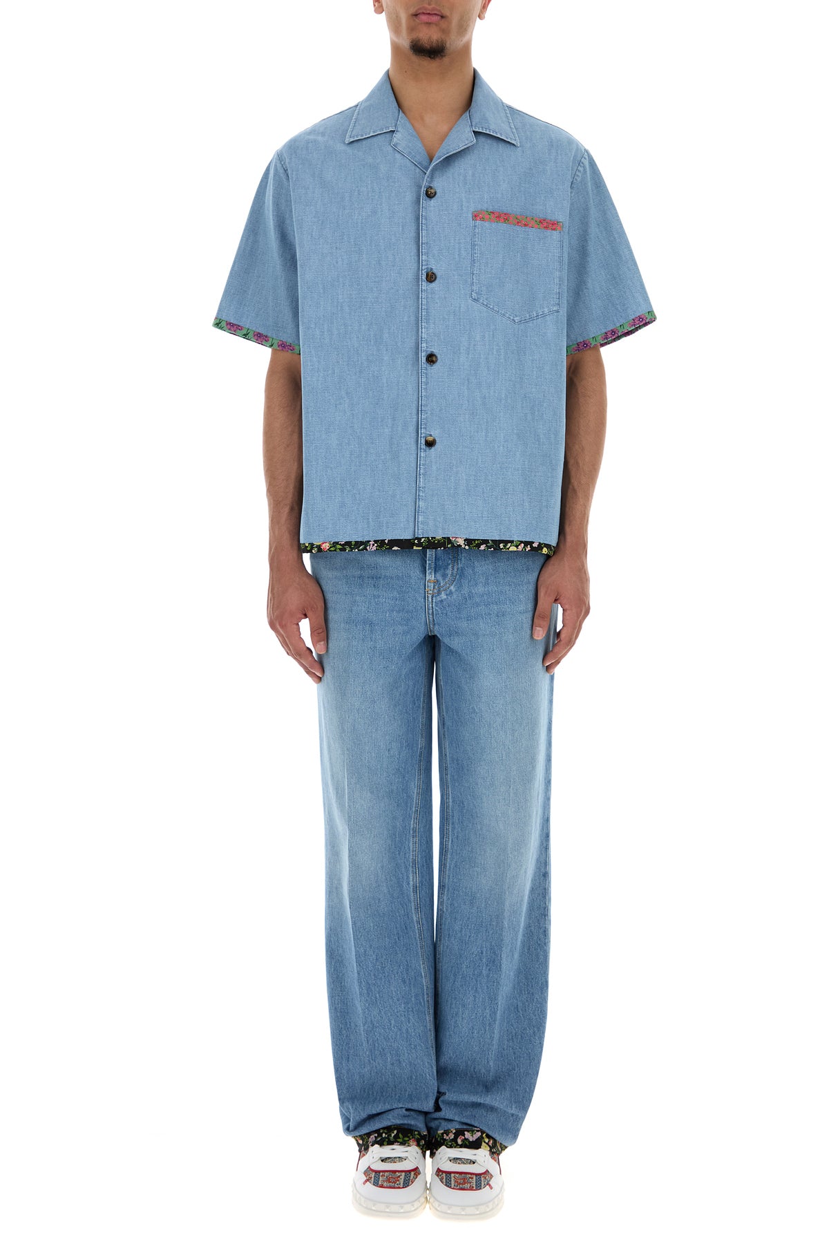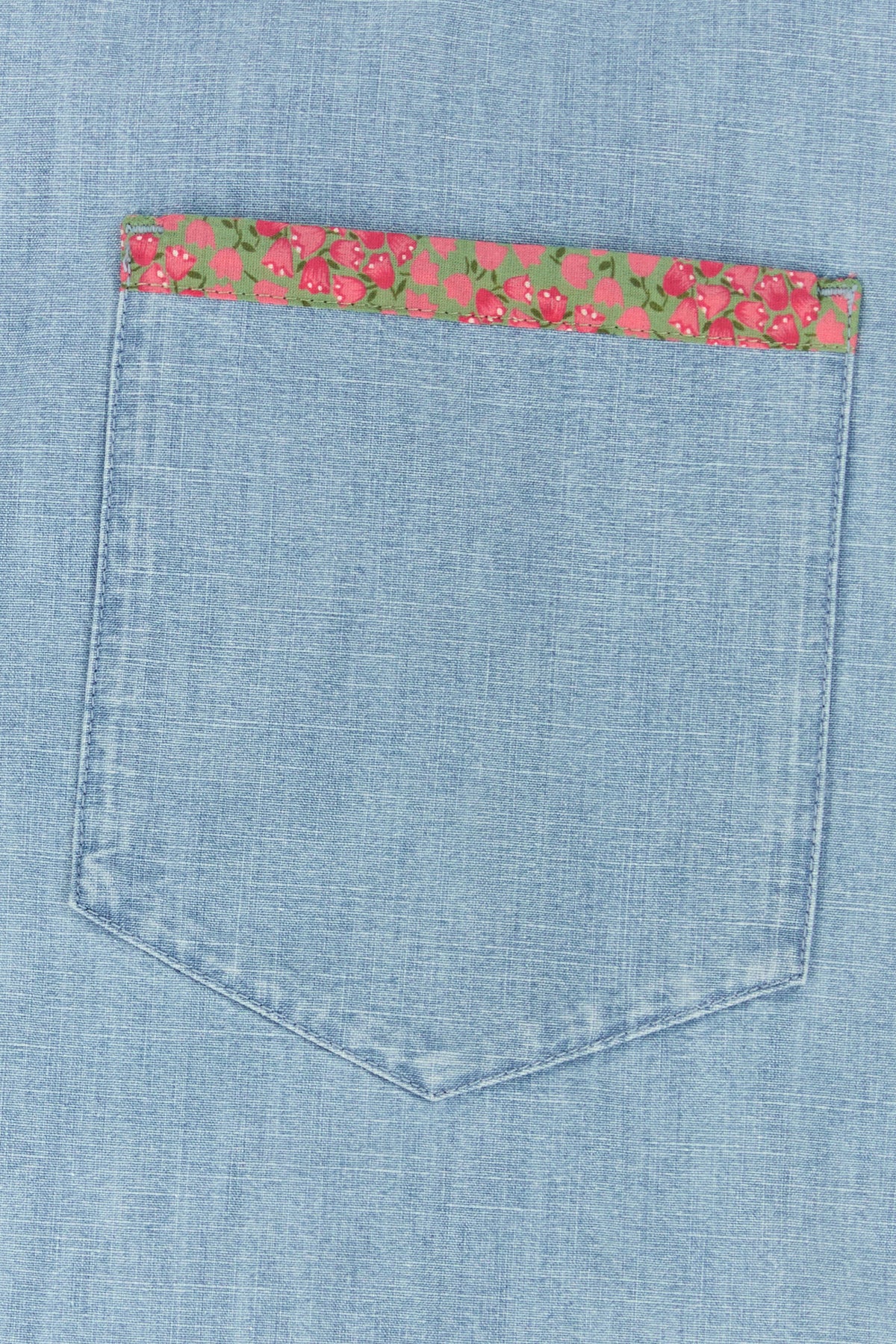 Camicia a maniche corte realizzata in denim di puro cotone caratterizzata da stampa floreale sul taschino sul petto, sui polsini e sul fondo.