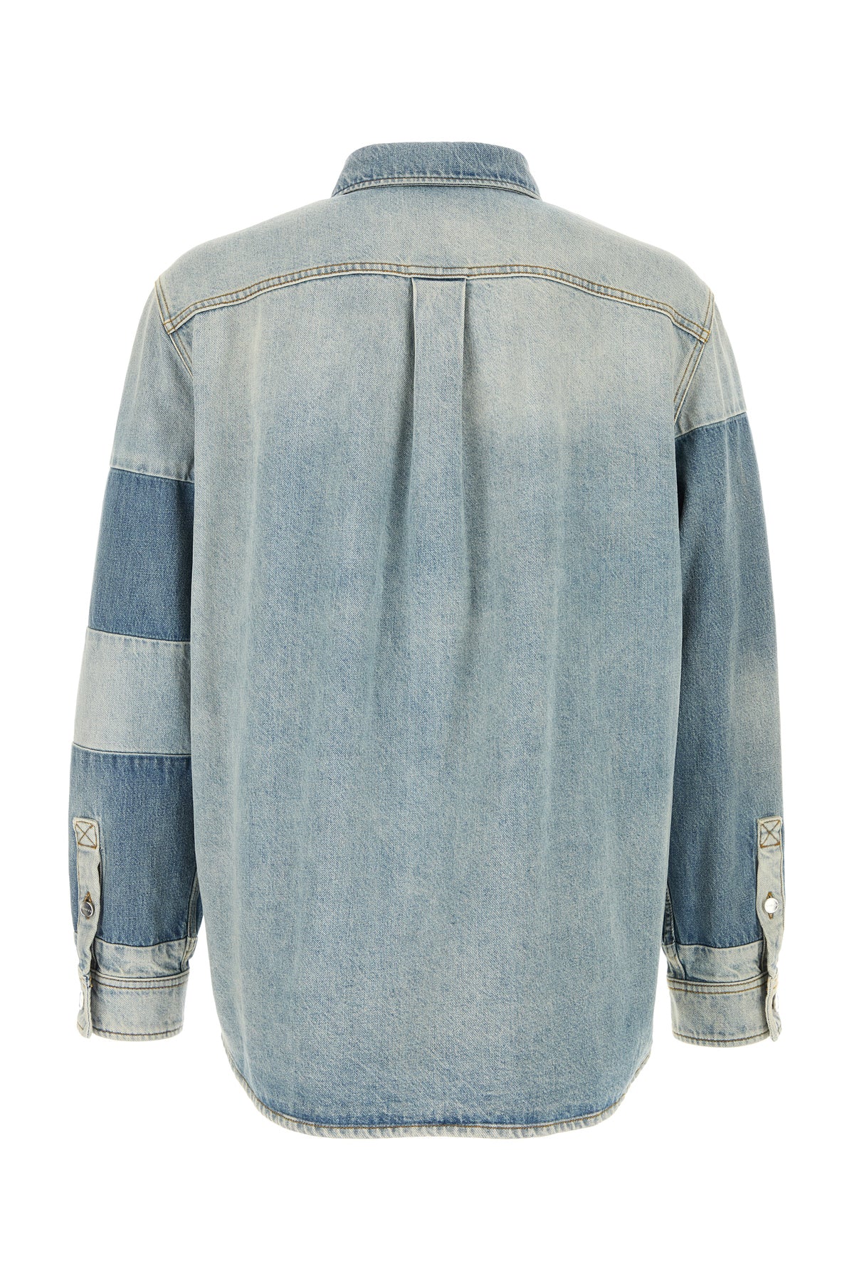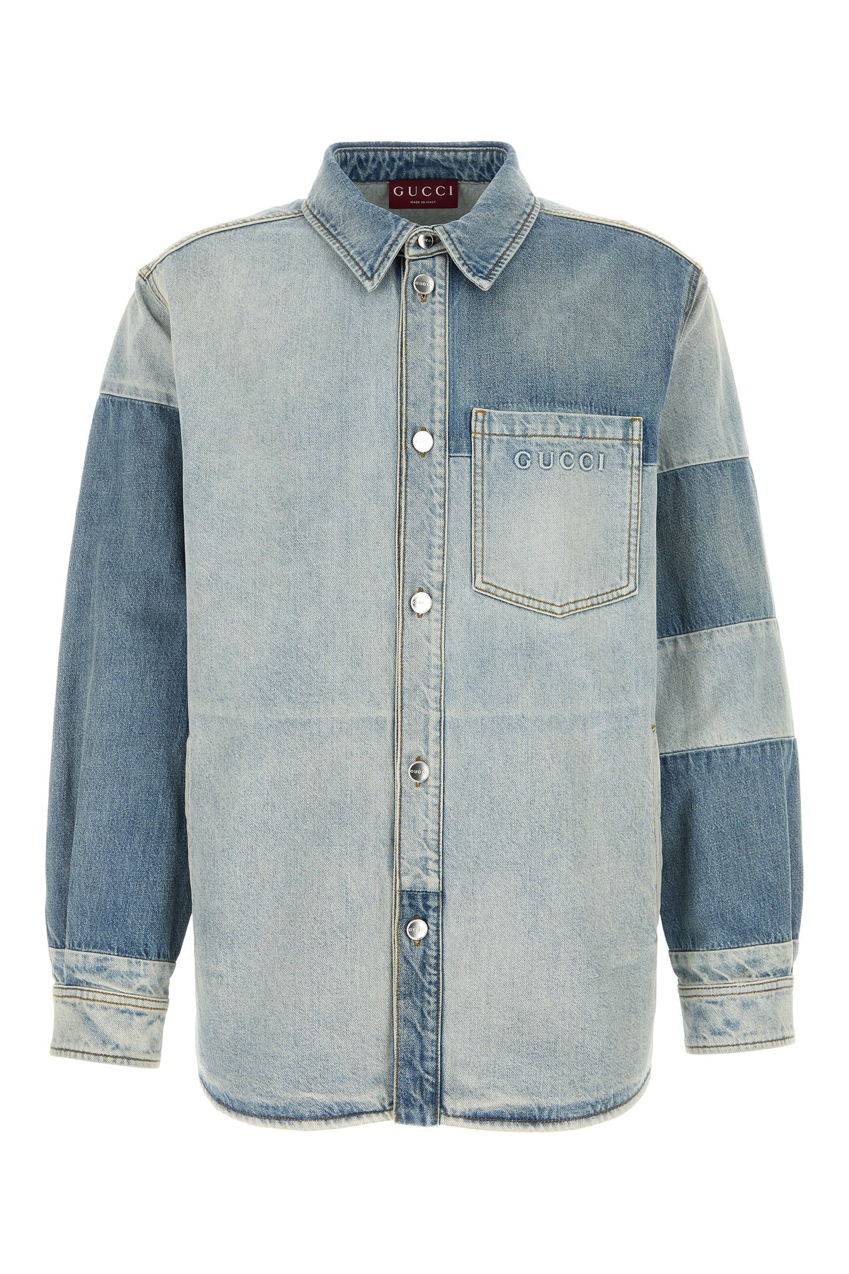 Camicia realizzata in denim di puro cotone slavato caratterizzata da motivo Gucci in rilievo sul petto.