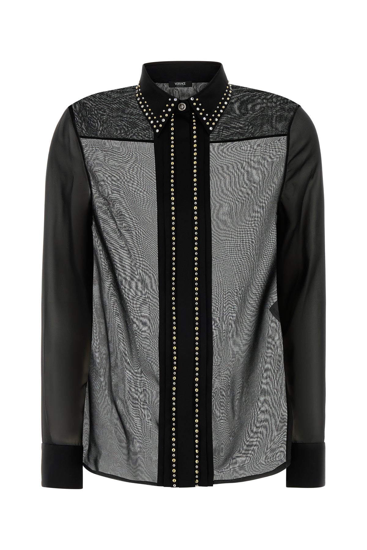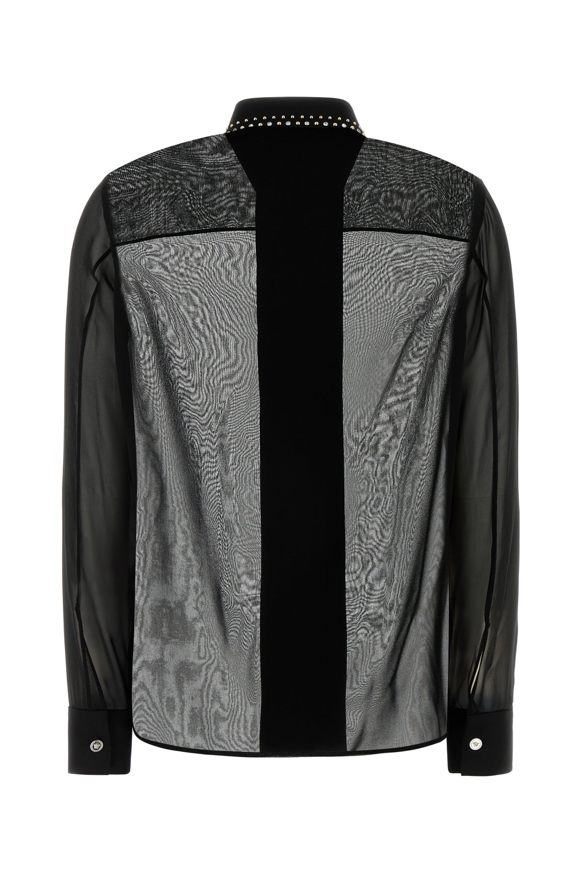 Camicia semitrasparente realizzata in pura seta arricchita da borchie metalliche sul colletto a punte corte e sulla chiusura a scomparsa mediante bottoni.