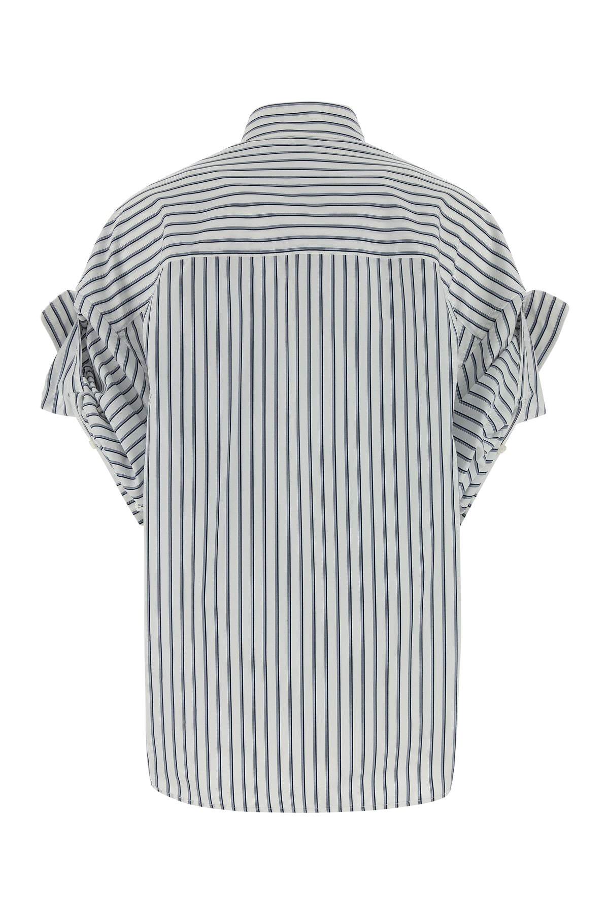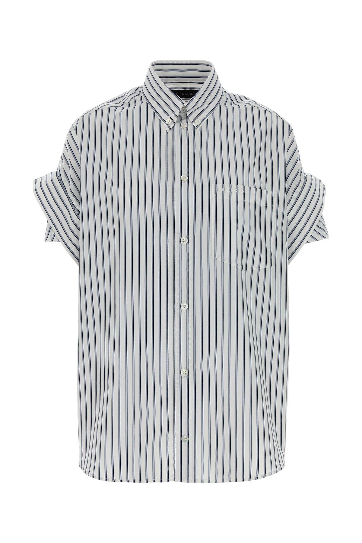 Camicia oversize a maniche corte realizzata in popeline di puro cotone caratterizzata da ricamo Balenciaga sul petto e ricamo a righe su tutta la superficie.