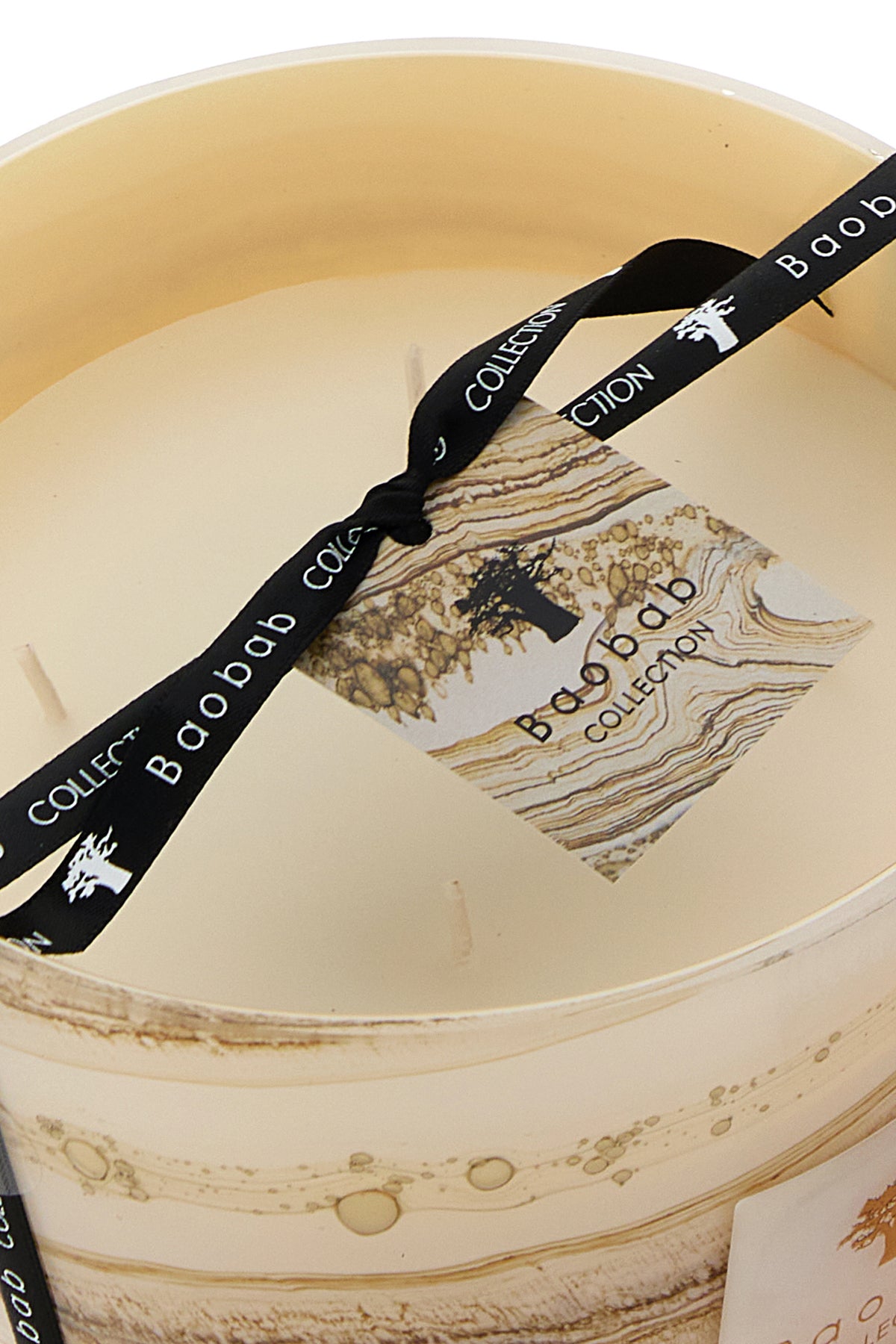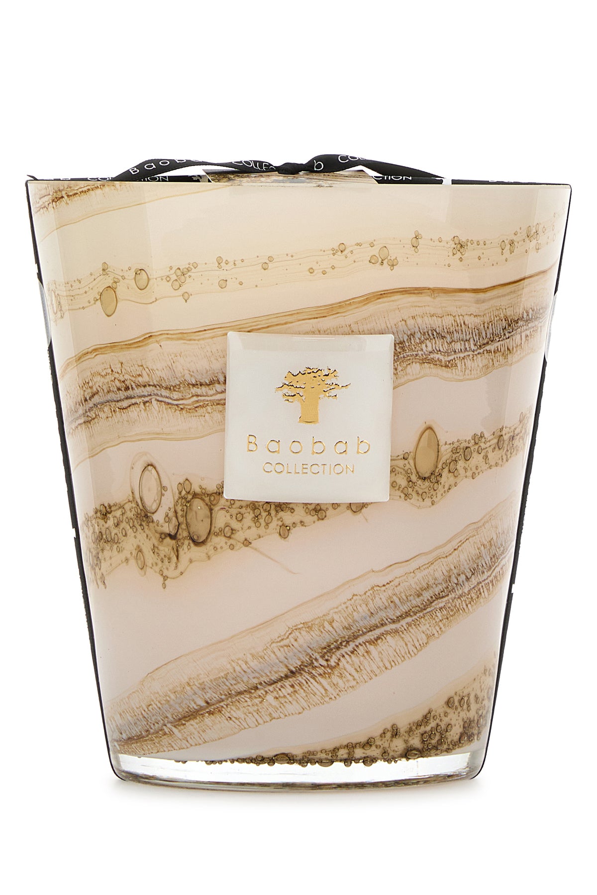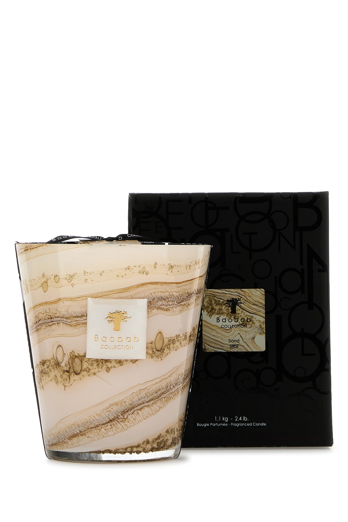 Il vetro soffiato a mano delle candele Siloli presenta sfumature di beige e marrone, con linee orizzontali formate da piccole macchie organiche casuali. Ogni contenitore in vetro è unico, poiché il color sabbia si dissolve nel materiale con il soffio dell'artigiano.