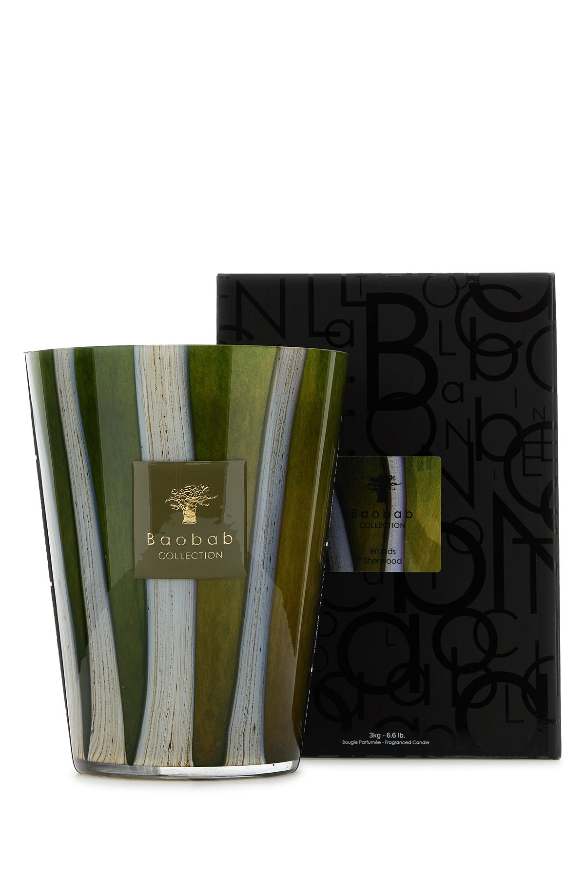 Il contenitore in vetro della candela profumata Sherwood è decorato con linee verticali che ricordano i maestosi tronchi di alberi che si protendono verso il cielo. Verde intenso con riflessi kaki, tra il marrone e il giallo, la candela cattura la luce e si anima di bagliori ammalianti con la fiamma.