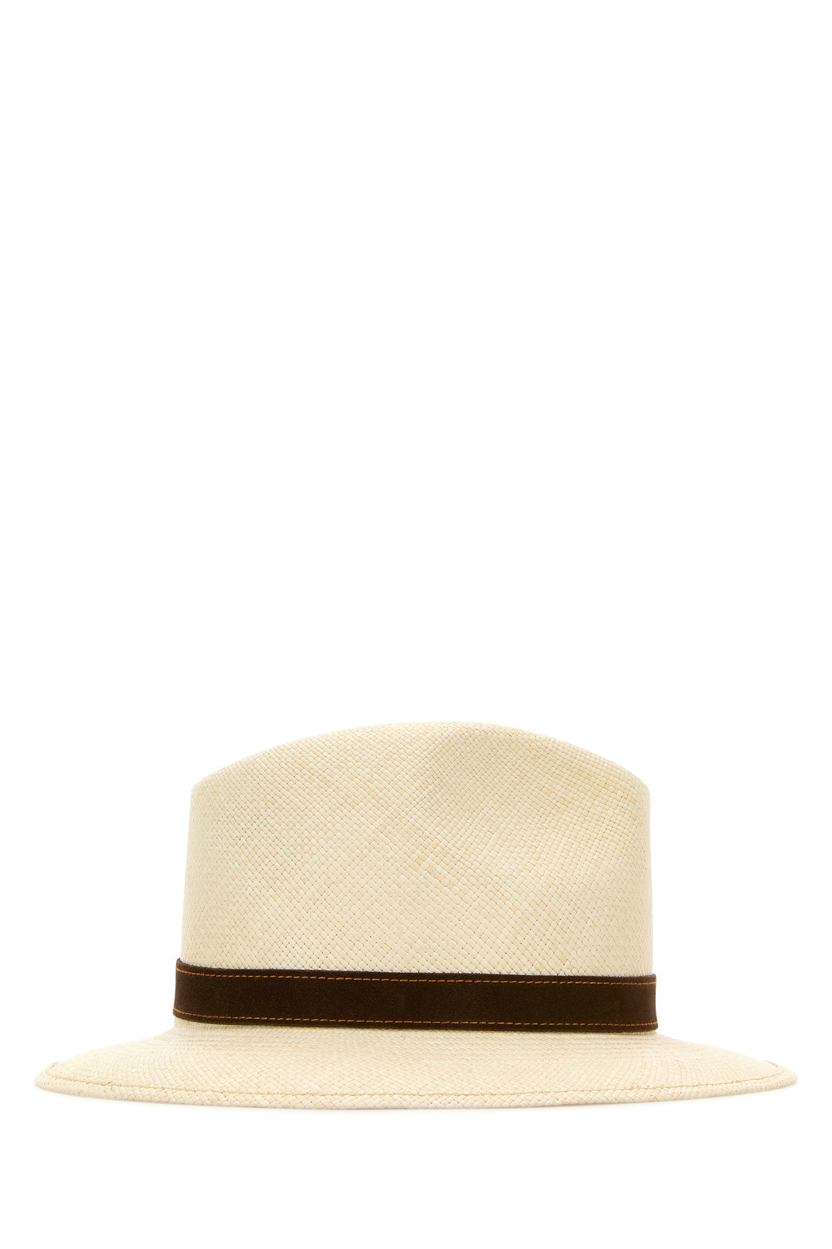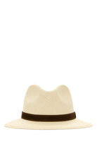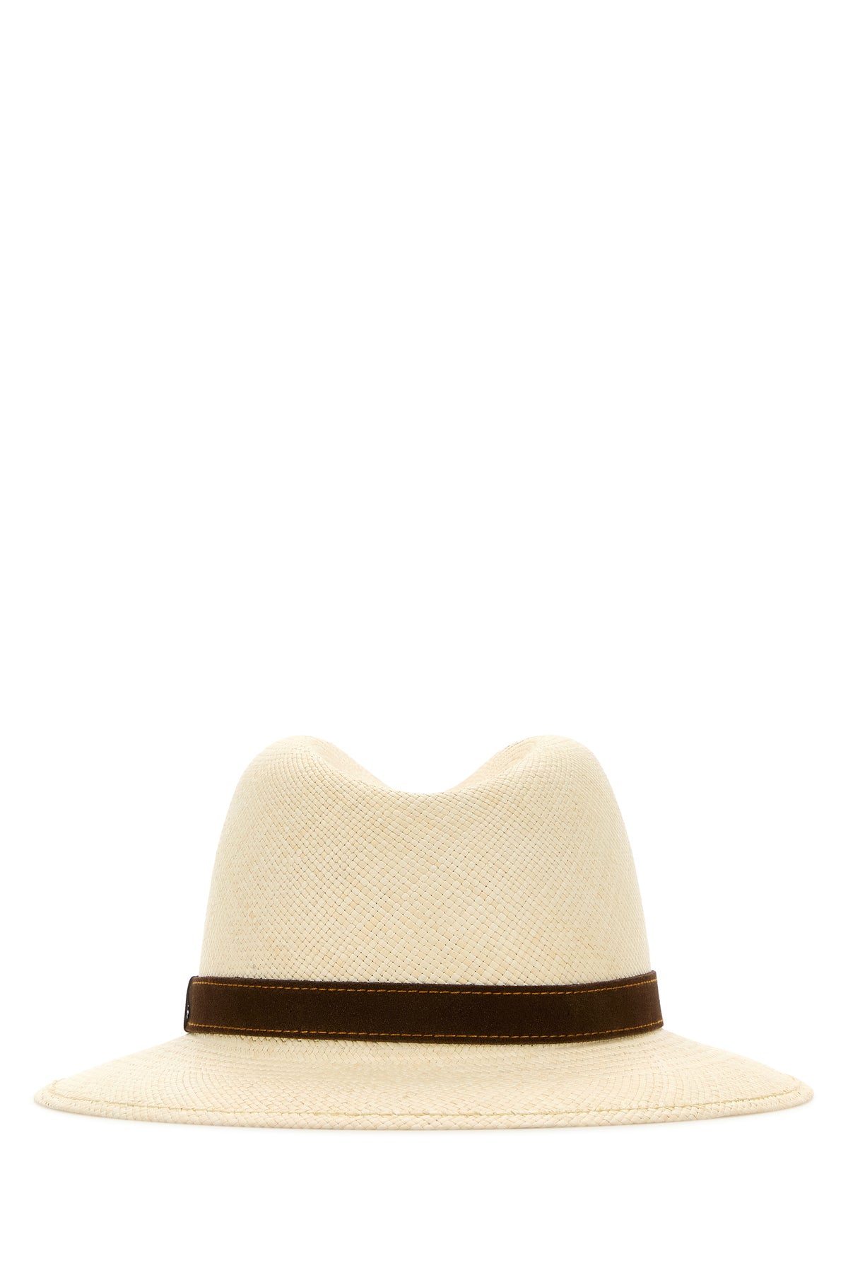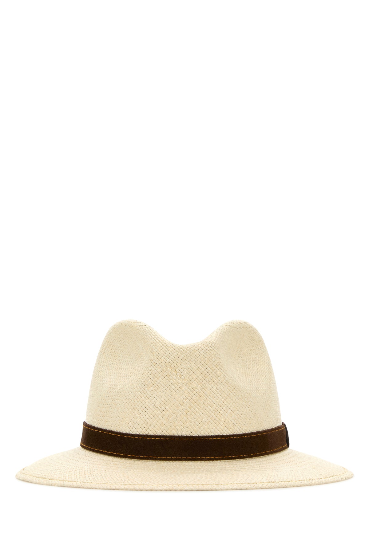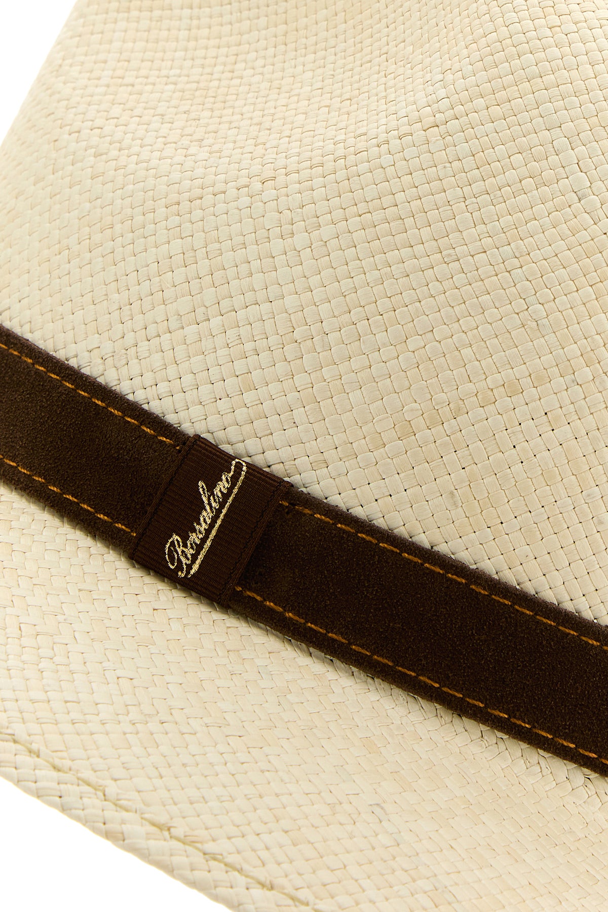 Cappello realizzato in paglia intrecciata arricchito da nastro logato in pelle scamosciata.