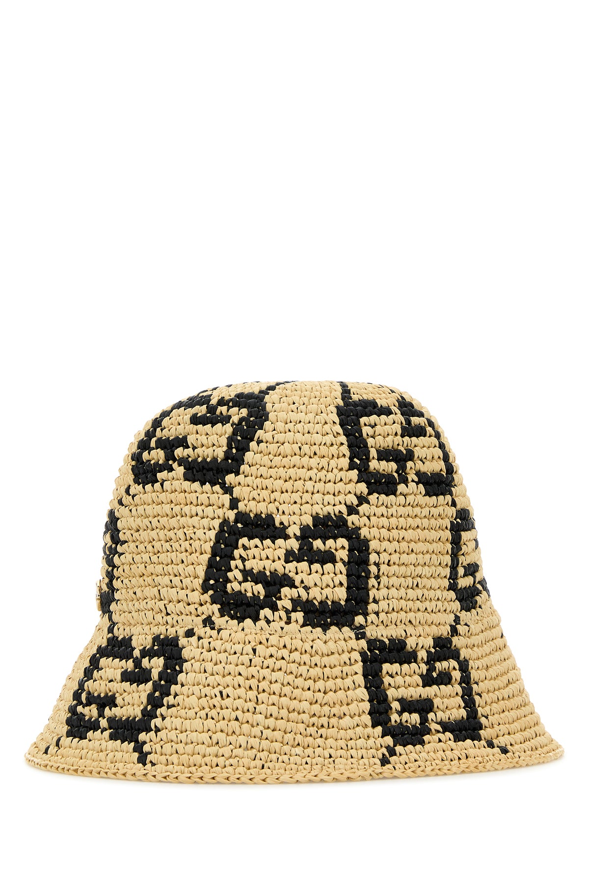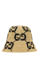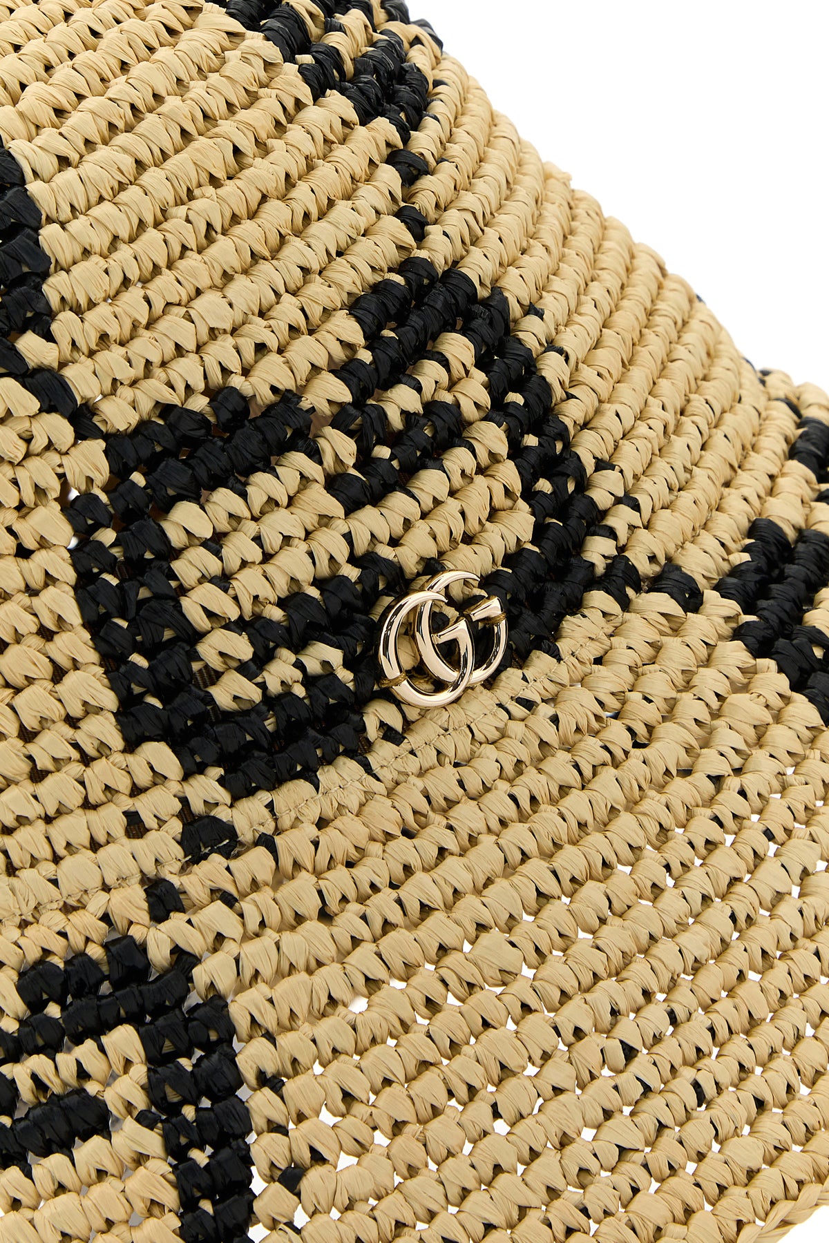 Cappello da pescatore realizzato in rafia caratterizzato da ricamo a motivo GG su tutta la superficie arricchito da dettaglio GG in metallo sulla parte frontale.