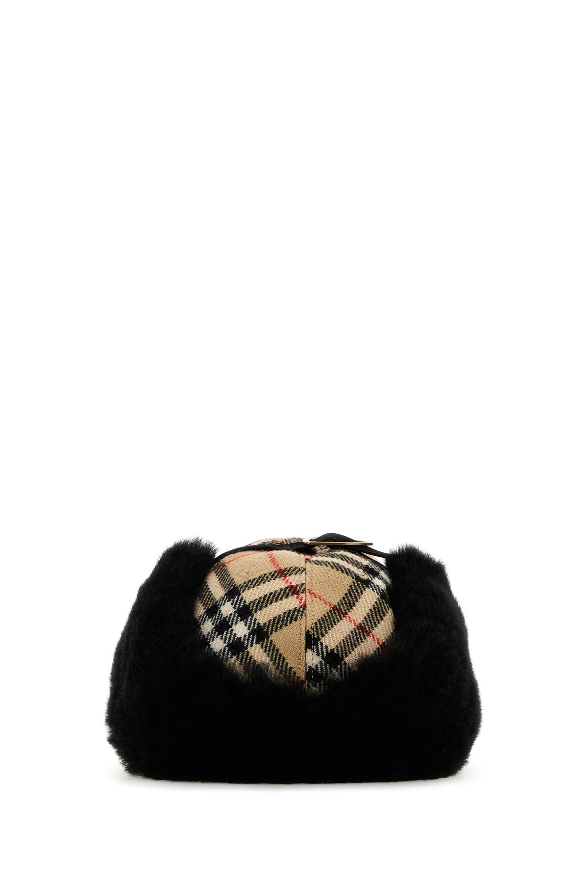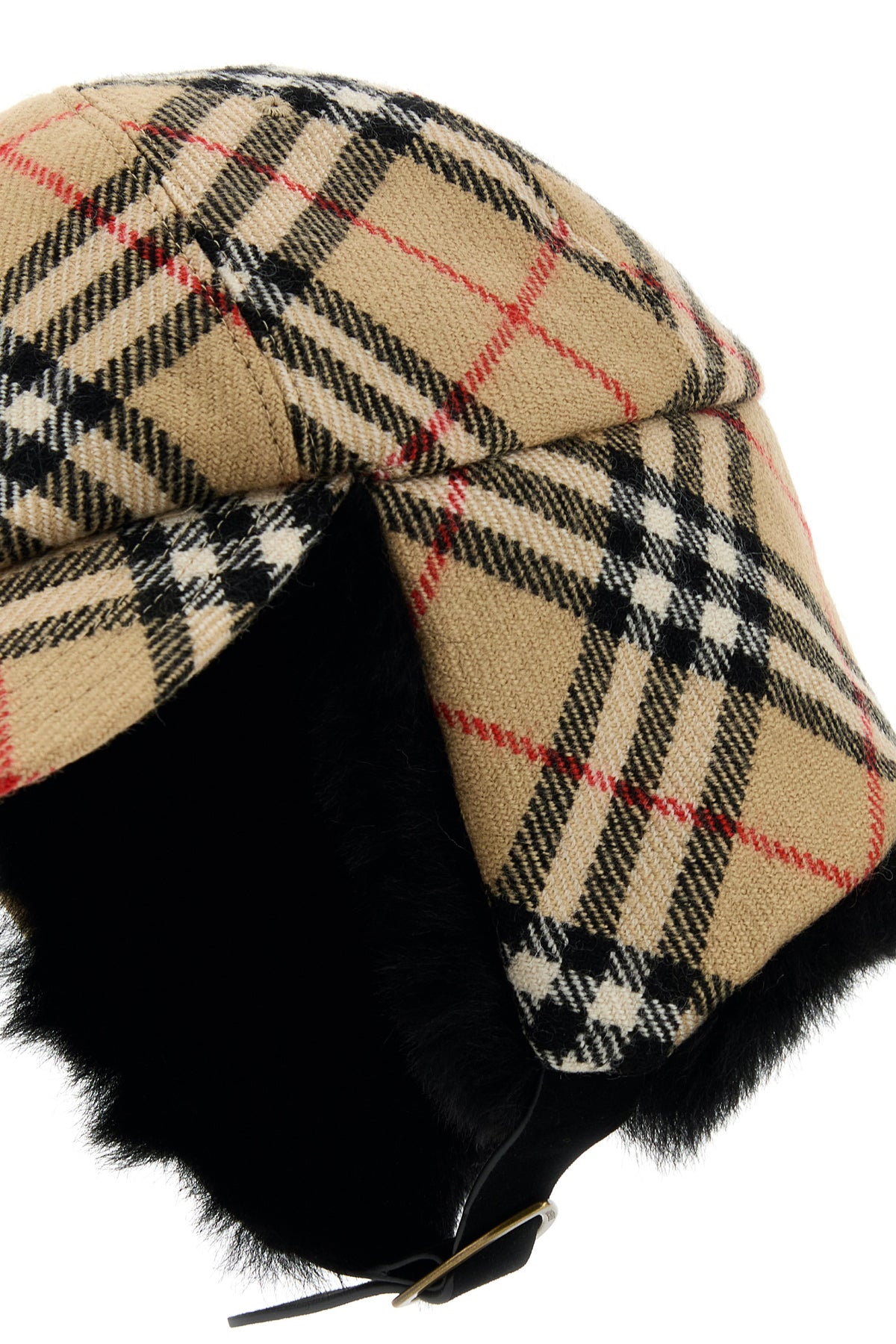 Cappello da aviatore realizzato in pura lana con inserti in montone sulle profilature caratterizzato da ricamo Burberry Check su tutta la superficie.