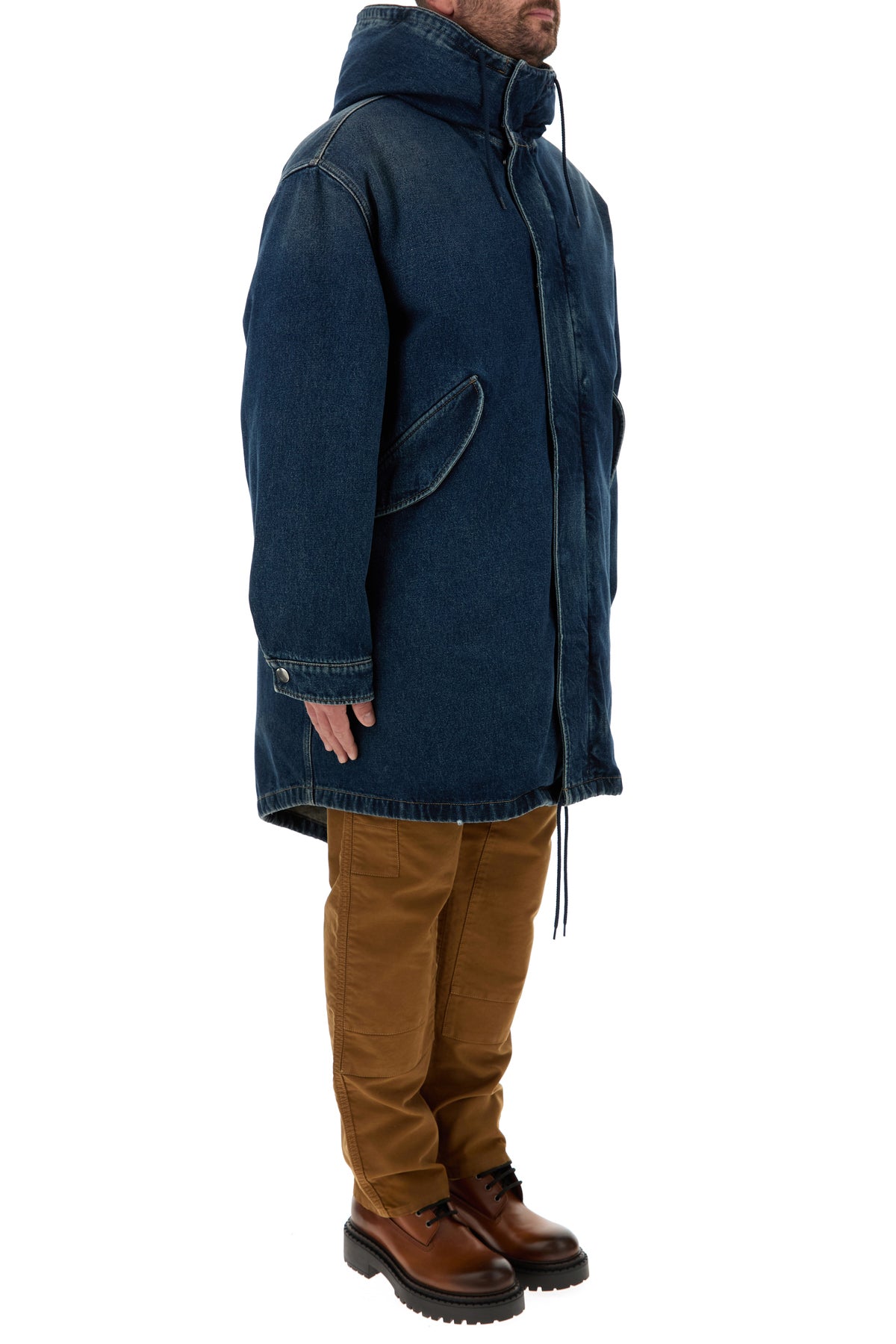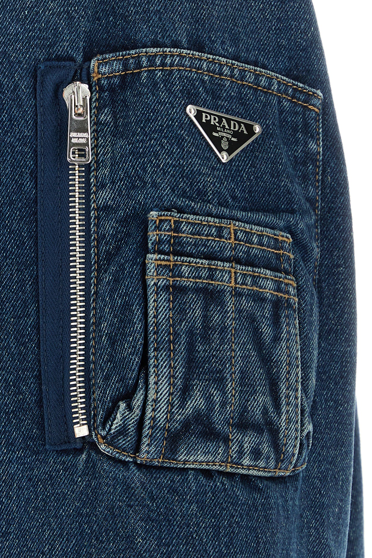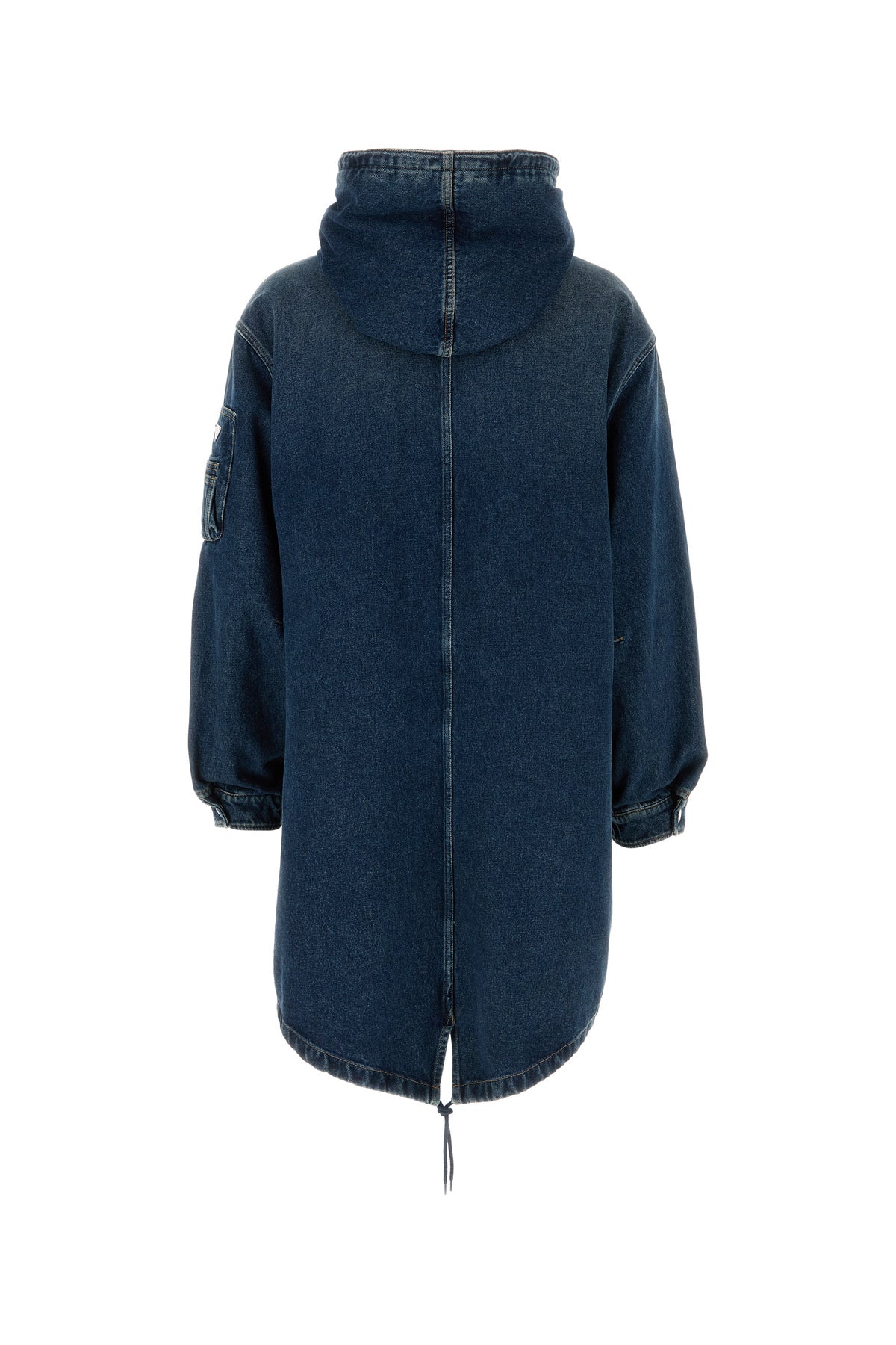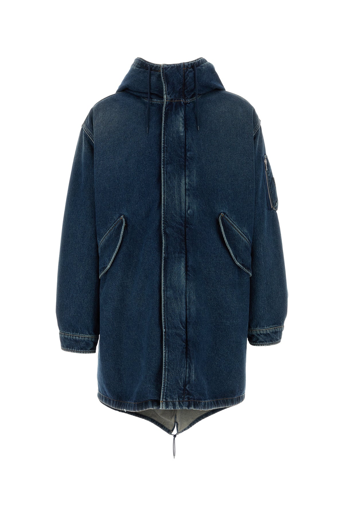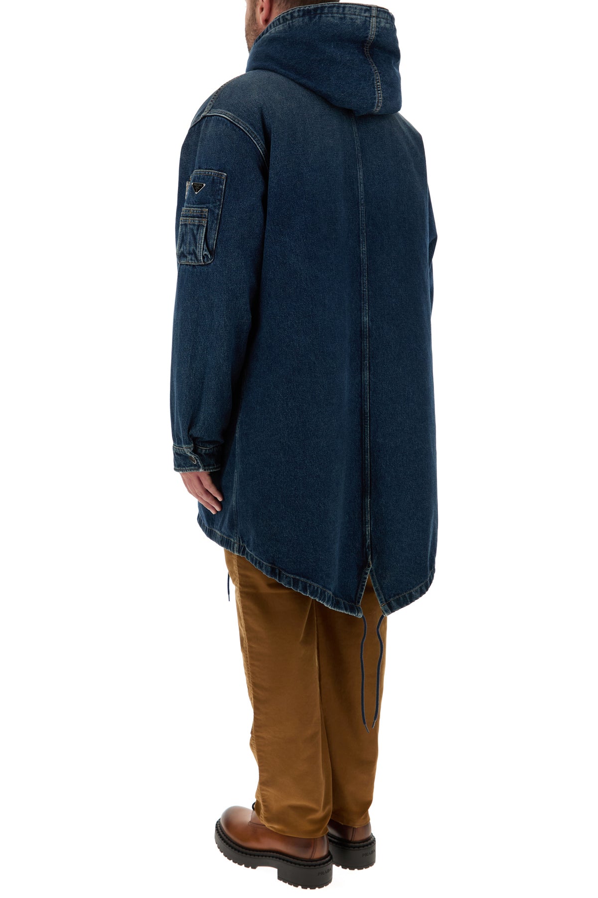 Cappotto realizzato in denim arricchito da iconico triangolo metallico logato sulla manica.