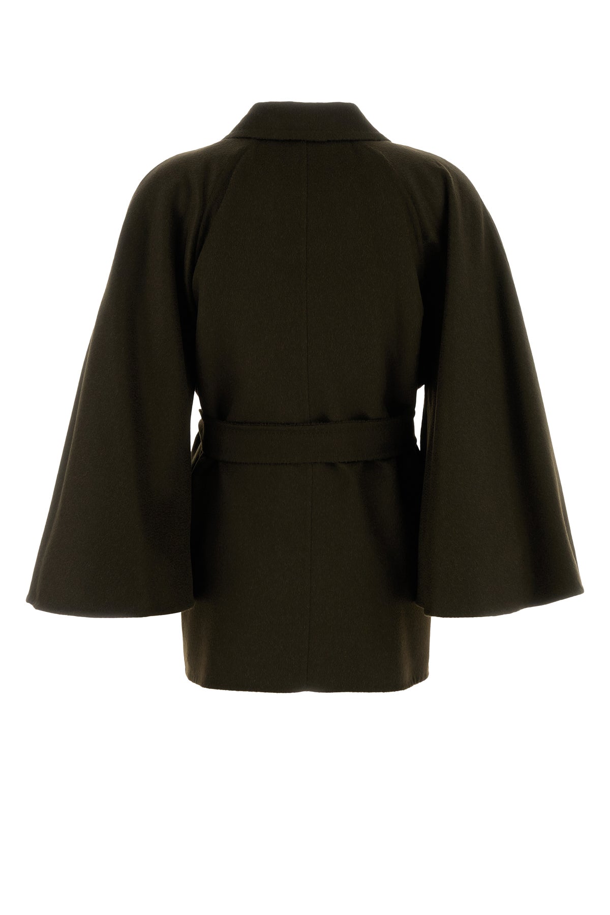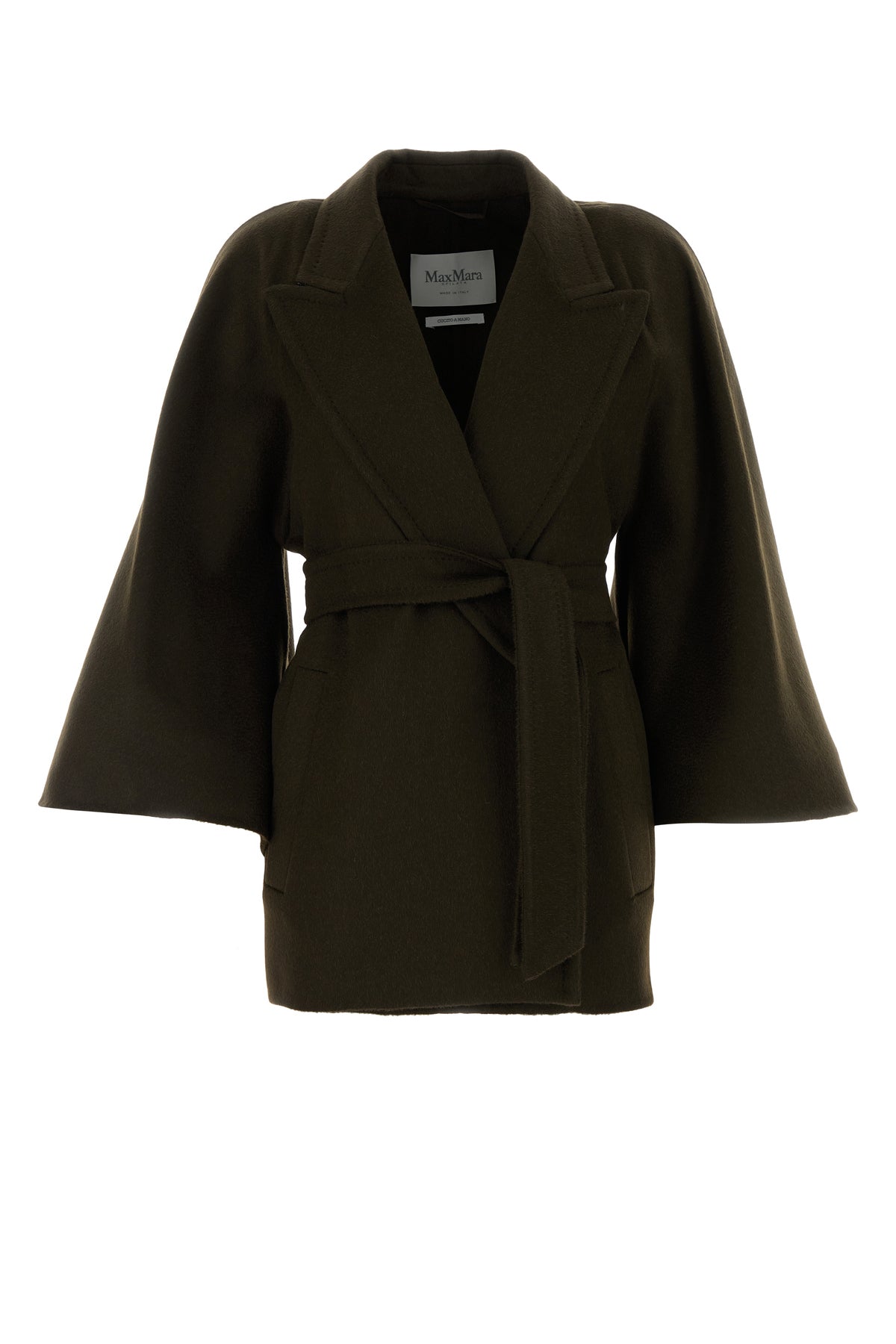 Cappotto dal taglio corto realizzato in puro cammello caratterizzato da chiusura mediante cintura da annodare in vita.