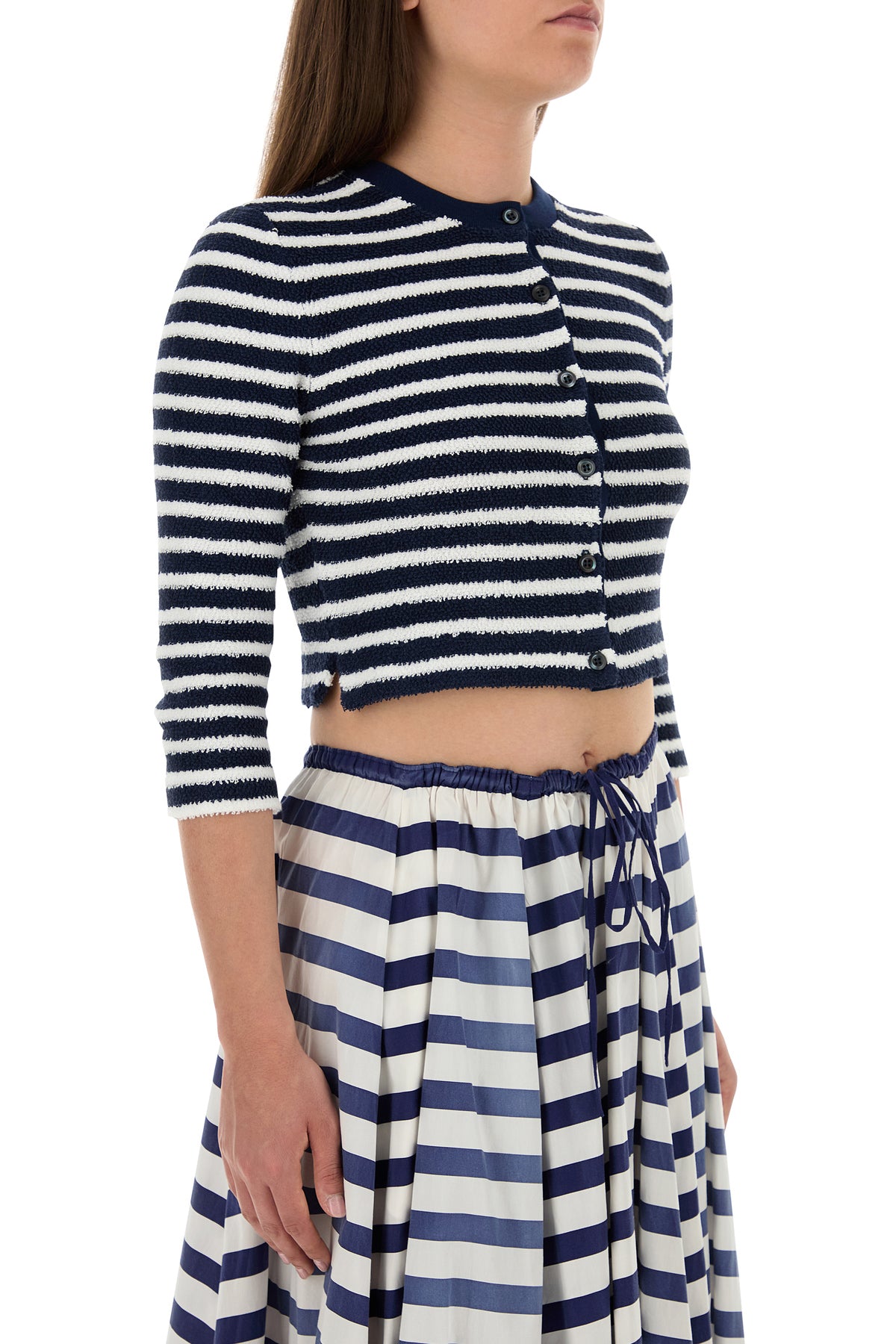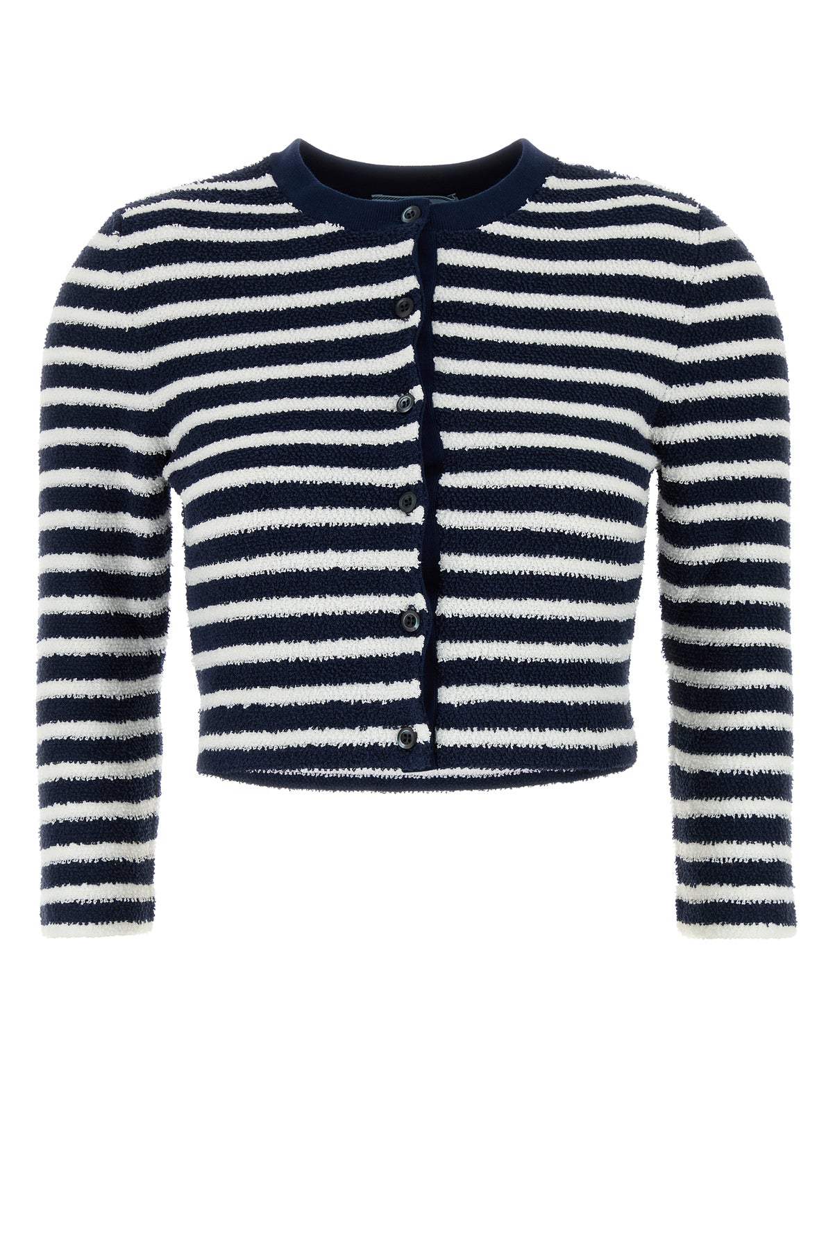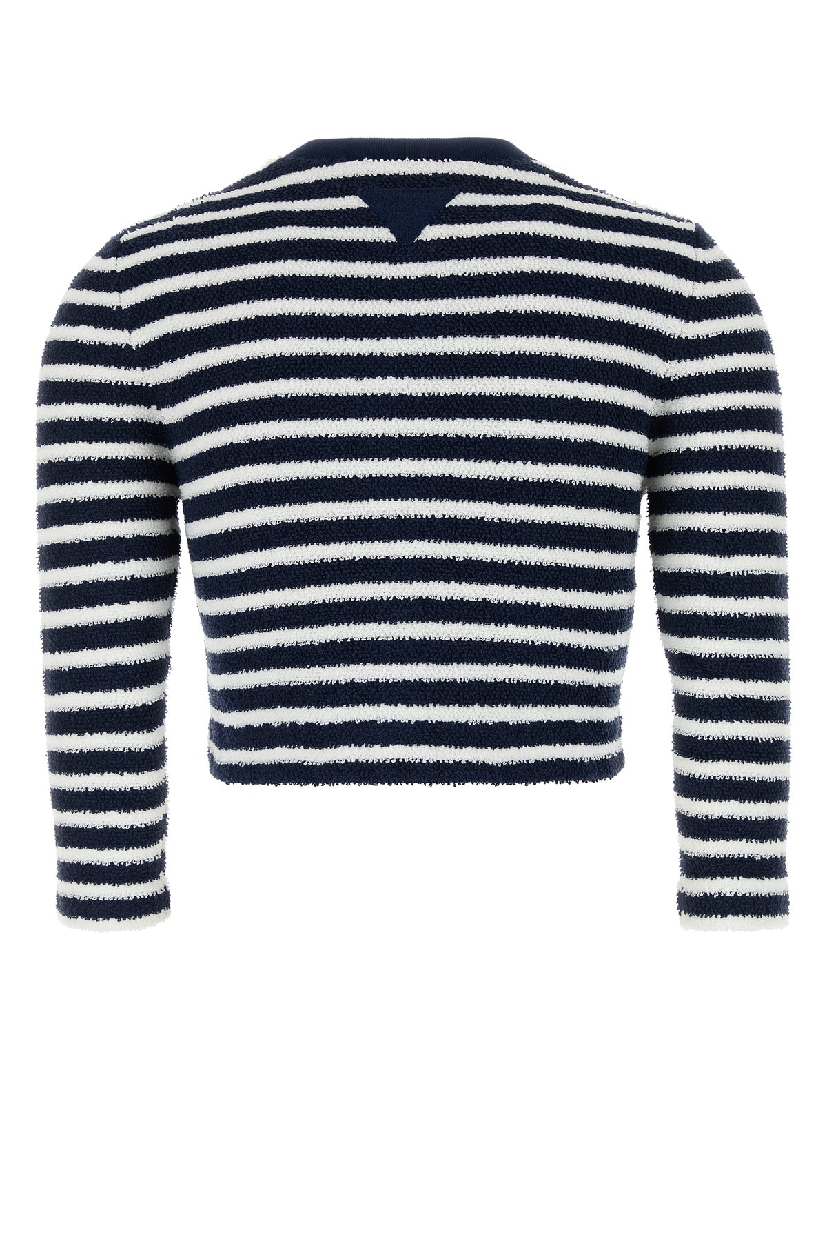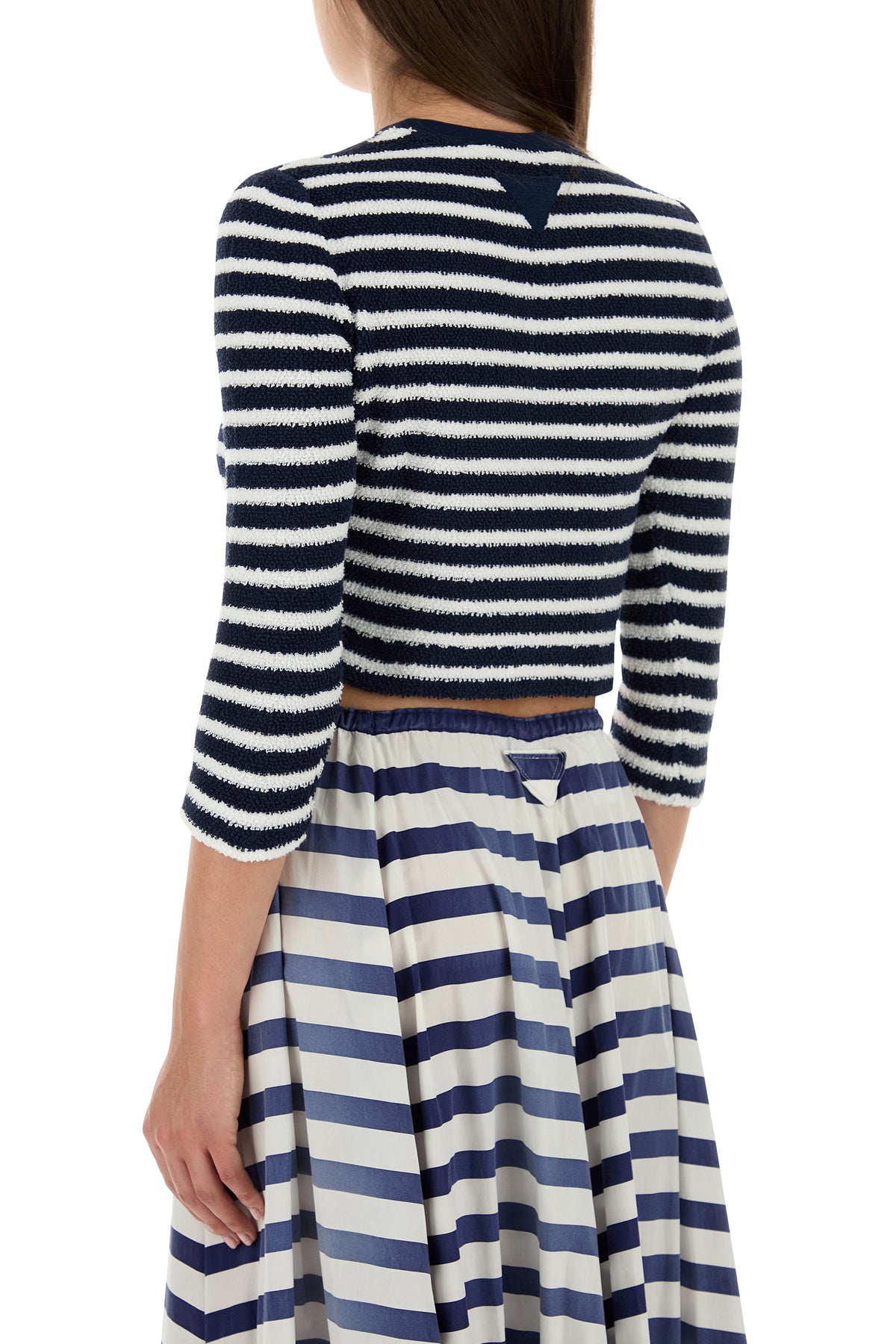 Cardigan dal taglio corto realizzato in bouclé di misto cotone caratterizzato da ricamo a righe su tutta la superficie arricchito da iconico triangolo in tessuto sul retro.