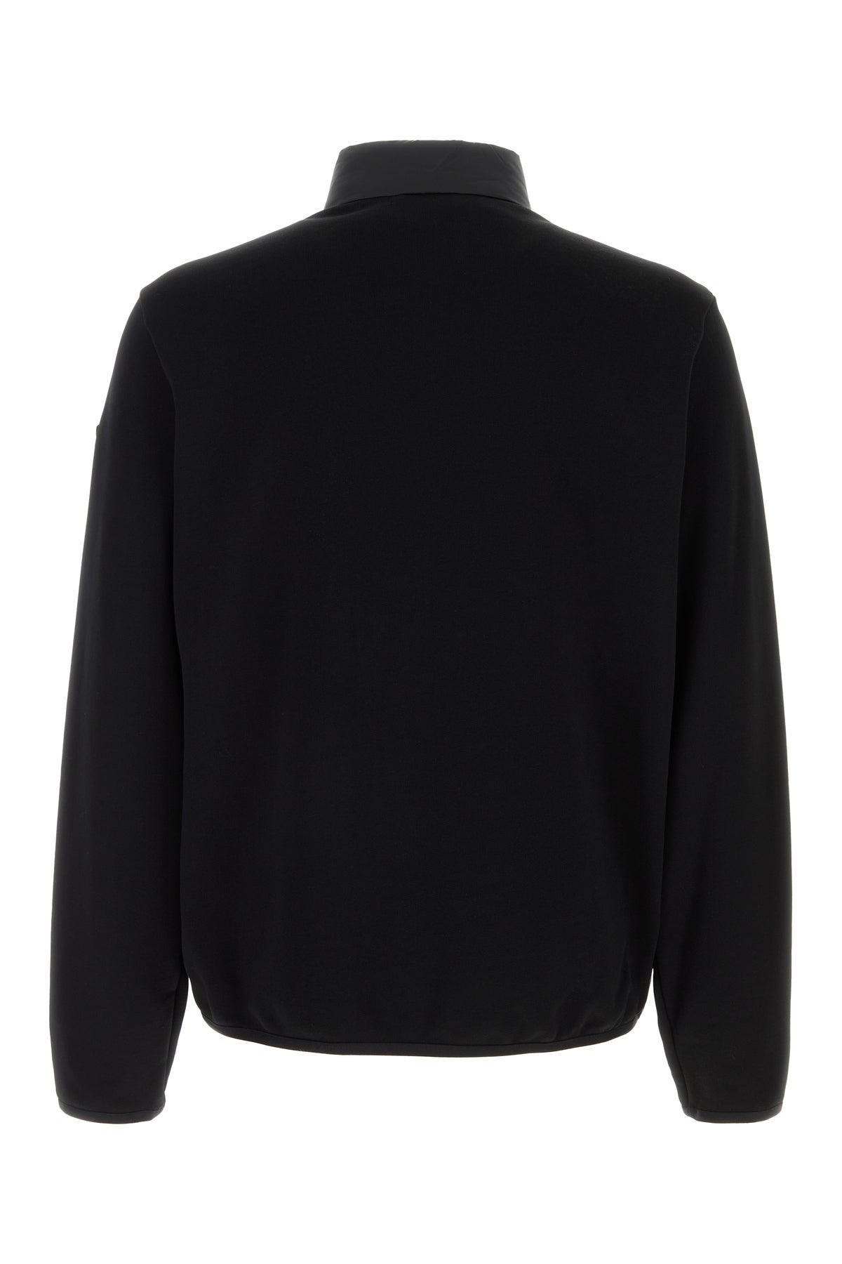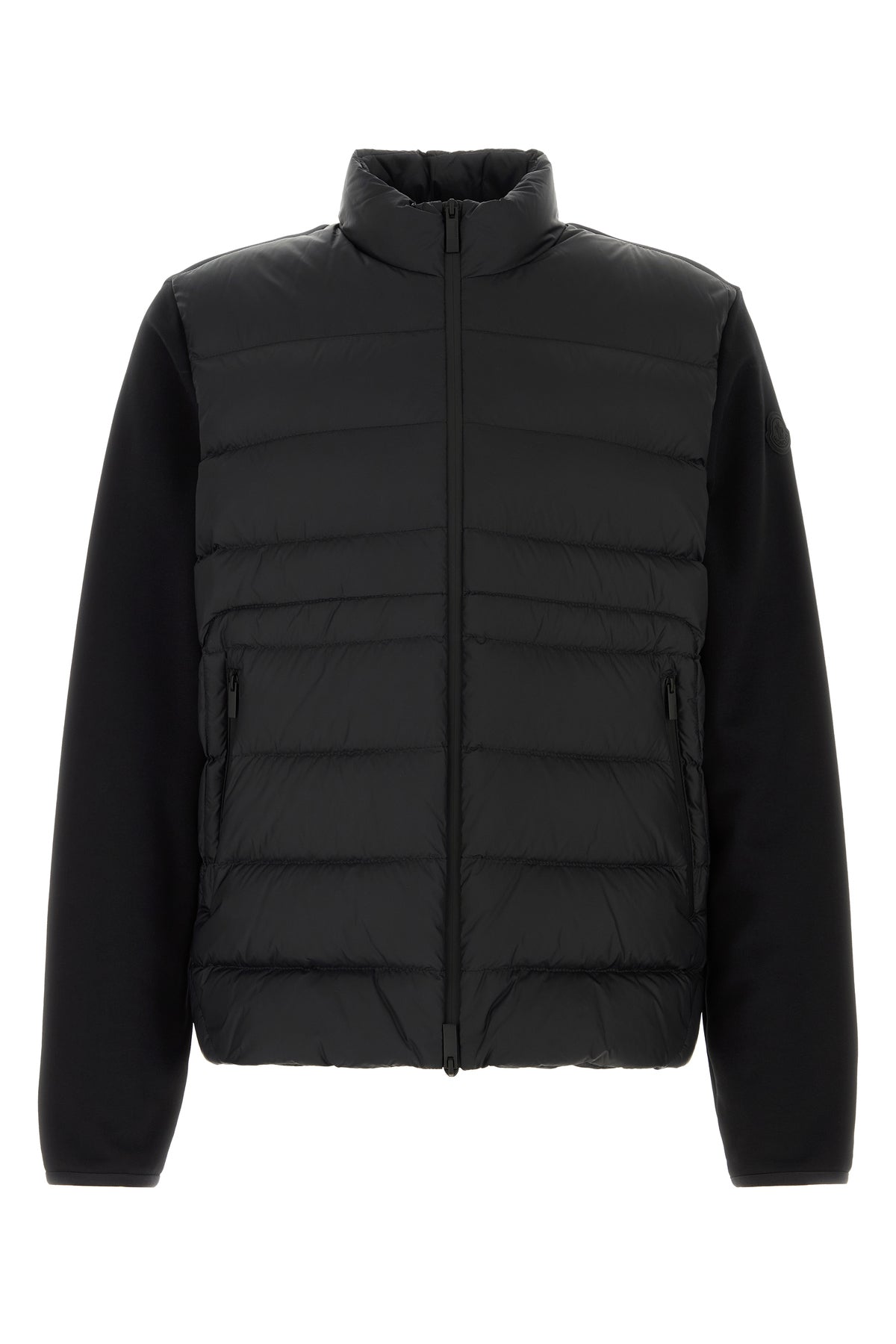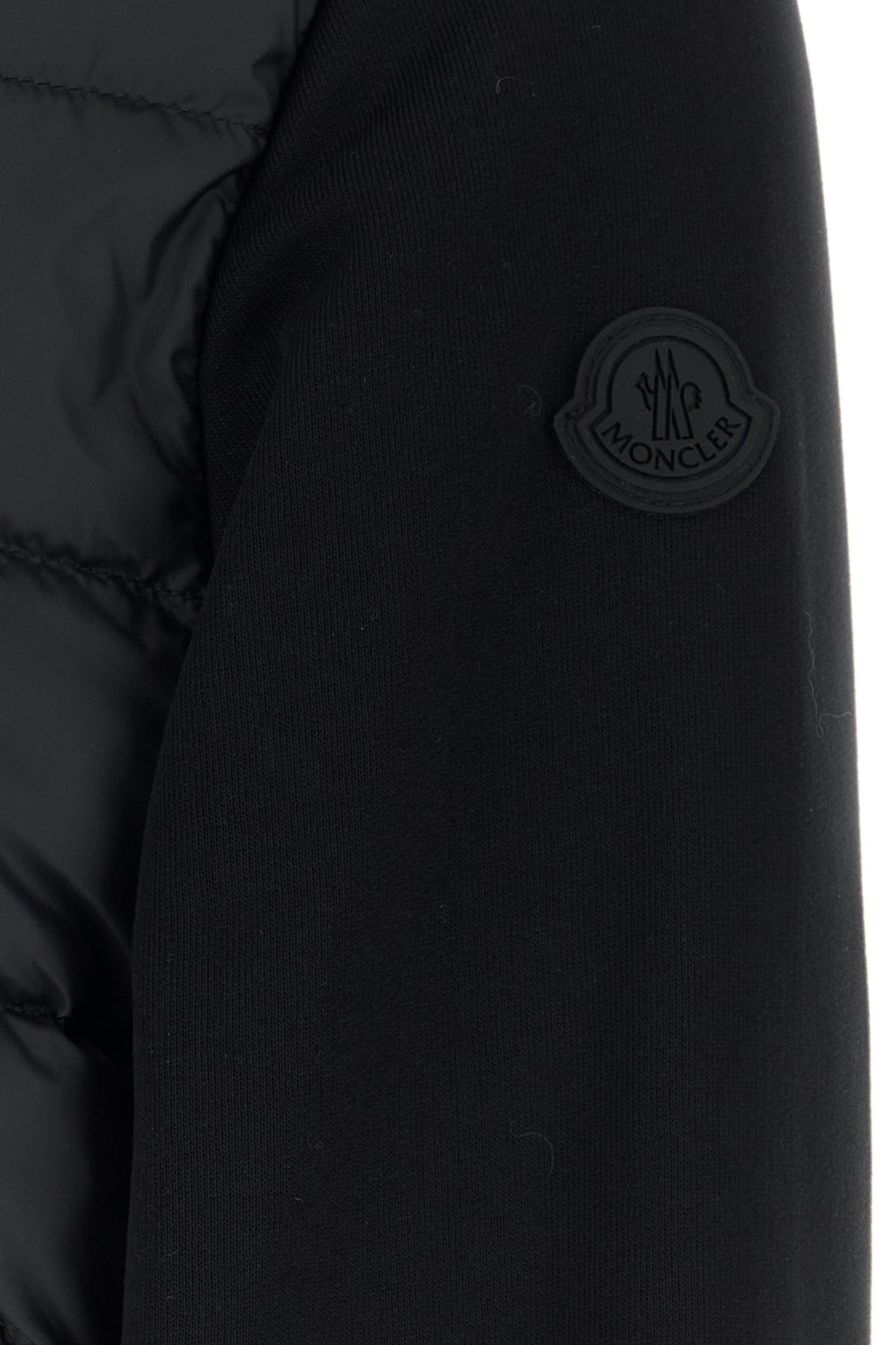 Cardigan realizzato in puro cotone con inserto in nylon trapuntato sulla parte frontale arricchito da applicazione logata gommata sulla manica.
