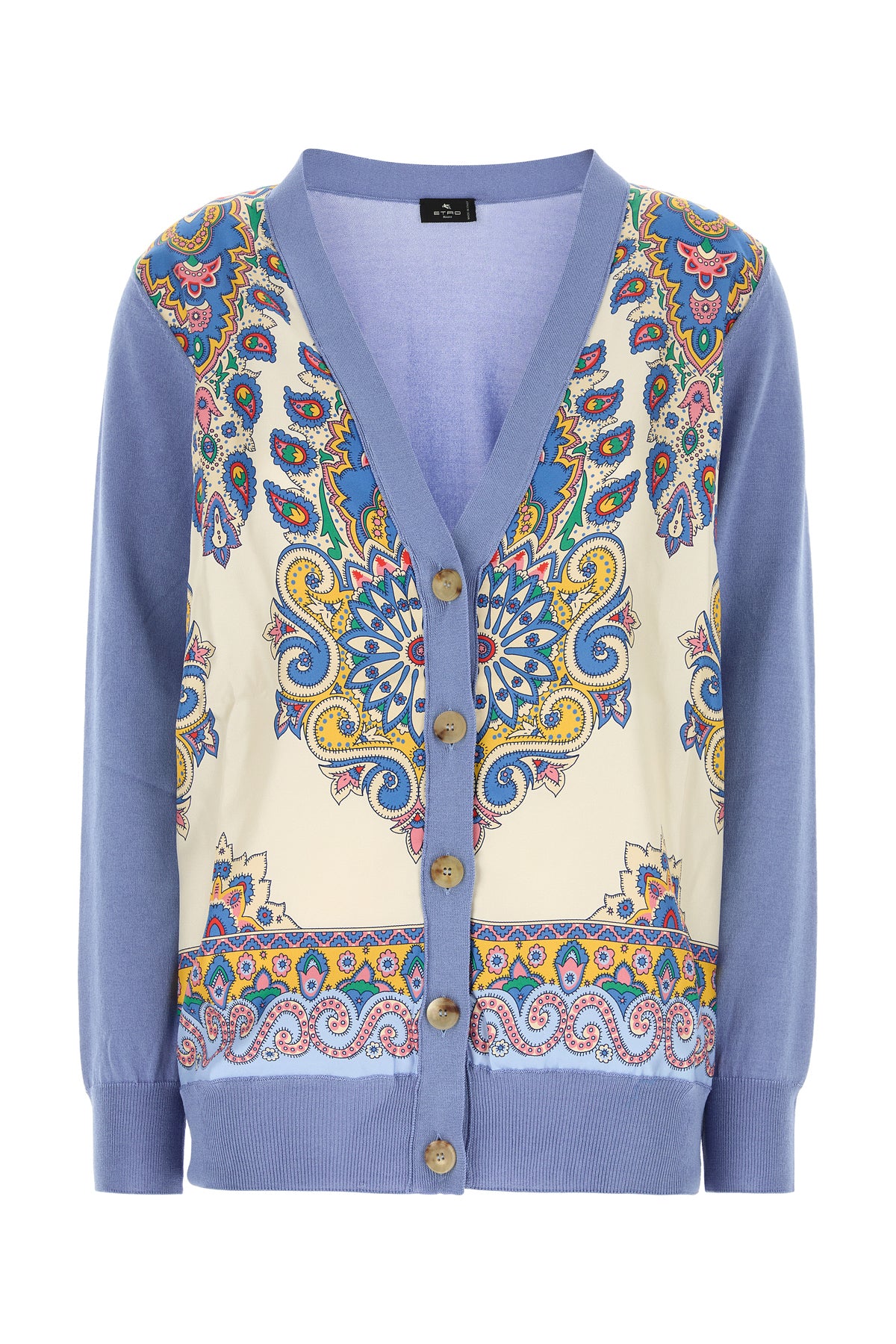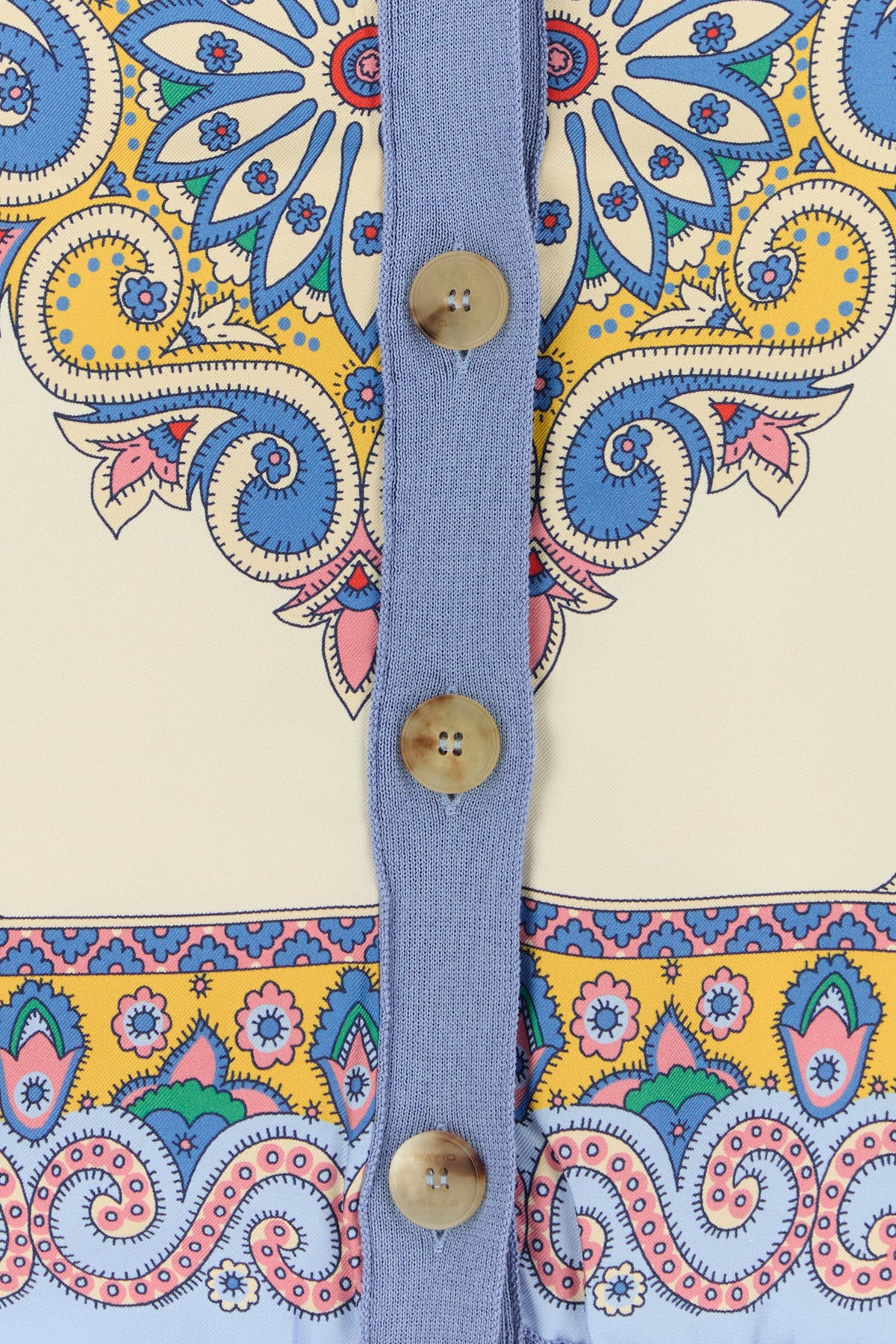 Cardigan realizzato in misto cotone con inserto in seta con particolare stampa sulla parte frontale.