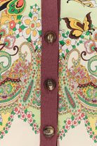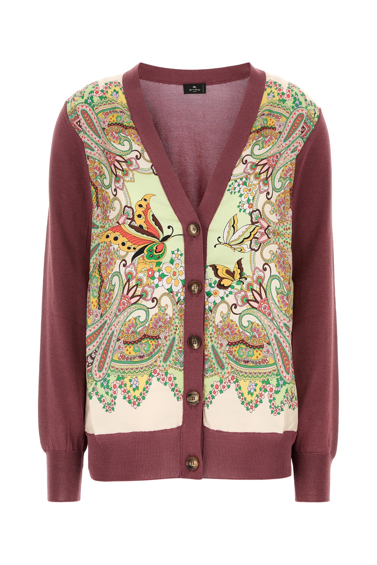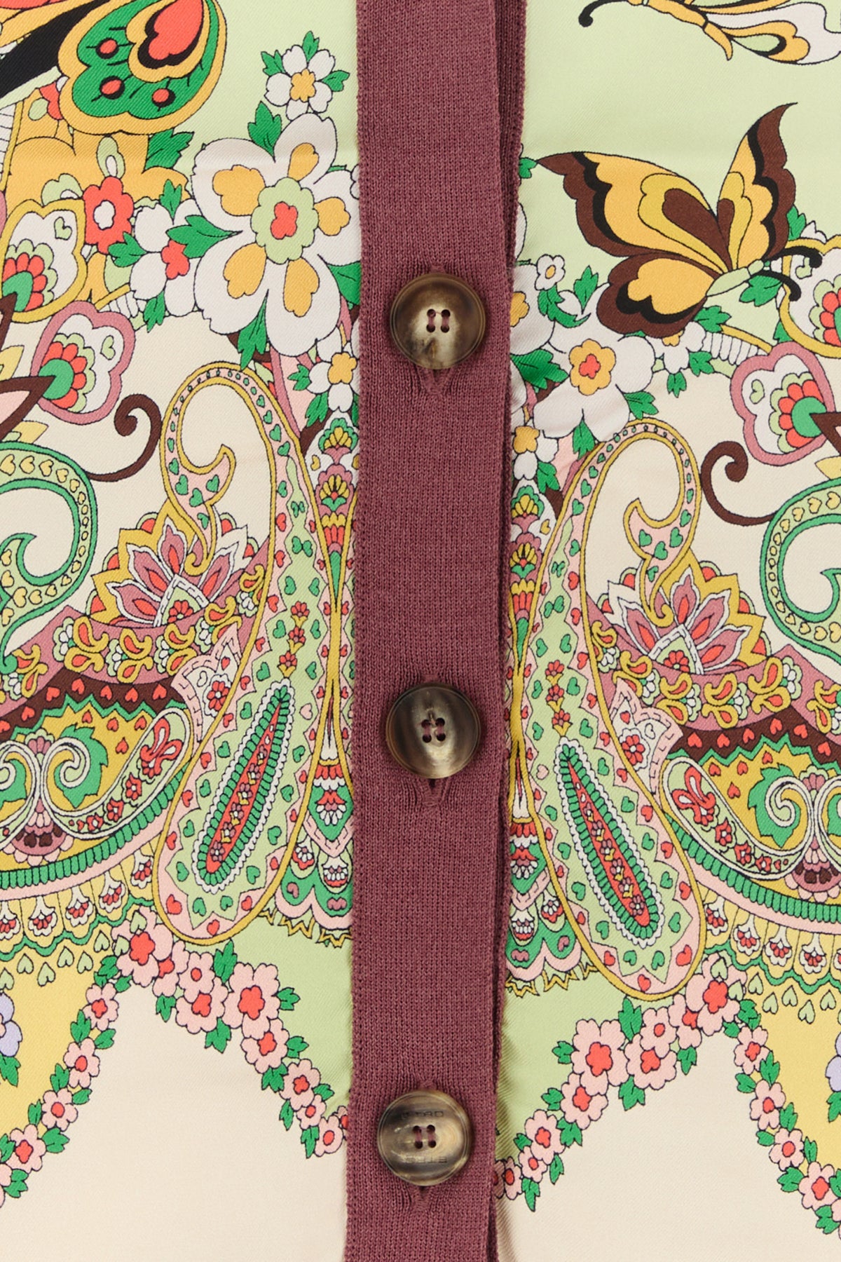 Cardigan realizzato in misto cotone con inserto in seta con particolare stampa sulla parte frontale.