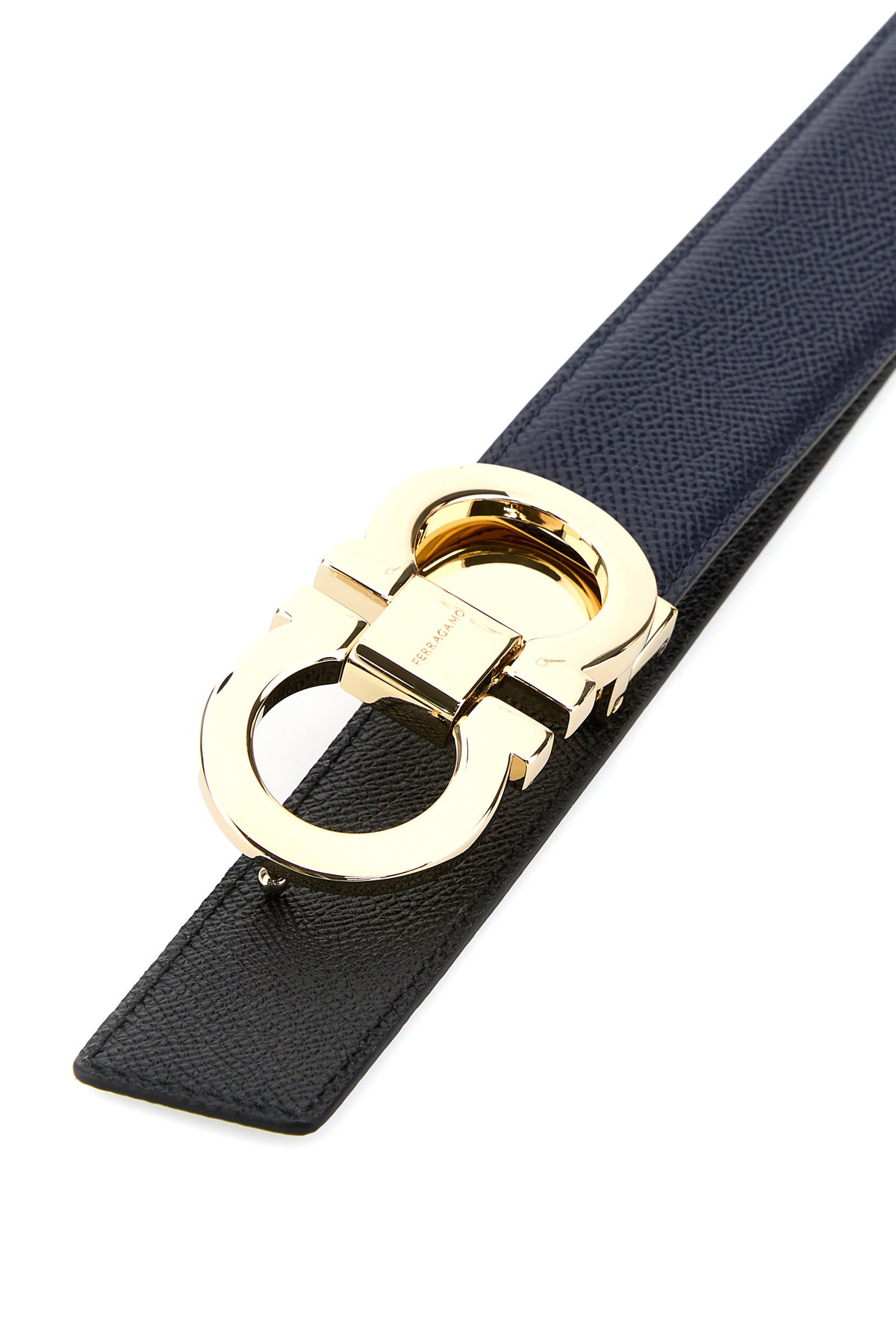 Cintura reversibile realizzata in pelle di vitello zigrinata arricchita da fibbia Gancini in metallo.