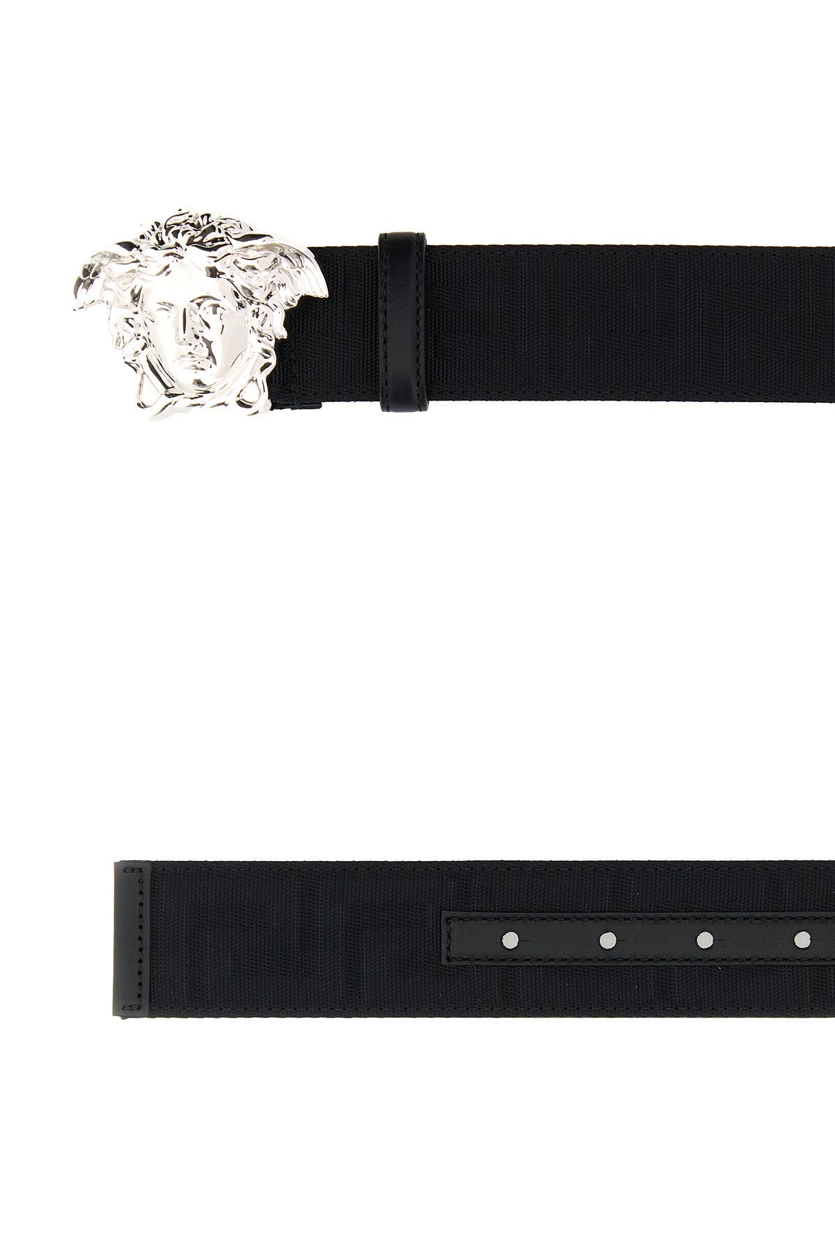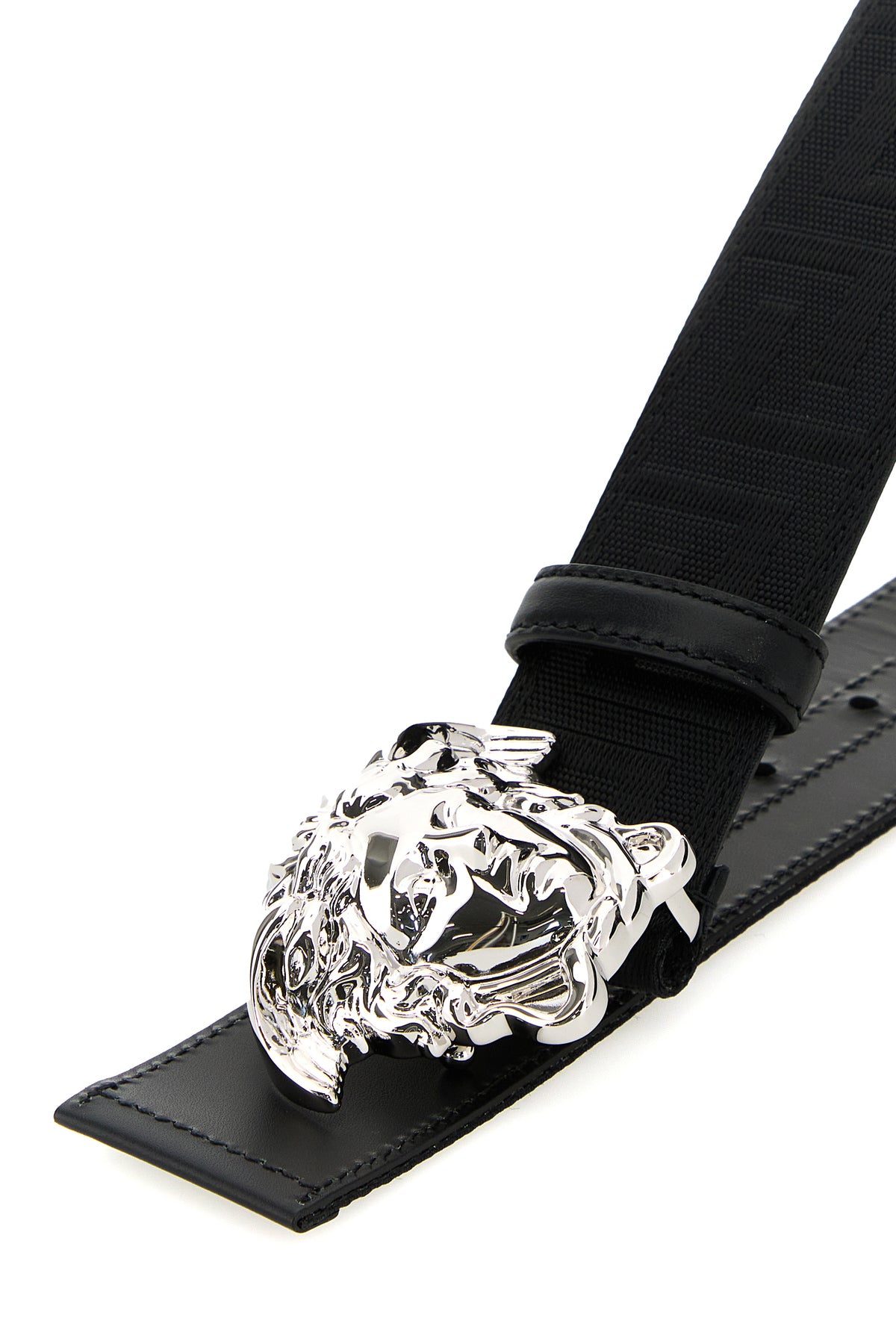 Cintura realizzata in tessuto caratterizzata da ricamo La Greca tonale su tutta la superficie arricchita da fibbia iconica Testa di Medusa in metallo.