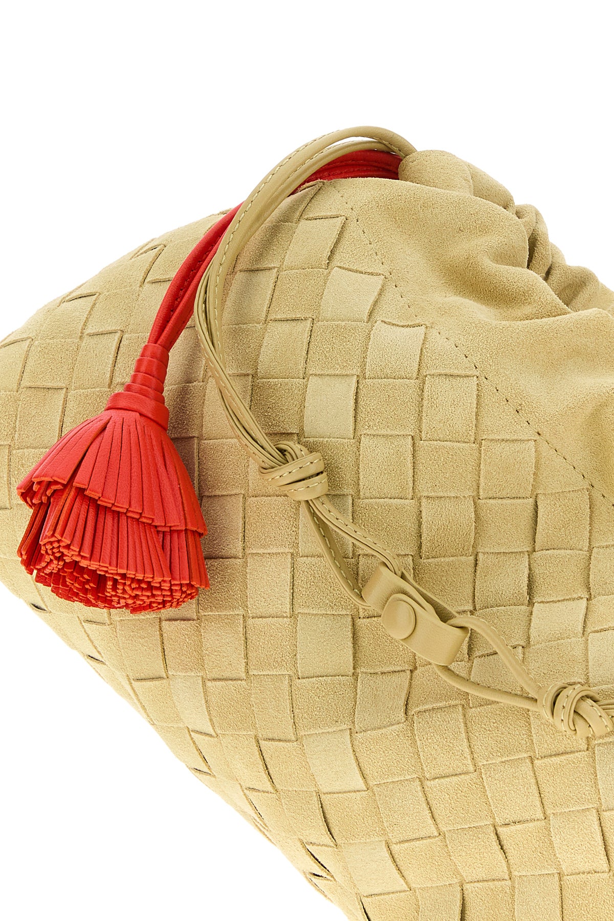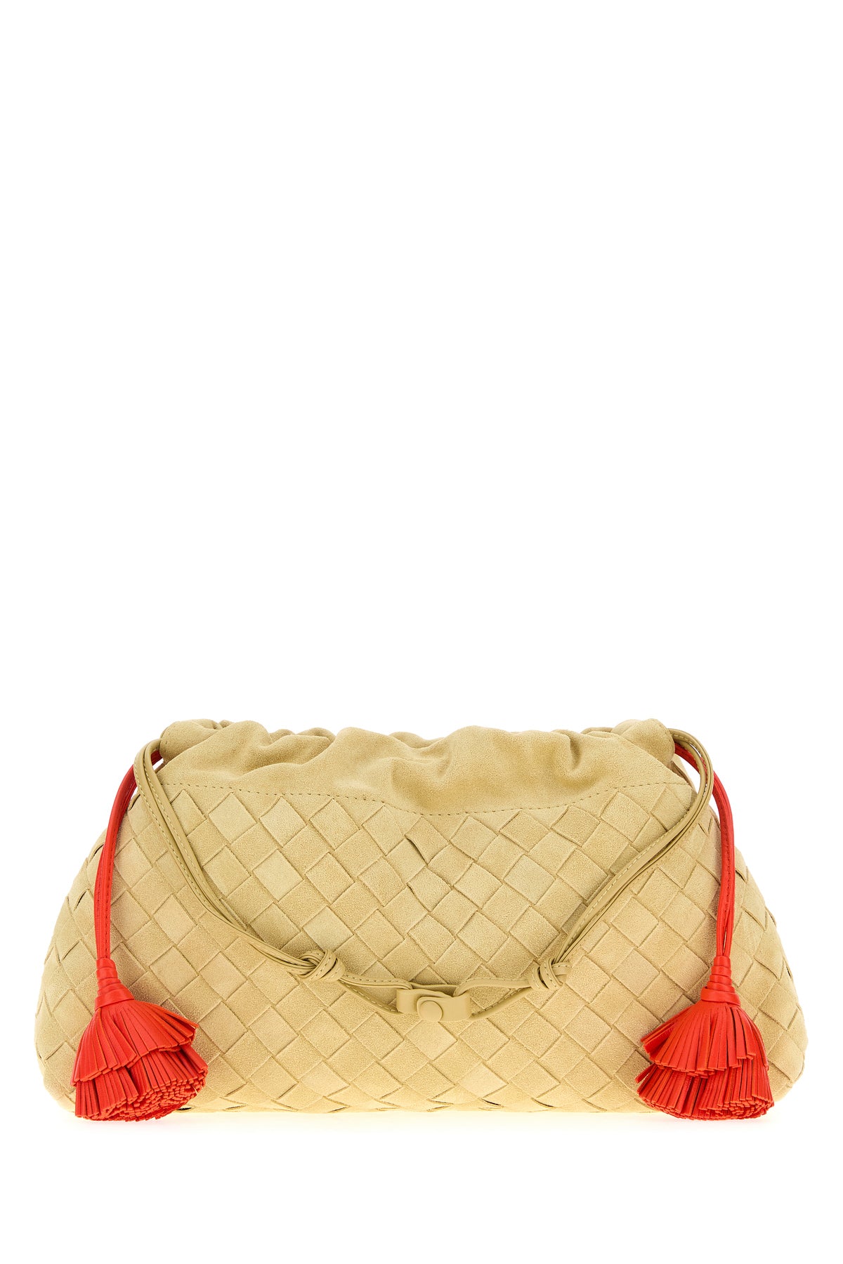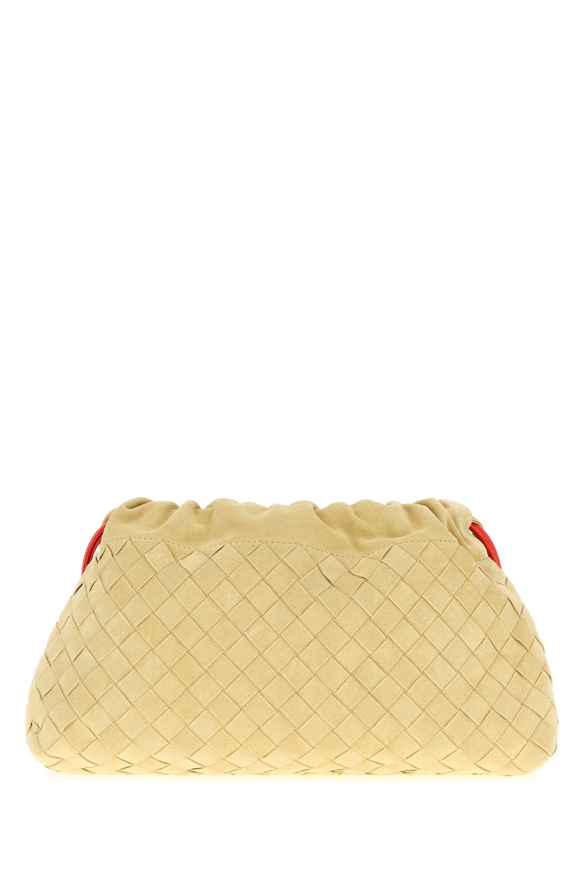Clutch realizzata in pelle scamosciata caratterizzata da iconico motivo Intrecciato su tutta la superficie.
