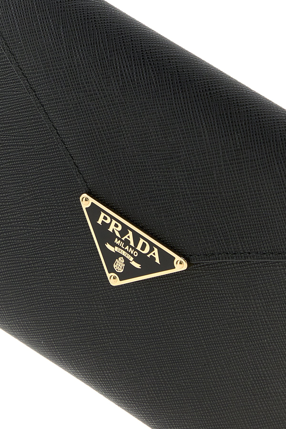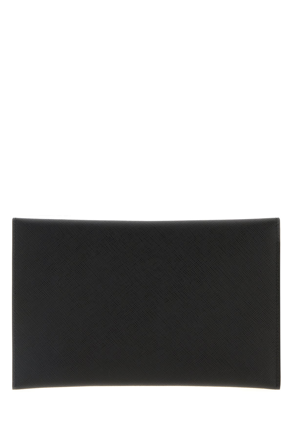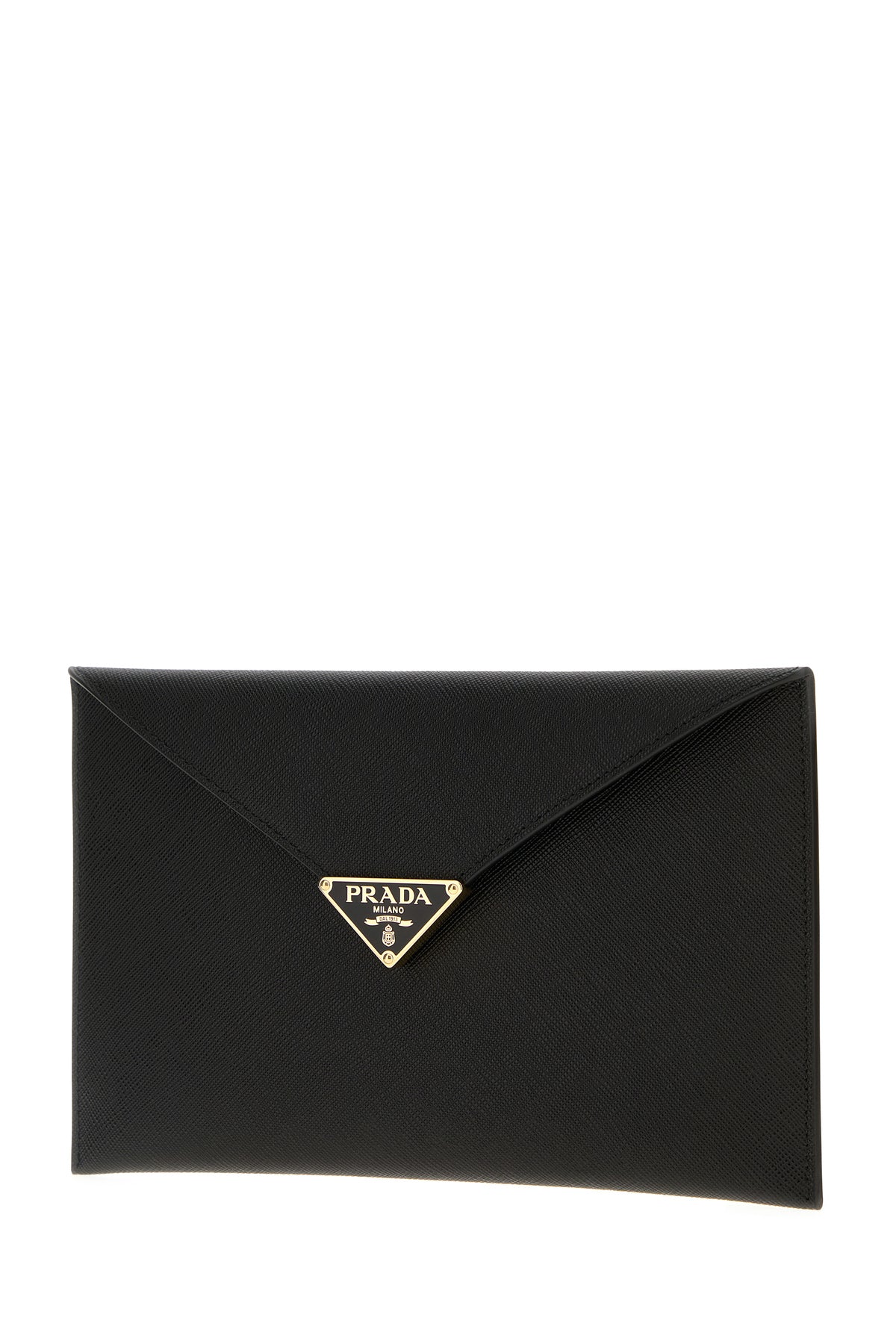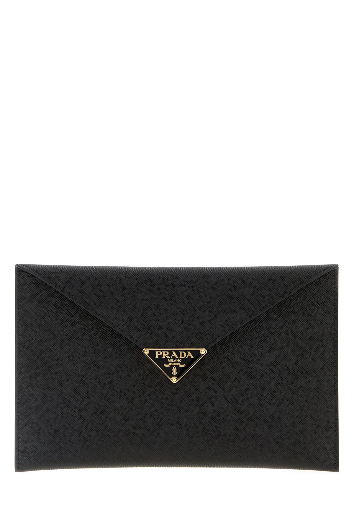 Clutch realizzata in pelle zigrinata arricchita da iconico triangolo metallico logato sulla parte frontale.