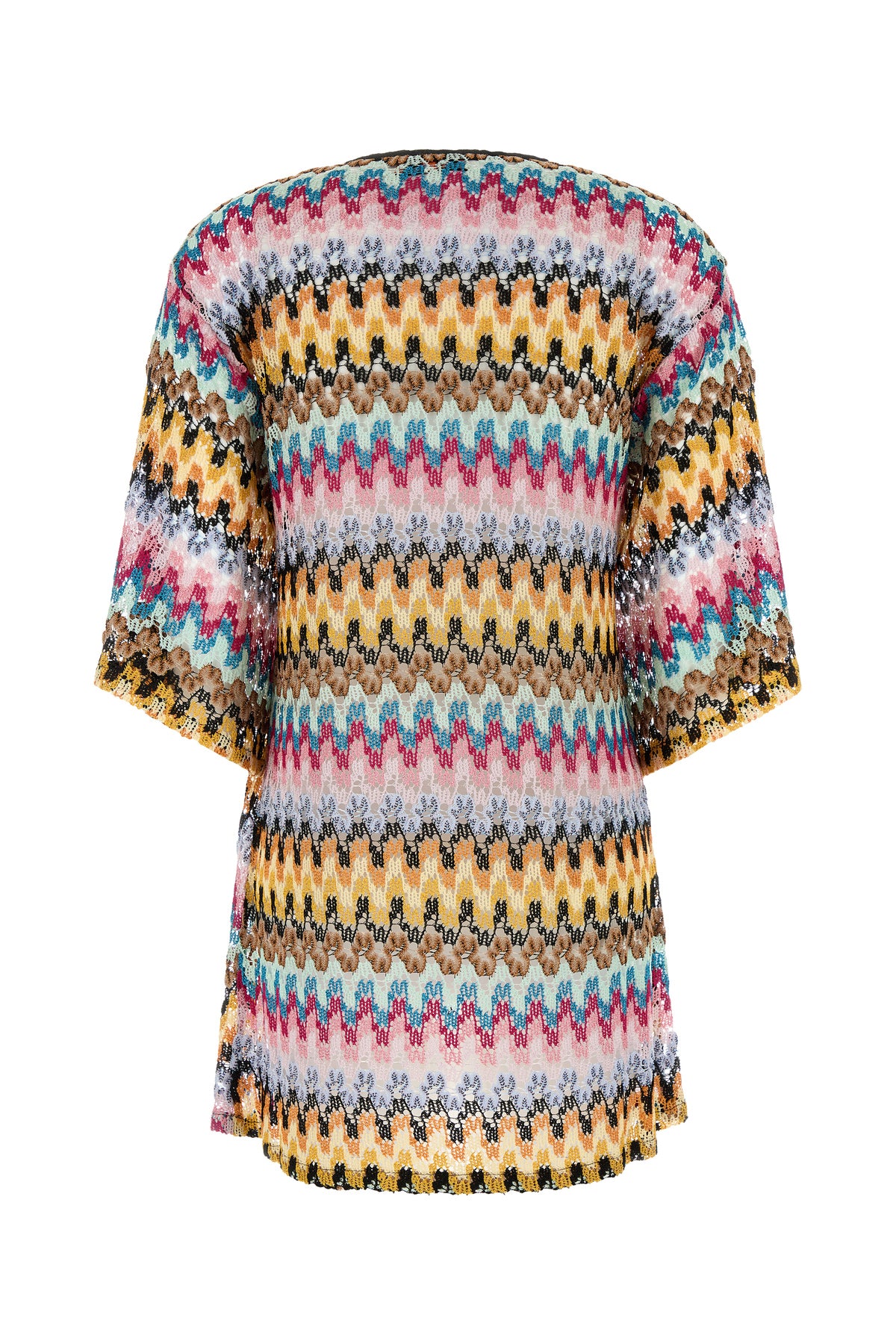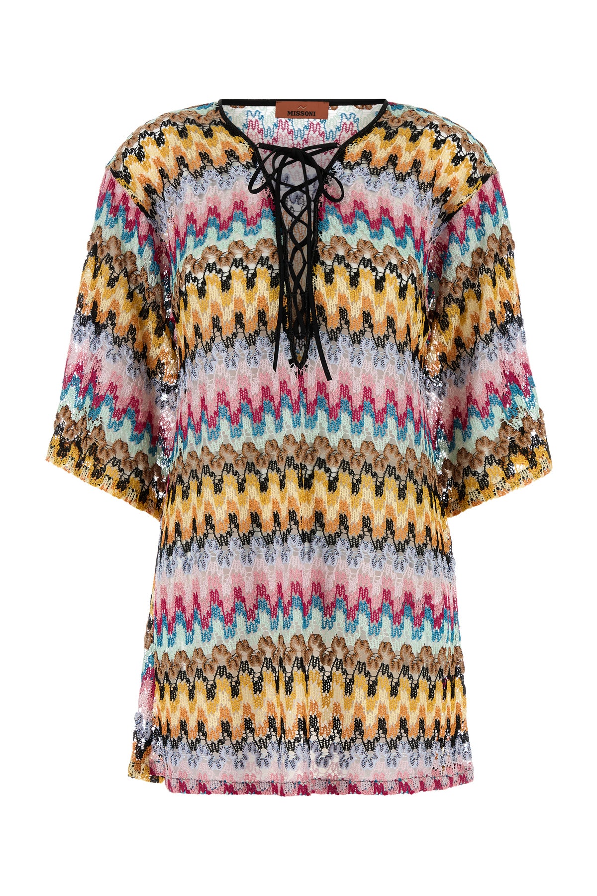 Copricostume realizzato in misto viscosa con fili in lurex caratterizzato da lacci da annodare sulla scollatura.