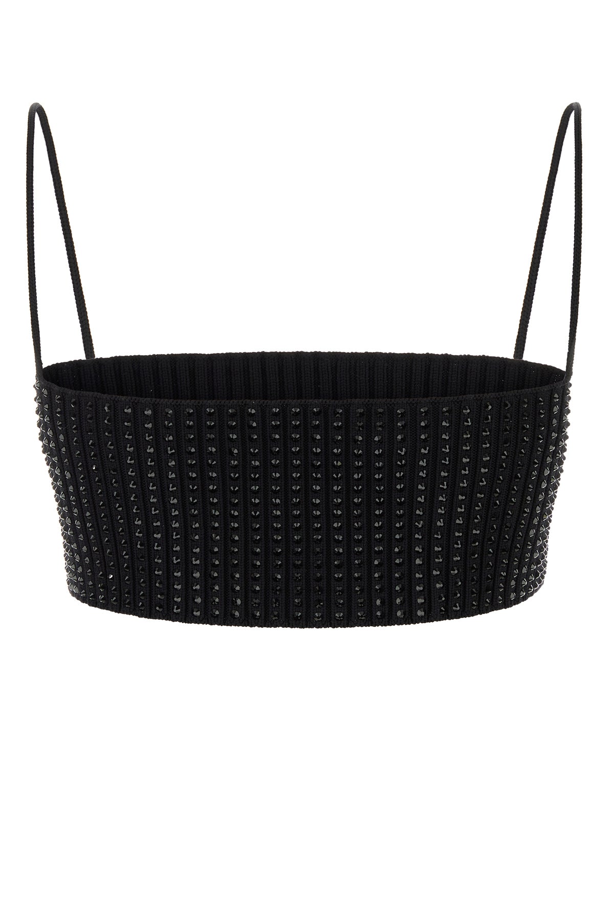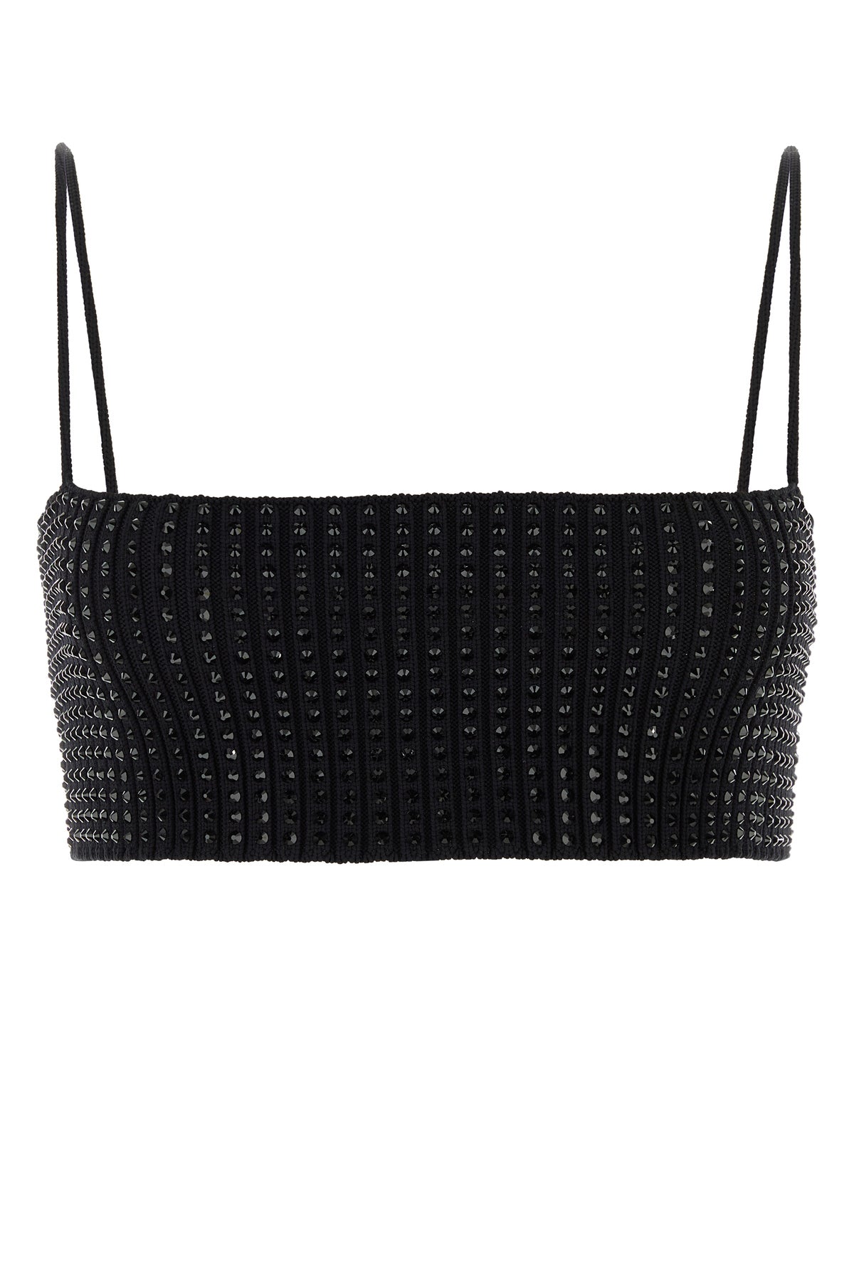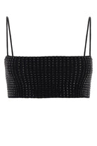 Crop top realizzato in nylon stretch a costine con cristalli tonali su tutta la superficie.