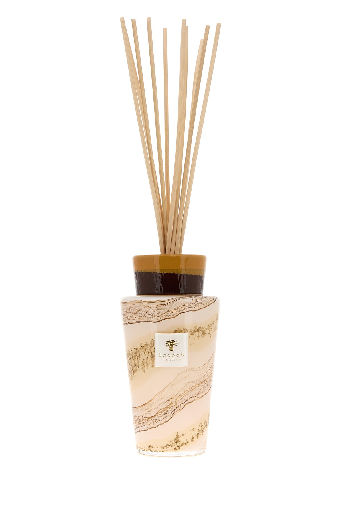 Il diffusore di fragranze Totem Siloli vanta un tappo in ceramica artigianale marrone e beige che riprende i colori del vetro.