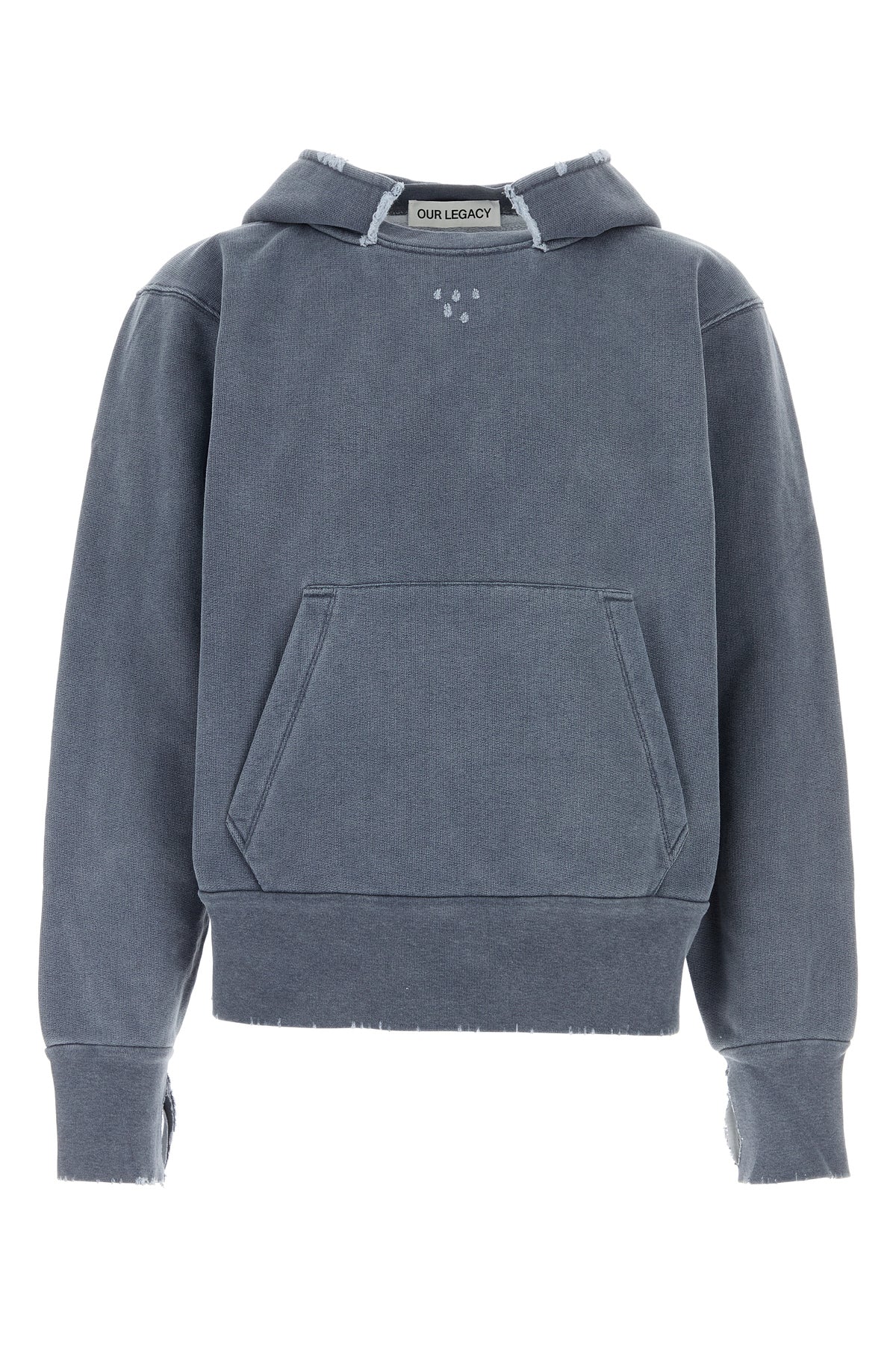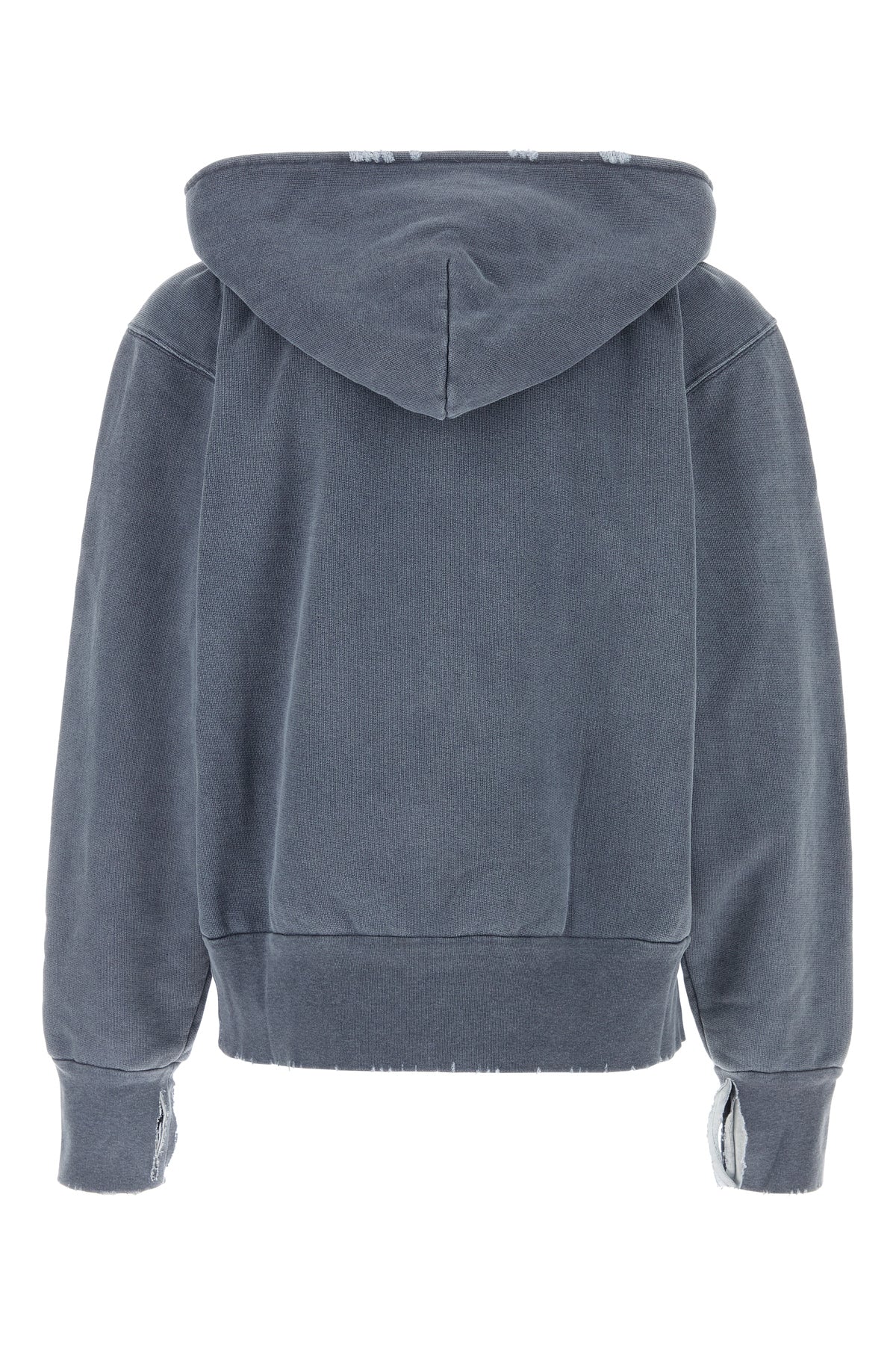 Felpa realizzata in puro cotone slavato e sdrucito con strappi intenzionali.