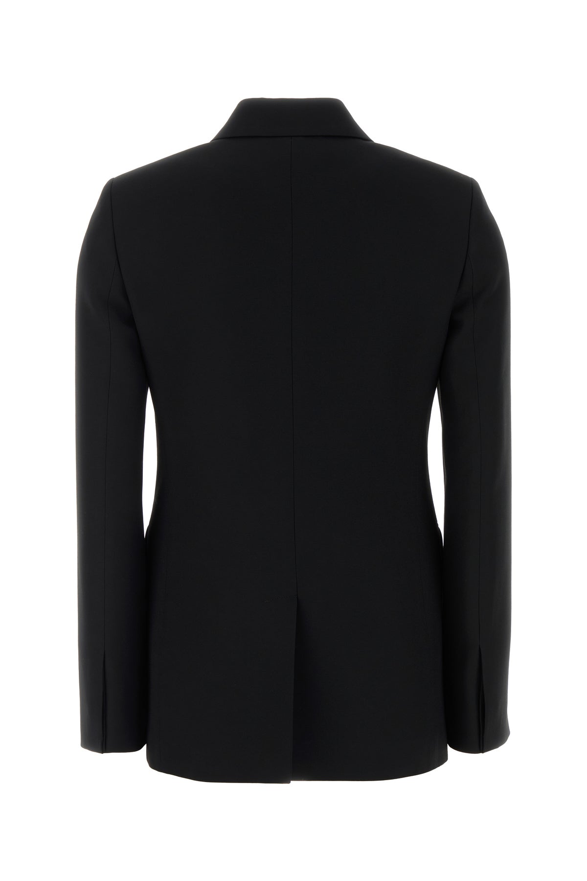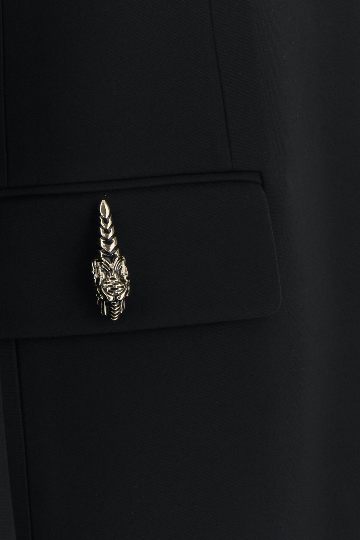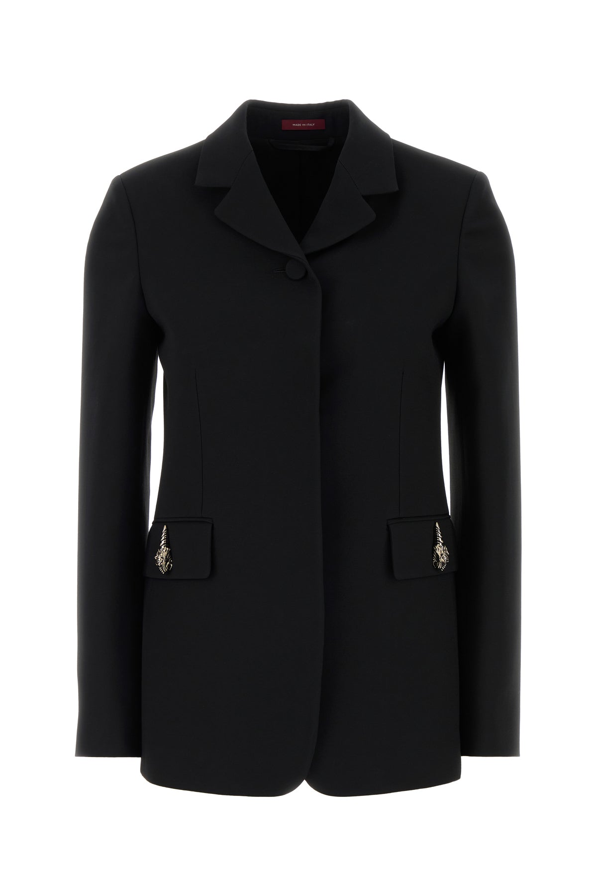 Giacca realizzata in cady di seta e lana arricchita da dettagli metallici logati sulla parte frontale.