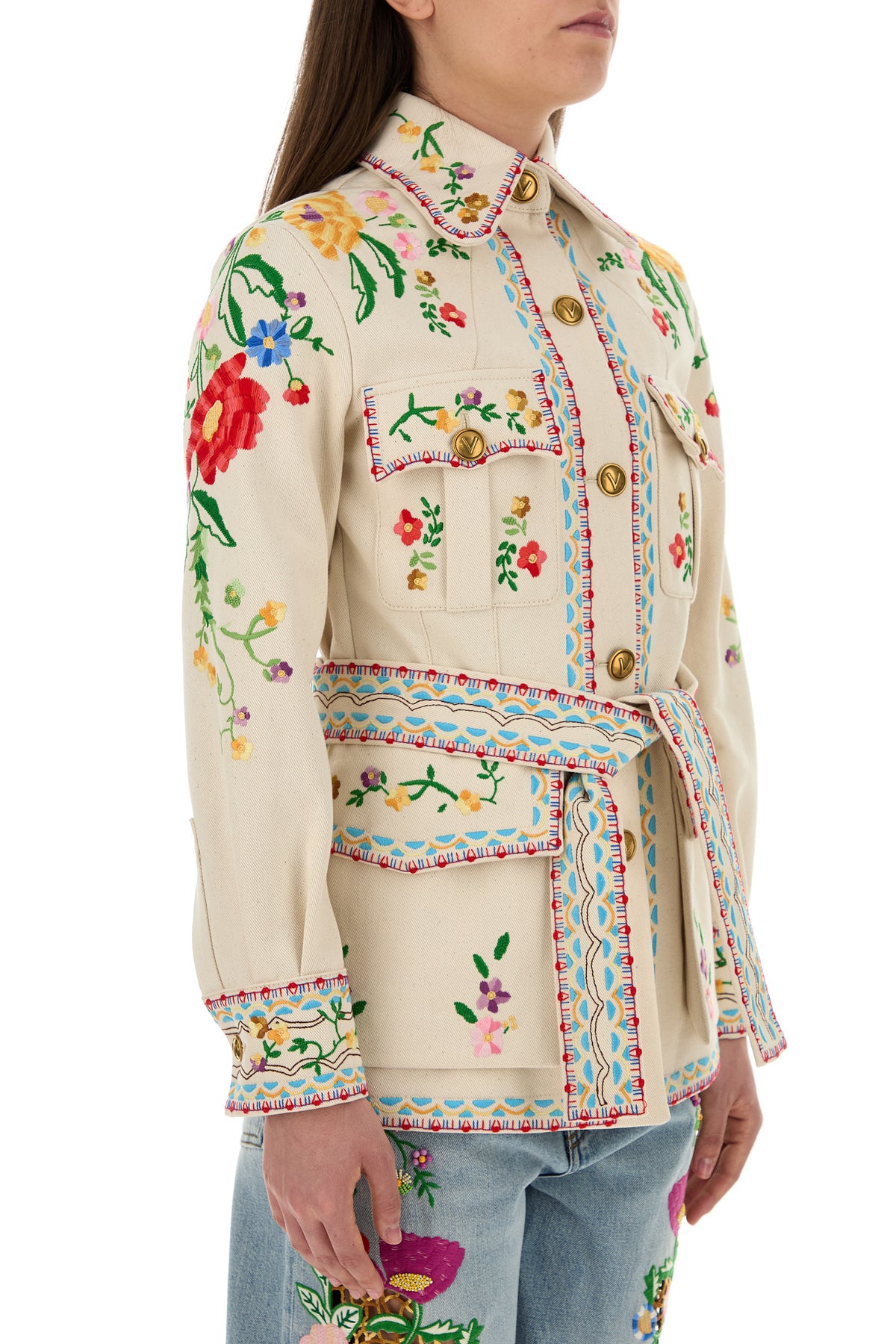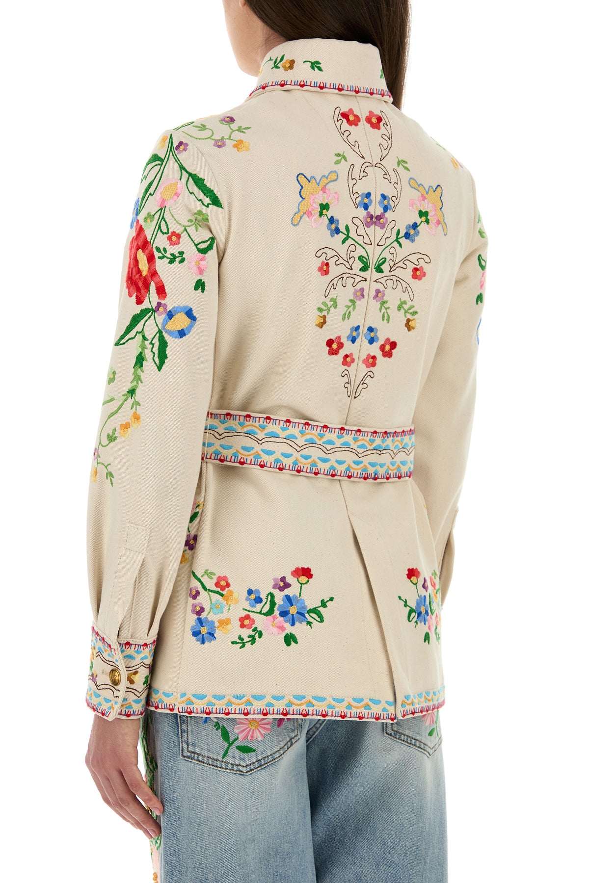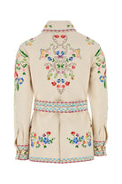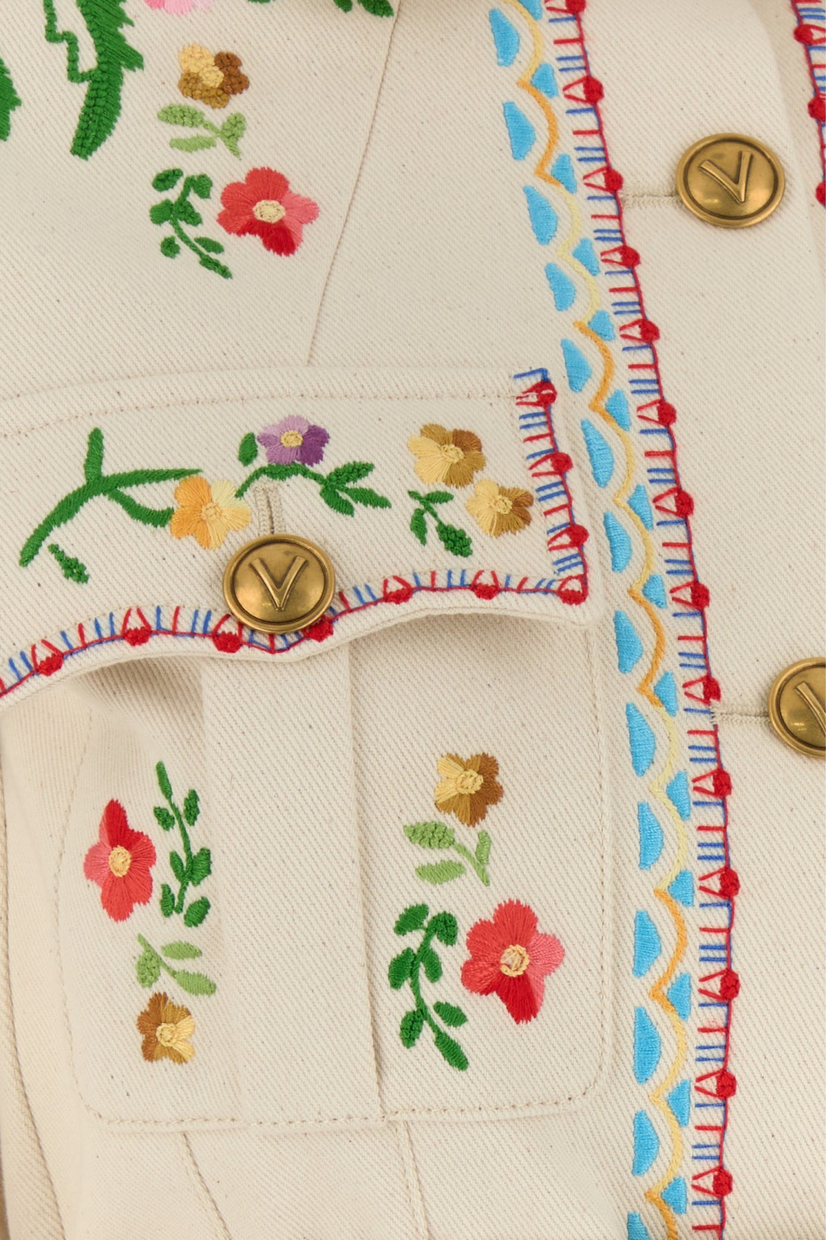 Giacca dal taglio lungo realizzata in denim di puro cotone caratterizzata da particolare ricamo floreale su tutta la superficie.