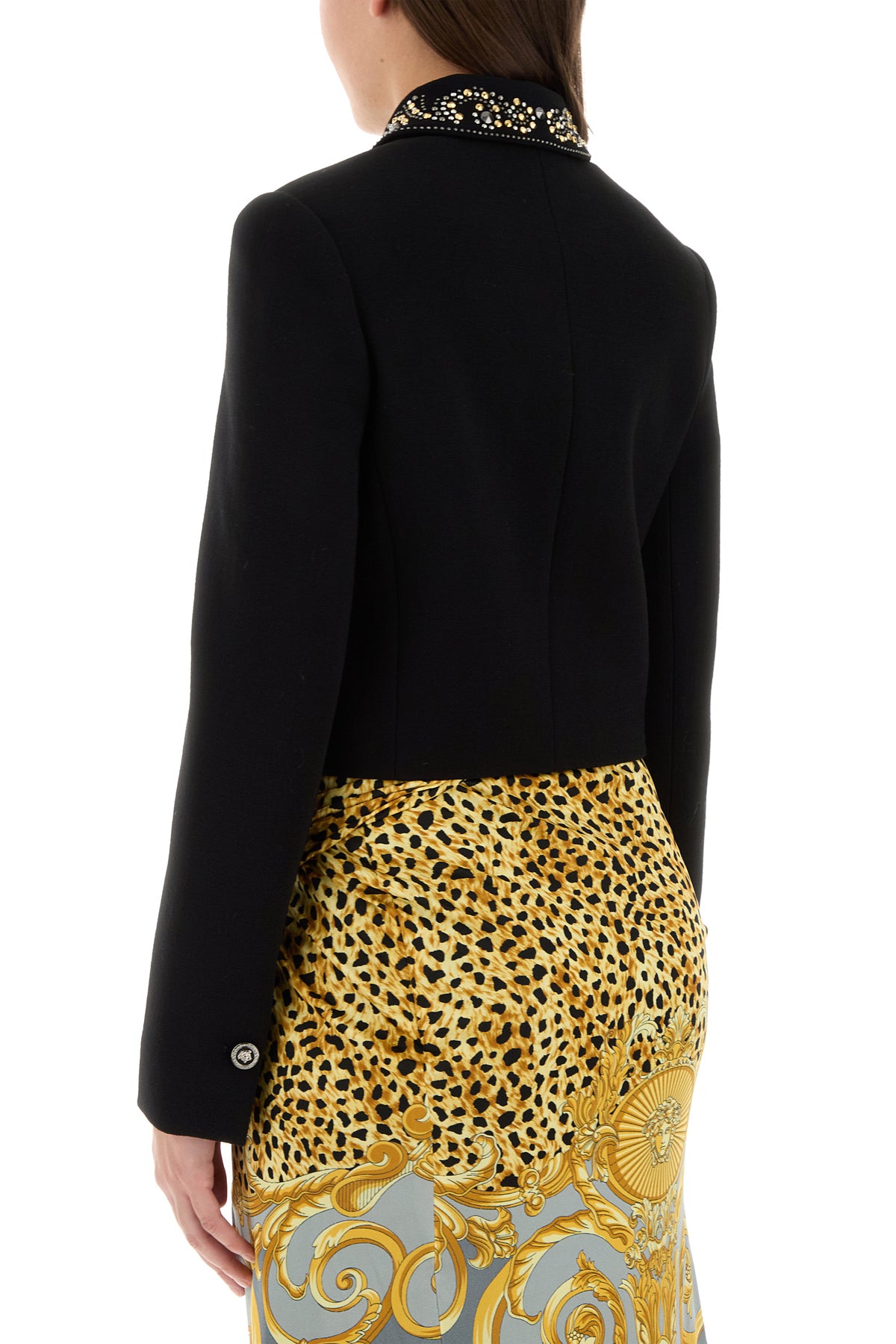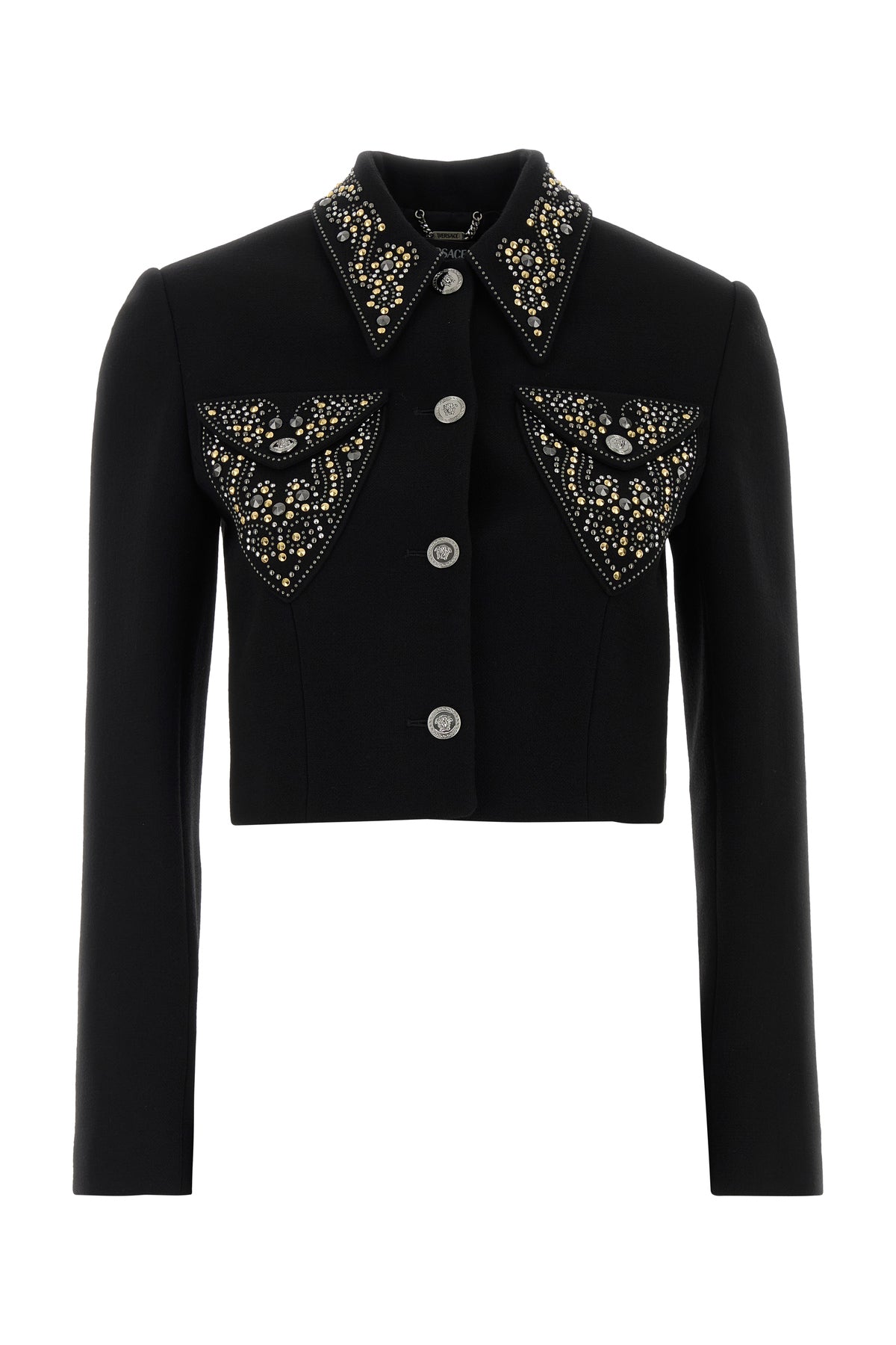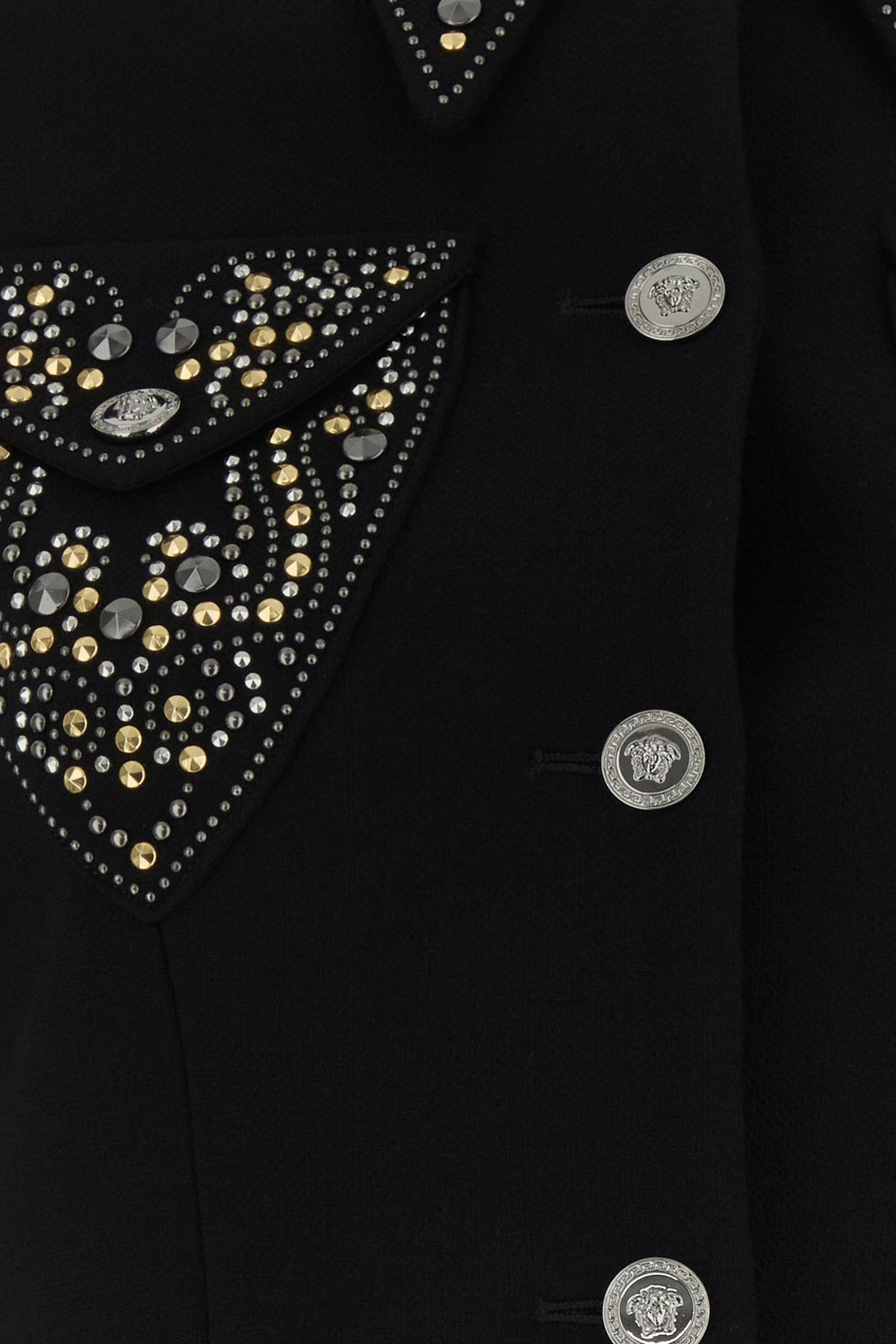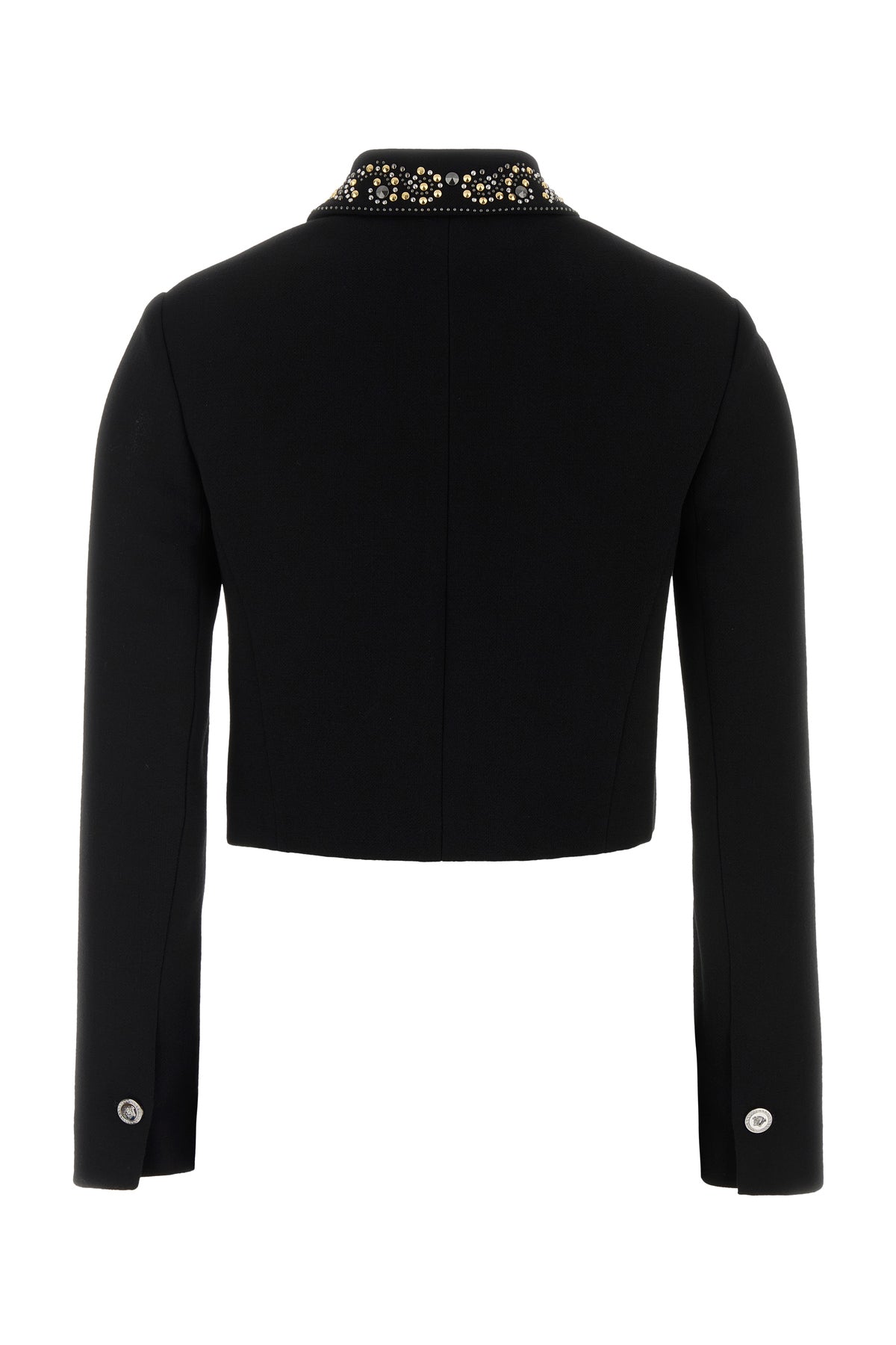 Giacca realizzata in misto lana arricchita da borchie metalliche sul colletto e sui taschini sul petto.