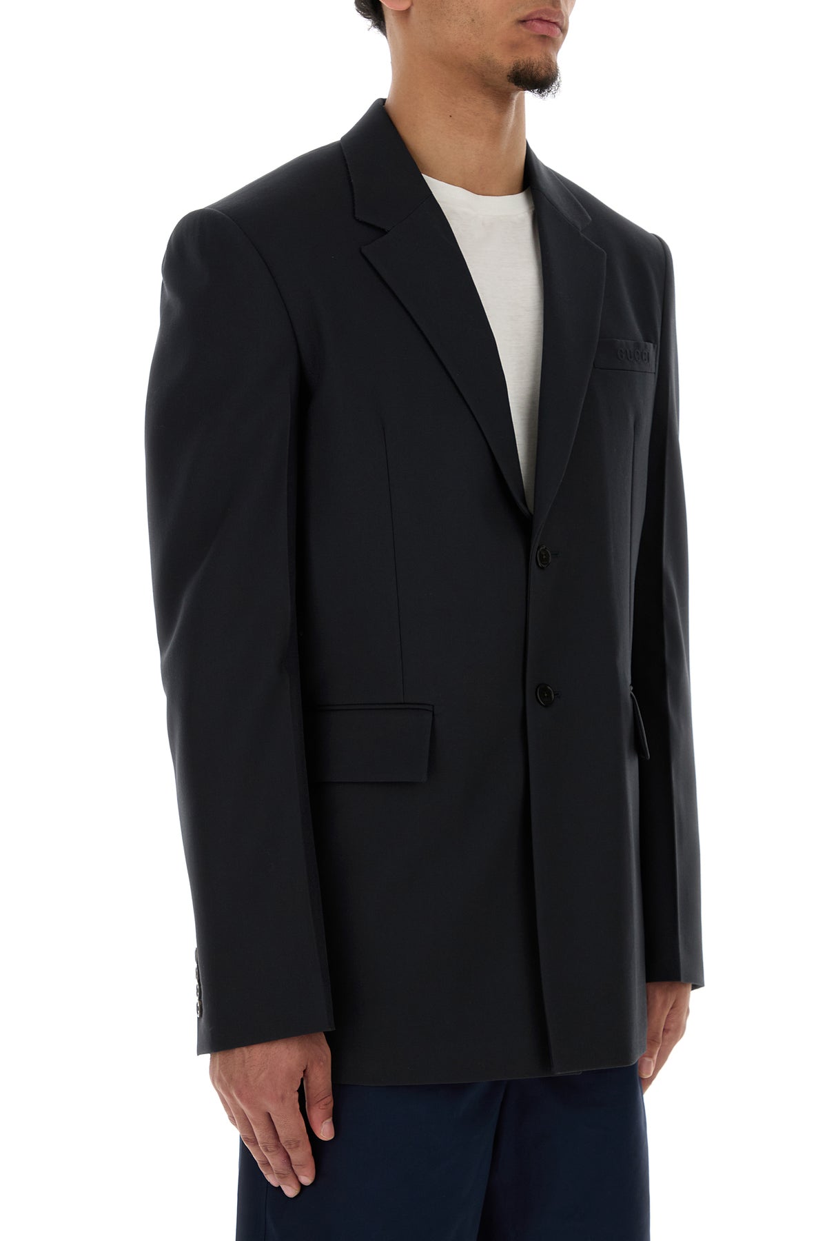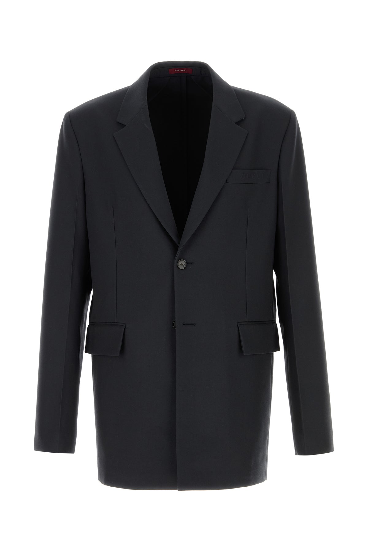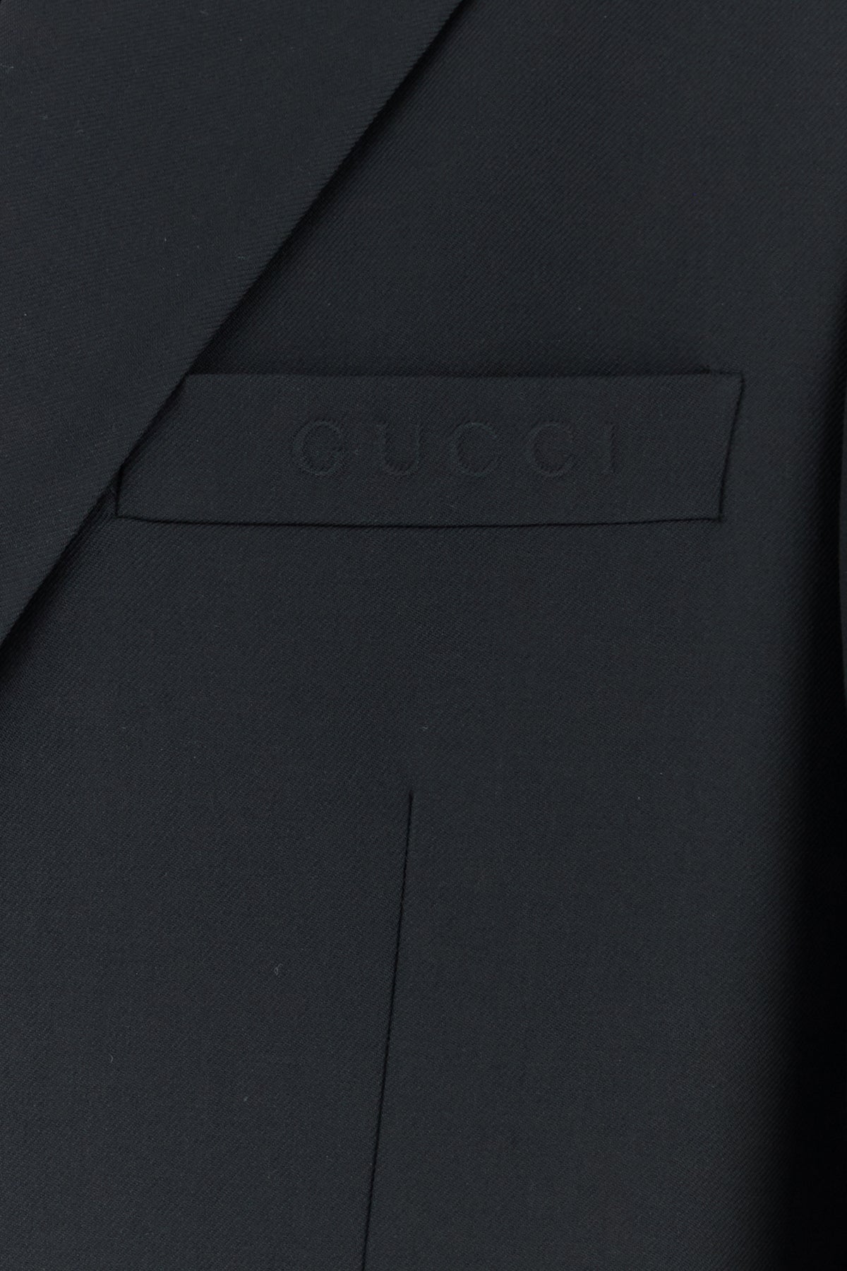 Giacca realizzata in twill di pura lana caratterizzata da motivo Gucci in rilievo sul petto.