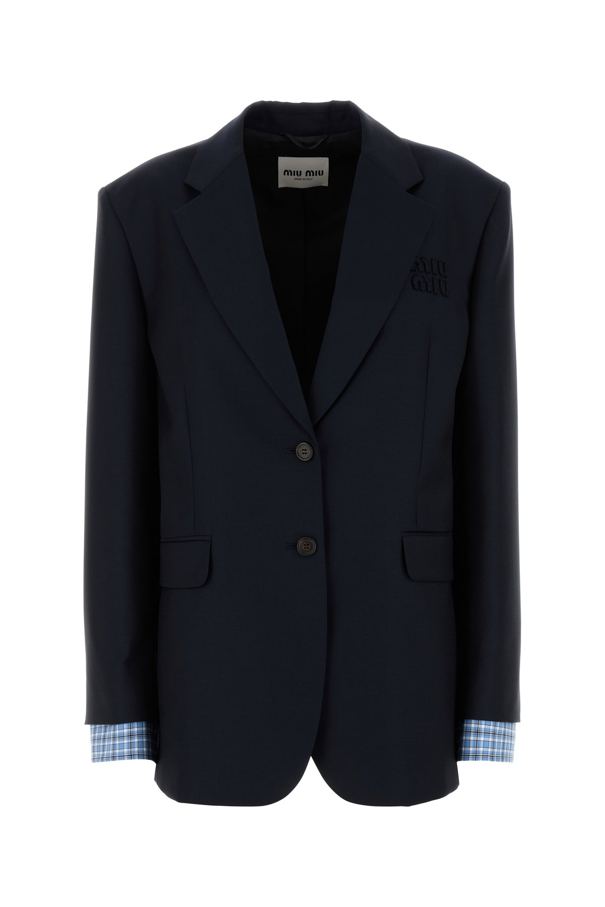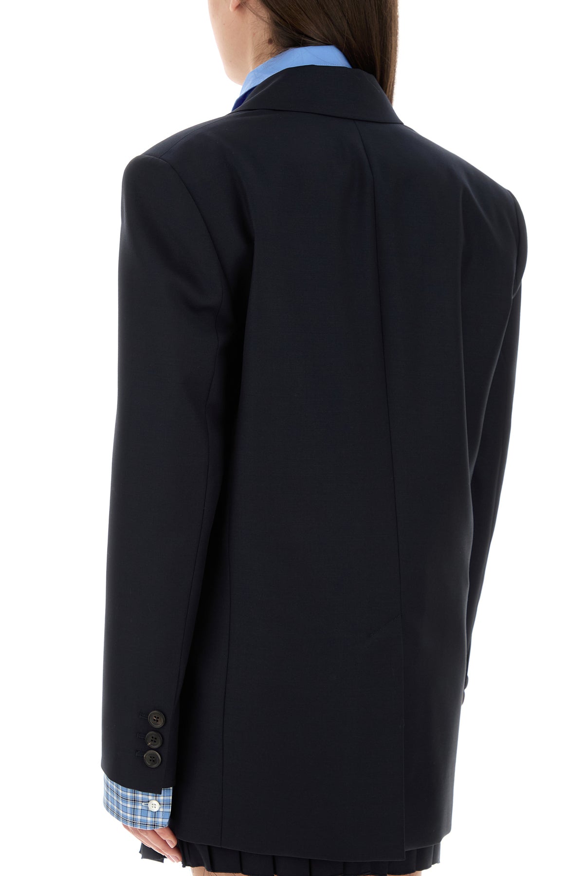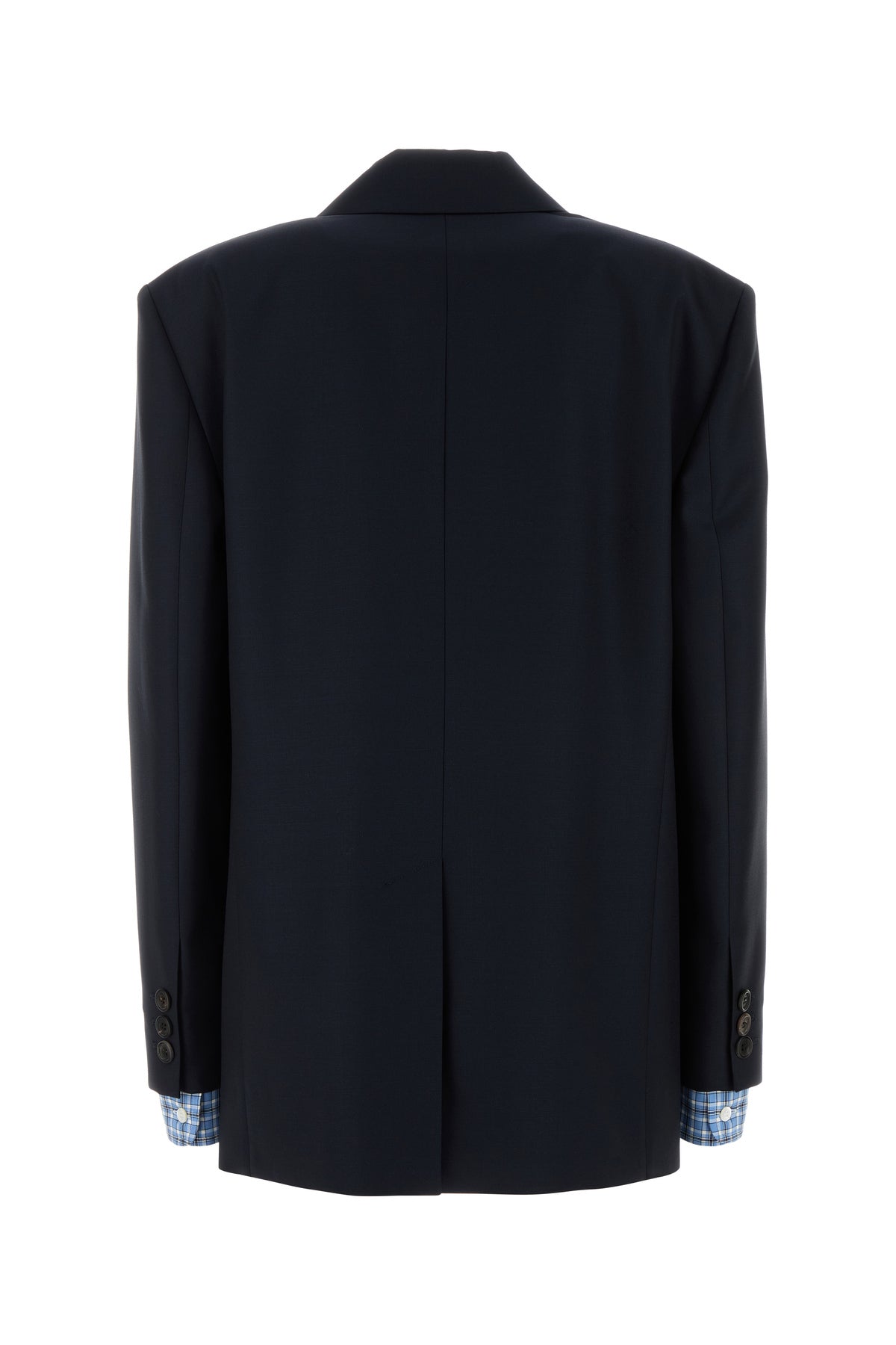 Giacca oversize realizzata in pura lana vergine con inserti in popeline a motivo tartan sui polsini arricchita da applicazione logata tonale sul petto.